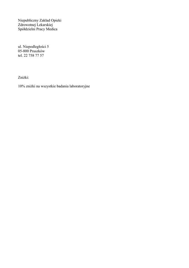 Niepubliczny Zakład Opieki Zdrowotnej Lekarskiej Spółdzielni Pracy Medica ul. Niepodległości 5 05-800 Pruszków tel. 22 758 77 57 Zniżki: 10% zniżki na wszystkie badania laboratoryjne