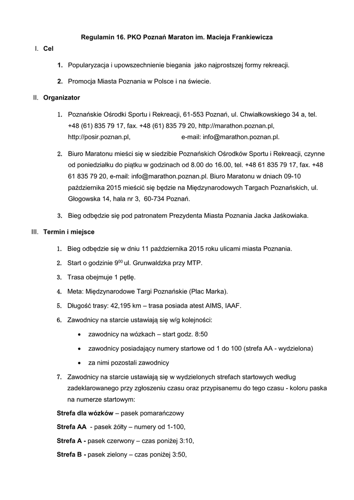 Regulamin 16. PKO Poznań Maraton im. Macieja Frankiewicza I. Cel 1. Popularyzacja i upowszechnienie biegania jako najprostszej formy rekreacji. 2. Promocja Miasta Poznania w Polsce i na świecie. II. Organizator 1. Poznańskie Ośrodki Sportu i Rekreacji, 61-553 Poznań, ul. Chwiałkowskiego 34 a, tel. +48 (61) 835 79 17, fax. +48 (61) 835 79 20, http://marathon.poznan.pl, http://posir.poznan.pl, e-mail: [email protected]. 2. Biuro Maratonu mieści się w siedzibie Poznańskich Ośrodków Sportu i Rekreacji, czynne od poniedziałku do piątku w godzinach od 8.00 do 16.00, tel. +48 61 835 79 17, fax. +48 61 835 79 20, e-mail: [email protected]. Biuro Maratonu w dniach 09-10 października 2015 mieścić się będzie na Międzynarodowych Targach Poznańskich, ul. Głogowska 14, hala nr 3, 60-734 Poznań. 3. Bieg odbędzie się pod patronatem Prezydenta Miasta Poznania Jacka Jaśkowiaka. III. Termin i miejsce 1. Bieg odbędzie się w dniu 11 października 2015 roku ulicami miasta Poznania. 2. Start o godzinie 900 ul. Grunwaldzka przy MTP. 3. Trasa obejmuje 1 pętlę. 4. Meta: Międzynarodowe Targi Poznańskie (Plac Marka). 5. Długość trasy: 42,195 km – trasa posiada atest AIMS, IAAF. 6. Zawodnicy na starcie ustawiają się w/g kolejności: zawodnicy na wózkach – start godz. 8:50 zawodnicy posiadający numery startowe od 1 do 100 (strefa AA - wydzielona) za nimi pozostali zawodnicy 7. Zawodnicy na starcie ustawiają się w wydzielonych strefach startowych według zadeklarowanego przy zgłoszeniu czasu oraz przypisanemu do tego czasu - koloru paska na numerze startowym: Strefa dla wózków – pasek pomarańczowy Strefa AA - pasek żółty – numery od 1-100, Strefa A - pasek czerwony – czas poniżej 3:10, Strefa B - pasek zielony – czas poniżej 3:50, Strefa C – pasek niebieski – czas poniżej 4:10, Strefa D – pasek fioletowy – czas powyżej 4:20, Strefa E - pasek brązowy – czas powyżej 4:40 Przydział do konkretnej strefy następuje według czasu, który biegacz zadeklarował przy rejestracji, jako zamierzony do osiągnięcia na mecie maratonu. Raz wybrana strefa czasowa nie podlega zamianie. 8. Trasa będzie posiadała oznaczony każdy kilometr. 9. Pomiar czasu w systemie chipów na sznurowadle buta – oficjalnym czasem jest czas brutto. IV. Punkty odżywiania, odświeżania, kontrolne oraz limit czasu 1. Punkty odżywiania będą znajdowały się co ok. 5 km. 2. Stoły na punktach odżywczych rozstawione będą w kolejności: pierwszy – pojemnik z wodą do gąbek, drugi – banany i czekolada, trzeci – woda, czwarty – napój izotoniczny. 3. Na trasie będą znajdowały się punkty kontrolne pomiaru czasu: start, 5 km, 10 km, 15 km, 20 km, 21,975km, 25 km, 30 km, 35 km, 40 km, meta. 4. Obsługa punktów będzie spisywała numery startowe zawodników skracających trasę. 5. Zawodnicy skracający lub zmieniający trasę zostaną zdyskwalifikowani. 6. Zawodników obowiązuje limit czasu wynoszący 6 godzin. 7. Trasa maratonu zamknięta jest dla ruchu kołowego do godziny 1515. 8. Zawodnicy, którzy nie ukończą biegu do godziny 1515 zobowiązani są do przerwania biegu i dojechania do mety mikrobusem z napisem "Koniec Maratonu". V. Uczestnictwo 1. W 16. PKO Poznań Maraton, prawo startu mają osoby, które do dnia 11 października 2015 roku ukończą 18 lat. 2. Wszyscy zawodnicy startujący w 16. PKO Poznań Maraton muszą zostać zweryfikowani w Biurze Maratonu w dniach 09-10.10.2015. 3. Odbieranie pakietów i numerów startowych odbywać się będzie na podstawie karty startowej. Karta startowa znajduje się na indywidualnym profilu zawodnika w zakładce „pliki do pobrania“. Należy ją wydrukować, podpisać zamieszczoną na niej zgodę startu na własną odpowiedzialność i zabrać ze sobą w celu weryfikacji. Karta startowa bez wydrukowanej treści oświadczenia jest nieważna. Jeżeli ktoś nie możesz osobiście odebrać pakietu startowego, wystarczy, że przekaże kartę osobie która odbiera pakiet za niego. Osoba odbierająca numer startowy w imieniu innej osoby musi posiadać podpisaną przez tę osobę jego kartę startową. Osoby odbierające swój pakiet startowy osobiście, które nie będą ze sobą miały w/w karty startowej muszą posiadać dokument tożsamości ze zdjęciem. VI. Klasyfikacje W 16. PKO Poznań Maraton będzie prowadzona następująca klasyfikacja: 1. Generalna – kobiet, mężczyzn. 2. Wiekowa kobiet i mężczyzn: 18-29, 30-39, 40-44, 45-49, 50-54, 55-59, 60-64, 65-69, 7074, 75 i więcej lat. 3. Najlepsza poznanianka i najlepszy poznaniak. 4. Najstarsza uczestniczka i najstarszy uczestnik. 5. Generalna – zawodniczek i zawodników niepełnosprawnych na wózkach z napędem bezpośrednim - typ I i z napędem pośrednim (łańcuchowym) – typ II. 6. Klasyfikacja wiekowa nie dotyczy zawodników na wózkach. VII. Zgłoszenia/Opłaty 1. Termin zgłoszeń upływa 1.10.2015 lub po osiągnięciu limitu zgłoszeń. Po 01.10.2015 zgłoszenia nie będą przyjmowane niezależnie od limitu osiągniętych zgłoszeń. 2. Prawo bezpłatnego startu pod warunkiem zgłoszenia się do 01.10.2015 mają: zawodnicy, którzy ukończyli 15 maratonów w Poznaniu – „Poznań Maraton”, zawodnicy na wózkach, 3. Prawo do 50% zniżki od opłaty za pakiet startowy mają: zawodnicy i zawodniczki, którzy mają 60 i więcej lat. 4. Prawo do 25% zniżki od opłaty za pakiet startowy mają: posiadacze karty: „Poznań PRO Rodzina - Karta Rodziny Dużej“ 5. Organizator ustala limit zawodników na 10 000 osób. 6. Zgłoszenia przyjmowane są w Biurze Organizacyjnym oraz przez formularz zgłoszeniowy na stronie http://marathon.poznan.pl/pl/maraton/zgloszenia. 7. Za zgłoszenie uważa się dostarczenie wypełnionego przez uczestnika formularza zgłoszenia i wpływu na konto organizatora opłaty za pakiet startowy. 8. Organizator ustala następujące terminy oraz opłaty zgłoszeń: zgłoszenia do 31 sierpnia – opłata 100 zł zgłoszenia od 1 do 