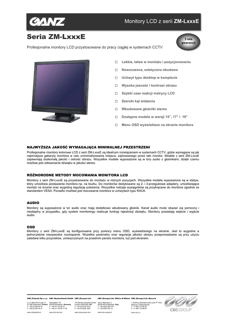Monitory LCD z serii ZM-LxxxE Seria ZM-LxxxE 3 lata gwarancji Profesjonalne monitory LCD przystosowane do pracy ciągłej w systemach CCTV Lekkie, łatwe w montażu i pozycjonowaniu Nowoczesna, estetyczna obudowa Uchwyt typu desktop w komplecie Wysoka jasność i kontrast obrazu Szybki czas reakcji matrycy LCD Szeroki kąt widzenia Wbudowane głośniki stereo Dostępne modele w wersji 15”, 17” i 19” Menu OSD wyświetlane na ekranie monitora NAJWYŻSZA JAKOŚĆ WYMAGAJĄCA MINIMALNEJ PRZESTRZENI Profesjonalne monitory kolorowe LCD z serii ZM-LxxxE są idealnym rozwiązaniem w systemach CCTV, gdzie wymagane są jak najmniejsze gabaryty monitora w celu zminimalizowania miejsca, zajmowanego przez taki monitor. Modele z serii ZM-LxxxE zapewniają doskonałą jakość i ostrość obrazu. Wszystkie modele wyposażone są w tory audio z głośnikami, dzięki czemu możliwe jest odtwarzanie dźwięku w jakości stereo. RÓŻNORODNE METODY MOCOWANIA MONITORA LCD Monitory z serii ZM-LxxxE są przystosowane do montażu w różnych pozycjach. Wszystkie modele wyposażone są w statyw, który umożliwia postawienie monitora np. na biurku. Do monitorów dedykowane są 2- i 3-przegubowe adaptery, umożliwiające montaż na ścianie oraz wygodną regulację położenia. Wszystkie rodzaje wysięgników są przykręcane do monitora zgodnie ze standardem VESA. Ponadto możliwe jest mocowanie monitora w uchwytach typu RACK. AUDIO Monitory są wyposażone w tor audio oraz mają dodatkowo wbudowany głośnik. Kanał audio może okazać się pomocny i niezbędny w przypadku, gdy system monitoringu realizuje funkcję rejestracji dźwięku. Monitory posiadają wejście i wyjście audio. OSD Monitory z serii ZM-LxxxE są konfigurowane przy pomocy menu OSD, wyświetlanego na ekranie. Jest to wygodne a jednocześnie niezawodne rozwiązanie. Wszelkie parametry oraz regulacje jakości obrazu przeprowadzane są przy użyciu zaledwie kilku przycisków, umieszczonych na przednim panelu monitora, tuż pod ekranem. CBC (Poland) Sp z o.o. CBC (Deutschland) GmbH CBC (Europe) Ltd. CBC (Europe) Ltd. Ufficio di Milano CBC (Europe) Ltd. Moscow ul. G. Morcinka 5 paw. 6 01-496 Warszawa, Poland T: +48 22 638 44 40 F: +48 22 638 45 41 Hansaallee 191 40549 Dűsseldorf, Germany T: +49 211 53 06 70 F: +49 211 53 06 71 80 7/8 Garrick Industrial Centre London NW9 6aQ, UK T: +44 20 8732 3310 F: +44 20 8202 3387 Via E. Majorana, 2 20054 Nova Milanese, Italy T: +39 0362 365 079 F: +39 0362 400 12 7, Bolshoy Strochenovsky Lane 5th Floor Moscow 115054,Russia T: +7 495 710 88 83 F: +7 495 710 88 84 www.cbcpoland.pl www.cbc-de.com www.cbceurope.com www.cbc-europe.it www.cbc.ru Monitory LCD z serii ZM-LxxxE PARAMETRY TECHNICZNE Model: System video Matryca: Rozdzielczość: Wielkość plamki: Współczynnik kontrastu: Jasność: Czas reakcji (Tr/Tf): ZM-L215E ZM-L217E ZM-L219E PAL / NTSC / Auto PAL / NTSC / Auto PAL / NTSC / Auto 15” TFT LCD 17” TFT LCD 19” TFT LCD 500 TVL (1024 x 768) 500 TVL (1280 x 1024) 500 TVL (1280 x 1024) 0.297 x 0.297 mm 0.264 x 0.264 mm 0.294 x 0.294 mm 500:1 800:1 800:1 250 cd/m² 300 cd/m² 300 cd/m² 8 ms 1/4 ms 3.6/1.4 ms Ilość kolorów: 16,2 miliona 16,7 miliona 16,7 miliona Kąt widzenia: 70° poziomo / 65° pionowo 85° poziomo / 80° pionowo 80° poziomo / 80° pionowo 50.000 godzin 40.000 godzin 50.000 godzin Minimalny czas życia matrycy TFT: Tryby wyświetlania: Menu OSD Video / S-Video / VGA VGA: Jasność, Kontrast, Pozycja poziom / pion, Zegar, Faza, Temperatura barwowa, Kolor użytkownika R / G / B, Pozycja OSD poziom / pion, Głośność, Język, Powrót. Video: Kolor, Jasność, Kontrast, Ostrość, Głośność, Język, Temperatura barwowa, Powrót Wejścia video: Video BNC (1.0 Vp-p 75Ω), VGA 15pin, Audio, DVI (opcjonalnie) Wyjścia video: Video BNC (1.0 Vp-p 75Ω), S-Video, Audio Głośnik: 1W Auto-włączenie po zaniku zasilania: Tak Wyświetlanie bez przeplotu: Tak Filtr 3D „comb” NTSC / PAL Warunki pracy: Temperatura: 0° - 40°C / Wilgotność: 10% - 85% Wymiary: Masa: 364 x 316 x 170 mm 386 x 388 x 170 mm 424 x 419 x 170 mm 4kg 5,2 kg 6,1kg Bezpieczeństwo: FCC, CE(EMC/LVD), UL, BSMI, CCC Zasilanie: AC 110/240 V Pobór mocy: 30 W maks. 40 W maks. CBC (Poland) Sp z o.o. CBC (Deutschland) GmbH CBC (Europe) Ltd. CBC (Europe) Ltd. Ufficio di Milano CBC (Europe) Ltd. Moscow ul. G. Morcinka 5 paw. 6 01-496 Warszawa, Poland T: +48 22 638 44 40 F: +48 22 638 45 41 Hansaallee 191 40549 Dűsseldorf, Germany T: +49 211 53 06 70 F: +49 211 53 06 71 80 7/8 Garrick Industrial Centre London NW9 6aQ, UK T: +44 20 8732 3310 F: +44 20 8202 3387 Via E. Majorana, 2 20054 Nova Milanese, Italy T: +39 0362 365 079 F: +39 0362 400 12 7, Bolshoy Strochenovsky Lane 5th Floor Moscow 115054,Russia T: +7 495 710 88 83 F: +7 495 710 88 84 www.cbcpoland.pl www.cbc-de.com www.cbceurope.com www.cbc-europe.it www.cbc.ru 50 W maks.