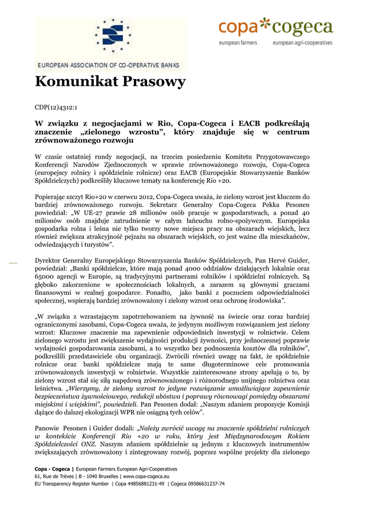 Komunikat Prasowy CDP(12)4312:1 W związku z negocjacjami w Rio, Copa-Cogeca i EACB podkreś lają znaczenie „zielonego wzrostu”, który znajduje się w centrum zrównoważonego rozwoju W czasie ostatniej rundy negocjacji, na trzecim p osiedzeniu Komitetu Przygotowawczego Konferencji Narodów Zjednoczonych w sp rawie zrównoważonego rozwoju, Cop a-Cogeca (europ ejscy rolnicy i sp ółdzielnie rolnicze) oraz EACB (Europ ejskie Stowarzyszenie Banków Spółdzielczych) podkreśliły kluczowe tematy na konferencję Rio +20. Popierając szczyt Rio+20 w czerwcu 2012, Copa-Cogeca uważa, że zielony wzrost jest kluczem do bardziej zrównoważonego rozwoju. Sekretarz Generalny Cop a-Cogeca Pekka Pesonen powiedział: „W UE-27 p rawie 28 milionów osób p racuje w gosp odarstwach, a p onad 40 milionów osób znajduje zatrudnienie w całym łańcuchu rolno-sp ożywczym. Europ ejska gosp odarka rolna i leśna nie tylko tworzy nowe miejsca p racy na obszarach wiejskich, lecz również zwiększa atrakcyjność pejzażu na obszarach wiejskich, co jest ważne dla mieszkańców, odwiedzających i turystów”. Dyrektor Generalny Europ ejskiego Stowarzyszenia Banków Sp ółdzielczych, Pan Hervé Guider, powiedział: „Banki sp ółdzielcze, które mają p onad 4000 oddziałów działających lokalnie oraz 65000 agencji w Europ ie, są tradycyjnymi p artnerami rolników i sp ółdzielni rolniczych. Są głęboko zakorzenione w sp ołecznościach lokalnych, a zarazem są głównymi graczami finansowymi w realnej gosp odarce. Ponadto, jako banki z p oczuciem odp owiedzialności społecznej, wspierają bardziej zrównoważony i zielony wzrost oraz ochronę środowiska”. „W związku z wzrastającym zap otrzebowaniem na żywność na świecie oraz coraz bardziej ograniczonymi zasobami, Copa-Cogeca uważa, że jedynym możliwym rozwiązaniem jest zielony wzrost: Kluczowe znaczenie ma zap ewnienie odp owiednich inwestycji w rolnictwie. Celem zielonego wzrostu jest zwiększenie wydajności p rodukcji żywności, p rzy jednoczesnej p op rawie wydajności gosp odarowania zasobami, a to wszystko bez p odnoszenia kosztów dla rolników”, p odkreślili p rzedstawiciele obu organizacji. Zwrócili również uwagę na fakt, że sp ółdzielnie rolnicze oraz banki sp ółdzielcze mają te same długoterminowe cele p romowania zrównoważonych inwestycji w rolnictwie. Wszystkie zainteresowane strony ap elują o to, by zielony wzrost stał się siłą nap ędową zrównoważonego i różnorodnego unijnego rolnictwa oraz leśnictwa. „Wierzymy, że zielony wzrost to jedyne rozwiązanie umożliwiające zapewnienie bezpieczeństwa żywnościowego, redukcji ubóstwa i poprawy równowagi pomiędzy obszarami miejskimi i wiejskimi”, powiedzieli. Pan Pesonen dodał: „Naszym zdaniem p rop ozycje Komisji dążące do dalszej ekologizacji WPR nie osiągną tych celów”. Panowie Pesonen i Guider dodali: „Należy zwrócić uwagę na znaczenie spółdzielni rolniczych w kontekście Konferencji Rio +20 w roku, któ ry jest Międzynarodowym Rokiem Spó łdzielczości ONZ. Naszym zdaniem sp ółdzielnie są jednym z kluczowych instrumentów zwiększających zrównoważony i zintegrowany rozwój, p op rzez wsp ólne p rojekty dla zielonego Copa - Cogeca | European Farmers European Agri-Cooperatives 61, Rue de Trèves | B - 1040 Bruxelles | www.copa-cogeca.eu EU Transparency Register Number | Copa 44856881231-49 | Cogeca 09586631237-74 wzrostu w obszarach środowiskowym, ekonomicznym i sp ołecznym, ze szczególnym naciskiem na społeczności wiejskie”. Copa-Cogeca oraz EACB są p rzekonane, że konferencja ONZ nt. zrównoważonego rozwoju w Brazylii w czerwcu 2012 jest kamieniem milowym na drodze do budowy zrównoważonego społeczeństwa na świecie, ponieważ zachęca ona do zielonego wzrostu. Dane kontaktowe EACB: Dyrektor Generalny: Herve GUIDER (Tel : +32 2 286 98 40), [email protected] Kierownik Działu badań i komunikacji: Elisa BEVILACQUA (Tel +32 2 286 98 42), [email protected] O EACB: Europ ejskie Stowarzyszenie Banków Sp ółdzielczych (EACB) jest głosem banków sp ółdzielczych od roku 1970. Reprezentuje, promuje i chroni wspólne interesy 28 instytucji członkowskich oraz ogółu banków sp ółdzielczych. Banki sp ółdzielcze tworzą zdecentralizowane sieci p odlegające p rzep isom w sp rawie banków oraz p rzep isom w sp rawie sp ółdzielni. Banki sp ółdzielcze, które mają 4000 oddziałów lokalnych oraz 65000 agencji, odgrywają znaczącą rolę w systemie finansowym i gosp odarczym. Obsługują p onad 181 milionów klientów, głównie konsumentów indywidualnych, MŚP i sp ołeczności lokalne. Europ ejskie banki sp ółdzielcze zrzeszają 50 milionów członków, zatrudniają 777 500 p racowników, a ich średni udział rynku wynosi 20%. Ich odp orność na kryzys sprawiła, ze stały się kluczową siła napędową uzdrowienia gospodarki. Strona internetowa: www.eacb.eu Kontakt do Copa-Cogeca: Press Officer Amanda Cheesley (Tel. +32474840836), [email protected] Senior Policy Advisor Antonia Andugar (Tel.+32 2 287 2739); [email protected] Copa-Cogeca to zjednoczony głos rolników i ich spółdzielni w UE. Wspólnie zapewniają stabilność, innowacyjność i konkurencyjność rolnictwa europejskiego, gwarantując bezpieczeństwo żywnościowe milionom ludzi w Europie. Copa reprezentuje ponad 13 milionów rolników i ich rodzin, podczas gdy Cogeca reprezentuje interesy 38,000 spółdzielni rolniczych. Zrzeszają 72 organizacji z państw członkowskich UE.www.copa-cogeca.eu