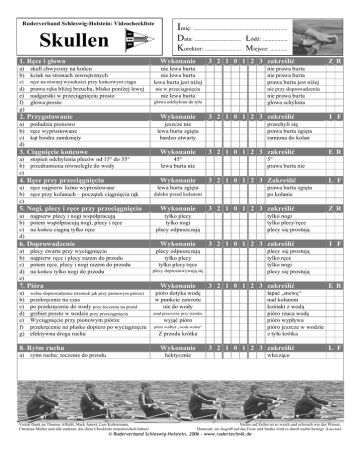 Ruderverband Schleswig-Holstein: Videocheckliste Skullen 1. Ręce i głowa Data: ................................ Łódź: ................. Korektor: ......................... Miejsce: ............ Wykonanie a) skull chwycony na końcu b) kciuk na stronach zewnętrznych c) Imię: ................................................................. ręce na równej wysokości przy końcowym ciągu d) prawa ręka bliżej brzucha, blisko poniżej lewej e) nadgarstki w przeciągnięciu prosto f) głowa prosto g) 2. Przygotowanie nie prawa burta nie prawa burta prawa burta jest niżej nie w przeciągnięciu nie przy doprowadzeniu nie lewa burta Wykonanie a) stopień odchylenia pleców od 15° do 35° b) przedramiona równolegle do wody c) 45° lewa burta nie 4. Ręce przy przeciągnięciu 5. Nogi, plecy i ręce przy przeciągnięciu a) najpierw plecy i nogi współpracują b) potem współpracują nogi, plecy i ręce c) na końcu ciągną tylko ręce d) 6. Doprowadzenie 7. Pióra przekręcenie na czas po przekręceniu do wody przy toczeniu na przód grzbiet prosto w wodzie przy przeciągnięciu Wyciągnięcie przy pionowym piórze przekręcenie na płasko dopiero po wyciągnięciu efektywna droga ruchu 8. Rytm ruchu a) 3 2 1 0 1 2 3 Zakreślić lewa burta zgięta Wykonanie 3 2 1 0 1 2 3 zakreślić tylko plecy tylko nogi plecy odpuszczają ZR tylko nogi tylko plecy/ręce plecy się prostują 3 2 1 0 1 2 3 zakreślić plecy odpuszczają tylko plecy tylko plecy/ręce I F plecy się prostują tylko ręce tylko nogi plecy się prostują plecy doprostowywują się 3 2 1 0 1 2 3 zakreślić pióro dotyka wodę w punkcie zawrotu nie do wody ER łapać „mewę“ nad kolanem kontakt z wodą pióro rzuca wodę pióro wypływa pióro jeszcze w wodzie z tyłu krótka prąd przeciwny przy trzonku= wyjąć pióro pióro wzdłuż „woda wolna“ Z przodu krótka Wykonanie rytm ruchu: toczenie do przodu L F prawa burta zgięta po kolanie daleko przed kolanem Wykonanie wolne doprowadzenie (trzonek jak przy pionowym piórze) ER 5° prawa burta nie Wykonanie plecy zwarte przy wyciągnięciu najpierw ręce i plecy razem do przodu potem ręce, plecy i nogi razem do przodu na końcu tylko nogi do przodu I F przechyli się prawa burta zgięta ramiona do kolan 3 2 1 0 1 2 3 zakreślić Wykonanie a) ręce najpierw luźno wyprostowane b) ręce przy kolanach – początek ciągnięcia rąk c) a) b) c) d) e) f) g) 3 2 1 0 1 2 3 zakreślić jeszcze nie lewa burta zgięta bardzo otwarty 3. Ciągnięcie końcowe ZR nie prawa burta głowa schylona głowa odchylona do tyłu Wykonanie a) podudzia pionowo b) ręce wyprostowane c) kąt biodra zamknięty d) a) b) c) d) e) 3 2 1 0 1 2 3 zakreślić nie lewa burta nie lewa burta lewa burta jest niżej 3 2 1 0 1 2 3 zakreślić hektycznie L F wlecząco = = = Vielen Dank an Thomas Affeldt, Mark Amort, Lars Koltermann, Christian Müller und alle anderen, die diese Checkliste mitentwickelt haben! Nichts auf Erden ist so weich und schwach wie das Wasser. Dennoch, im Angriff auf das Feste und Starke wird es durch nichts besiegt. (Lao-tse) © Ruderverband Schleswig-Holstein, 2006 – www.rudertechnik.de
