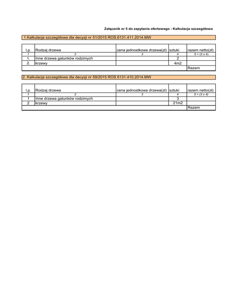 Załącznik nr 5 do zapytania ofertowego - Kalkulacja szczegółowa 1.Kalkulacja szczegółowa dla decyzji nr 51/2015 ROŚ.6131.411.2014.MW l.p. 1. 2. cena jednostkowa drzewa(zł) sztuki Rodzaj drzewa 1 2 3 Inne drzewa gatunków rodzimych krzewy 4 razem netto(zł) 5 = (3 x 4) 2 4m2 Razem 2. Kalkulacja szczegółowa dla decyzji nr 59/2015 ROŚ 6131.410.2014.MW l.p. 1 1 2 cena jednostkowa drzewa(zł) sztuki Rodzaj drzewa 2 Inne drzewa gatunków rodzimych krzewy 3 4 razem netto(zł) 5 = (3 x 4) 3 21m2 Razem