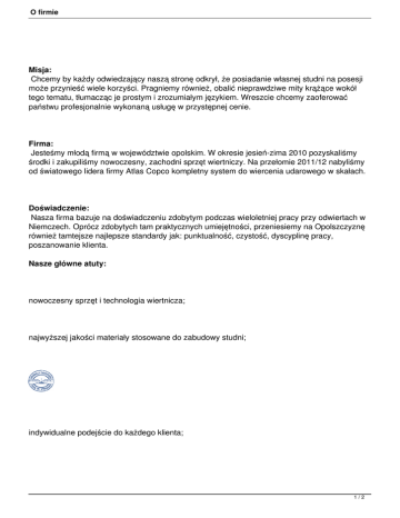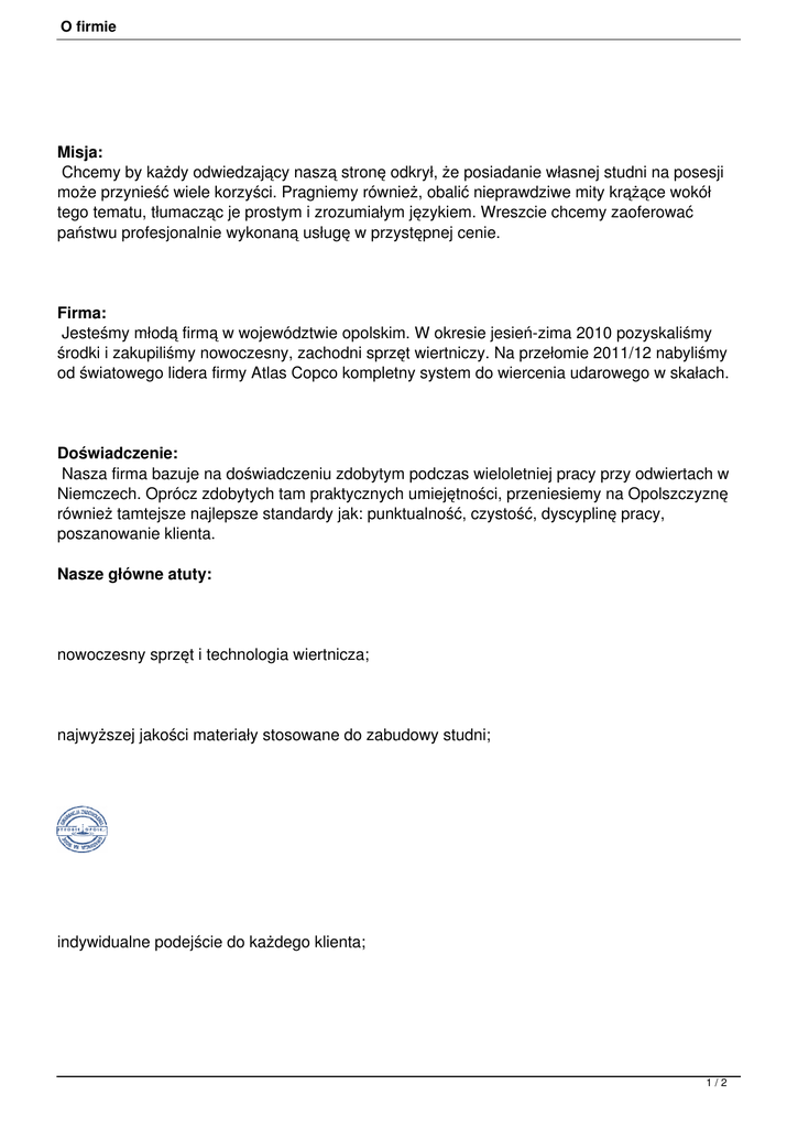 O firmie Misja: Chcemy by każdy odwiedzający naszą stronę odkrył, że posiadanie własnej studni na posesji może przynieść wiele korzyści. Pragniemy również, obalić nieprawdziwe mity krążące wokół tego tematu, tłumacząc je prostym i zrozumiałym językiem. Wreszcie chcemy zaoferować państwu profesjonalnie wykonaną usługę w przystępnej cenie. Firma: Jesteśmy młodą firmą w województwie opolskim. W okresie jesień-zima 2010 pozyskaliśmy środki i zakupiliśmy nowoczesny, zachodni sprzęt wiertniczy. Na przełomie 2011/12 nabyliśmy od światowego lidera firmy Atlas Copco kompletny system do wiercenia udarowego w skałach. Doświadczenie: Nasza firma bazuje na doświadczeniu zdobytym podczas wieloletniej pracy przy odwiertach w Niemczech. Oprócz zdobytych tam praktycznych umiejętności, przeniesiemy na Opolszczyznę również tamtejsze najlepsze standardy jak: punktualność, czystość, dyscyplinę pracy, poszanowanie klienta. Nasze główne atuty: nowoczesny sprzęt i technologia wiertnicza; najwyższej jakości materiały stosowane do zabudowy studni; indywidualne podejście do każdego klienta; 1/2 O firmie rozsądnie skalkulowane ceny usług; 2/2
