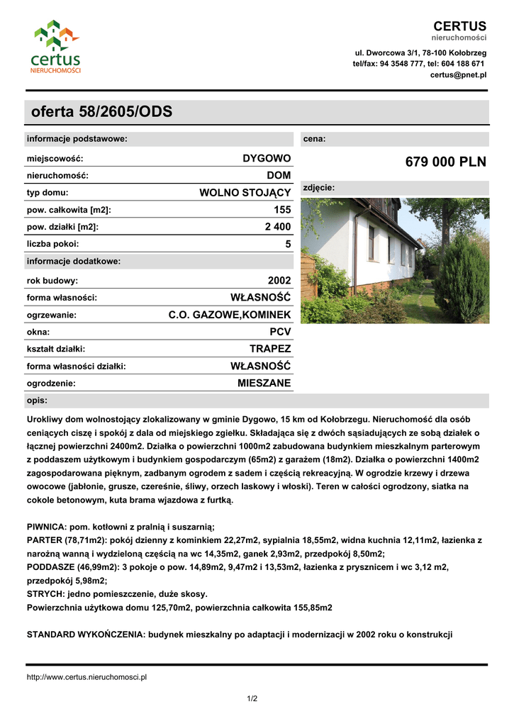 CERTUS nieruchomości ul. Dworcowa 3/1, 78-100 Kołobrzeg tel/fax: 94 3548 777, tel: 604 188 671 [email protected] oferta 58/2605/ODS informacje podstawowe: cena: DYGOWO miejscowość: typ domu: 679 000 PLN DOM nieruchomość: WOLNO STOJĄCY zdjęcie: 155 pow. całkowita [m2]: 2 400 pow. działki [m2]: 5 liczba pokoi: informacje dodatkowe: 2002 rok budowy: WŁASNOŚĆ forma własności: ogrzewanie: C.O. GAZOWE,KOMINEK PCV okna: TRAPEZ kształt działki: forma własności działki: WŁASNOŚĆ ogrodzenie: MIESZANE opis: Urokliwy dom wolnostojący zlokalizowany w gminie Dygowo, 15 km od Kołobrzegu. Nieruchomość dla osób ceniących ciszę i spokój z dala od miejskiego zgiełku. Składająca się z dwóch sąsiadujących ze sobą działek o łącznej powierzchni 2400m2. Działka o powierzchni 1000m2 zabudowana budynkiem mieszkalnym parterowym z poddaszem użytkowym i budynkiem gospodarczym (65m2) z garażem (18m2). Działka o powierzchni 1400m2 zagospodarowana pięknym, zadbanym ogrodem z sadem i częścią rekreacyjną. W ogrodzie krzewy i drzewa owocowe (jabłonie, grusze, czereśnie, śliwy, orzech laskowy i włoski). Teren w całości ogrodzony, siatka na cokole betonowym, kuta brama wjazdowa z furtką. PIWNICA: pom. kotłowni z pralnią i suszarnią; PARTER (78,71m2): pokój dzienny z kominkiem 22,27m2, sypialnia 18,55m2, widna kuchnia 12,11m2, łazienka z narożną wanną i wydzieloną częścią na wc 14,35m2, ganek 2,93m2, przedpokój 8,50m2; PODDASZE (46,99m2): 3 pokoje o pow. 14,89m2, 9,47m2 i 13,53m2, łazienka z prysznicem i wc 3,12 m2, przedpokój 5,98m2; STRYCH: jedno pomieszczenie, duże skosy. Powierzchnia użytkowa domu 125,70m2, powierzchnia całkowita 155,85m2 STANDARD WYKOŃCZENIA: budynek mieszkalny po adaptacji i modernizacji w 2002 roku o konstrukcji http://www.certus.nieruchomosci.pl 1/2 CERTUS nieruchomości ul. Dworcowa 3/1, 78-100 Kołobrzeg tel/fax: 94 3548 777, tel: 604 188 671 [email protected] tradycyjnej, murowany z czerwonej cegły, częściowo podpiwniczony, docieplony styropianem, stropy i schody na piętro drewniane, dach o konstrukcji drewnianej, dwuspadowy kryty dachówką ceramiczną. Na podłodze deski i terakota, na ścianach tynk gipsowy, w łazienkach glazura i terakota, stolarka okienna PCV. Ogrzewanie własne gazowe piec c.o i c.w., zasobnik wody 120 litrów, instalacja miedziana, grzejniki panelowe, dodatkowo w salonie kominek z rozprowadzeniem ciepła. Budynek gospodarczy przedwojenny, murowany z cegły, dach kryty dachówką z garażem dobudowanym w 2002r. Media / instalacje: wodociągowa, kanalizacyjna, gazowa, elektryczna, telefoniczna oraz internet. LOKALIZACJA: gmina Dygowo, cicha, spokojna okolica, niewielka wieś licząca kilkuset mieszkańców zlokalizowana 3 km od Dygowa i 15 km od Kołobrzegu. Termin wydania nieruchomości do uzgodnienia. W celu uzyskania szczegółowych informacji o ofercie prosimy o kontakt telefoniczny, bądź mailowy http://www.certus.nieruchomosci.pl 2/2