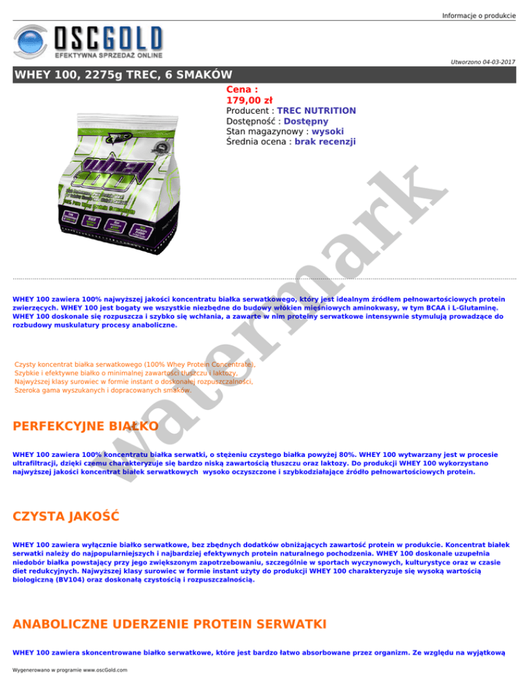 Informacje o produkcie Utworzono 04-03-2017 WHEY 100, 2275g TREC, 6 SMAKÓW Cena : 179,00 zł er m ar k Producent : TREC NUTRITION Dostępność : Dostępny Stan magazynowy : wysoki Średnia ocena : brak recenzji WHEY 100 zawiera 100% najwyższej jakości koncentratu białka serwatkowego, który jest idealnym źródłem pełnowartościowych protein zwierzęcych. WHEY 100 jest bogaty we wszystkie niezbędne do budowy włókien mięśniowych aminokwasy, w tym BCAA i L-Glutaminę. WHEY 100 doskonale się rozpuszcza i szybko się wchłania, a zawarte w nim proteiny serwatkowe intensywnie stymulują prowadzące do rozbudowy muskulatury procesy anaboliczne. at Czysty koncentrat białka serwatkowego (100% Whey Protein Concentrate), Szybkie i efektywne białko o minimalnej zawartości tłuszczu i laktozy, Najwyższej klasy surowiec w formie instant o doskonałej rozpuszczalności, Szeroka gama wyszukanych i dopracowanych smaków. w PERFEKCYJNE BIAŁKO WHEY 100 zawiera 100% koncentratu białka serwatki, o stężeniu czystego białka powyżej 80%. WHEY 100 wytwarzany jest w procesie ultrafiltracji, dzięki czemu charakteryzuje się bardzo niską zawartością tłuszczu oraz laktozy. Do produkcji WHEY 100 wykorzystano najwyższej jakości koncentrat białek serwatkowych wysoko oczyszczone i szybkodziałające źródło pełnowartościowych protein. CZYSTA JAKOŚĆ WHEY 100 zawiera wyłącznie białko serwatkowe, bez zbędnych dodatków obniżających zawartość protein w produkcie. Koncentrat białek serwatki należy do najpopularniejszych i najbardziej efektywnych protein naturalnego pochodzenia. WHEY 100 doskonale uzupełnia niedobór białka powstający przy jego zwiększonym zapotrzebowaniu, szczególnie w sportach wyczynowych, kulturystyce oraz w czasie diet redukcyjnych. Najwyższej klasy surowiec w formie instant użyty do produkcji WHEY 100 charakteryzuje się wysoką wartością biologiczną (BV104) oraz doskonałą czystością i rozpuszczalnością. ANABOLICZNE UDERZENIE PROTEIN SERWATKI WHEY 100 zawiera skoncentrowane białko serwatkowe, które jest bardzo łatwo absorbowane przez organizm. Ze względu na wyjątkową Wygenerowano w programie www.oscGold.com szybkość trawienia i wchłaniania, najważniejsze anaboliczne aminokwasy błyskawicznie docierają do mięśni. Wyjątkowo wysoka zawartość szybko uwalnianej L-Leucyny, działa jak starter procesów anabolicznych. Intensywny napływ składników budulcowych pobudza syntezę białek mięśniowych, zwiększając jej intensywność nawet do 70%. Pozostałe aminokwasy rozgałęzione (BCAA) i L-Glutamina hamują jednocześnie niekorzystne reakcje kataboliczne. Przewaga procesów anabolicznych sprzyja budowaniu najwyższej jakości masy mięśniowej. ZAPROJEKTOWANE ZE SMAKIEM WHEY 100 to nie tylko najlepszy surowiec, to także niezapomniane wrażenia dla Twojego podniebienia. WHEY 100 to wyszukane, niebanalne i starannie dopracowane smaki, które na długo pozostaną w Twojej pamięci. Unikalna jakość i skład WHEY 100 znacznie przewyższają właściwości innych produktów tego typu dostępnych na rynku. er m ar k KOMU POLECANY JEST PREPARAT? WHEY 100 to uniwersalny produkt dla każdego, idealny do codziennego uzupełniania białka, który szybko dostarcza dużej ilości niezbędnych do wzrostu mięśni anabolicznych aminokwasów. WHEY 100 to bogactwo najważniejszych składników o działaniu anabolicznym, których poziom jest krytyczny dla szybkości rozbudowy muskulatury i regeneracji potreningowej. Zastosuj WHEY 100 do 1,5 h po zakończeniu ćwiczeń, a Twoje mięśnie szybko otrzymają zastrzyk niezbędnego budulca i silny impuls do wzrostu. Produkt doskonale nadaje się także do zwiększania wartości odżywczej posiłków i uzupełniania ich o dodatkowe łatwo strawne białko. Osobom o wolniejszej przemianie materii zaleca się stosowanie preparatu przed snem oraz między posiłkami, co pozwala znacząco przyspieszyć metabolizm. SMAKI kakao substancja wzmacniająca smak i zapach dla smaku toffi, czekoladowego, czekoladowo-wiśniowego, czekoladowo-sezamowego, czekoladowokokosowego i czekoladowo-miętowego, sól sodowa karboksymetylocelulozy, guma ksantanowa, karagen zagęstniki, kwas cytrynowy, kwas jabłkowy regulatory kwasowości dla smaku truskawkowego, malinowego, wiśniowego i jabłkowo-cynamonowego, sukraloza substancja słodząca, beta-karoten barwnik dla smaku waniliowego, pinakolada i ciasteczkowego, żółcień chinolinowa barwnik dla smaku bananowego, czerwień koszenilowa barwnik dla smaku truskawkowego, malinowego i wiśniowego, karmel E150c barwnik dla smaku kawowego, toffi, orzechowego i jabłkowo-cynamonowego, aromaty. at Vanilla Sky (waniliowy) Pina Colada (pinakolada) Creamy Strawberry (truskawkowy) Hawaiian Chocolate (czekoladowo-kokosowy) Cherry Chocolate (czekoladowo-wiśniowy) Sesame Chocolate (czekoladowo-sezamowy) w SPOSÓB UŻYCIA: Jednorazową porcję preparatu 30 g (3 miarki) rozpuścić w 200 ml wody lub mleka, używając do tego szejkera lub miksera. W zależności od zapotrzebowania należy stosować 2-3 porcji dziennie. W dni treningowe: I porcja rano po przebudzeniu, II porcja do 1,5 godz. po treningu oraz III porcja przed snem. W dni nietreningowe: I porcja rano po przebudzeniu, II porcja pomiędzy posiłkami oraz III porcja przed snem. Nie należy przekraczać zalecanej porcji do spożycia w ciągu dnia. Produkt nie może być stosowany jako substytut zróżnicowanej diety. Preparat nie jest przeznaczony dla dzieci, kobiet w ciąży oraz karmiących.