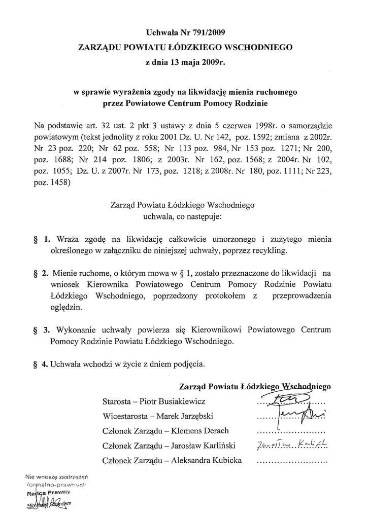 Uchwała Nr 791/2009 ZARZĄDU POWIATU ŁÓDZKIEGO WSCHODNIEGO z dnia 13 maja 2009r. w sprawie wyrażenia zgody na likwidację mienia ruchomego przez Powiatowe Centrum Pomocy Rodzinie Na podstawie art. 32 ust. 2 pkt 3 ustawy z dnia 5 czerwca 1998r. o samorządzie powiatowym (tekst jednolity z roku 2001 Dz. U. Nr 142, poz. 1592; zmiana z 2002r. Nr 23 poz. 220; Nr 62 poz. 558; Nr 113 poz. 984, Nr 153 poz. 1271; Nr 200, poz. 1688; Nr 214 poz. 1806; z 2003r. Nr 162, poz. 1568; z 2004r. Nr 102, poz. 1055; Dz. U. z 2007r. Nr 173, poz. 1218; z 2008r. Nr 180, poz. 1111; Nr 223, poz. 1458) Zarząd § l. Wraża zgodę Powiatu Łódzkiego Wschodniego uchwala, co następuje: umorzonego i zużytego mIema określonego w załączniku do niniejszej uchwały, poprzez recykling. na likwidację całkowicie § 2. Mienie ruchome, o którym mowa w § 1, zostało przeznaczone do likwidacji na wniosek Kierownika Powiatowego Centrum Pomocy Rodzinie Powiatu Łódzkiego Wschodniego, poprzedzony protokołem z przeprowadzenia oględzin. § 3. Wykonanie uchwały powierza się Kierownikowi Powiatowego Centrum Pomocy Rodzinie Powiatu Łódzkiego Wschodniego. § 4. Uchwała wchodzi w życie z dniem podjęcia. Zarząd Powiatu Łódzkiego J..Li~~ Starosta - Piotr Busiakiewicz ..... ..... ~:-~ ·······l~:-:f..l~: Nie wnoszę zastrle,Żet~ for n&lno··pr;.~ivvnv-::l-. Członek Zarządu - Klemens Derach Członek Zarządu - Członek Zarządu - Aleksandra Kubicka Jarosław Karliński Załącznik do Uchwały Nr 791/2009 Powiatu Łódzkiego Wschodniego z dnia 13 maja 2009r. Zarządu L.p. 1 2 3 4 5 6 Nr inwentarzowy PCPRlIII17 4-491-56 PCPRlIII/8 4-491-55 PCPRlIII/9 4-491-54 PCPRlIII/1 4-491-48 PCPRlII/2 4-491-26 4-491-114 Wartość Nazwa Ilość dzień 28.02.2009r. Monitor i komputer 1 O Monitor i komputer 1 O Monitor i komputer 1 O Monitor i komputer 1 O Monitor i komputer 1 O Zestaw komputerowy (monitor, komputer, drukarka) 1 O Drukarka 1 O Drukarka 1 O 9 PCPRlII/3 4-491-102 PCPRlIII/3 4-491-109 ZON 4-491-115 Drukarka 1 O 10 8-808-31 Filtr monitorowy 1 O 11 PCPRl02/03 Krzesło składane żóhe 1 O 12 PCPRl02/04 Krzesło składane żóhe 1 O 13 PCPRl02/05 Krzesło składane żóhe 1 O 14 PCPRlII47 Krzesło składane białe 1 O 15 ZON/02110 1 O 16 PCPRl02117 Czajnik bezprzewodowy 1 O 17 4-491-60 UPS 1 O 7 8 na Krzesło obrotowe Uwagi