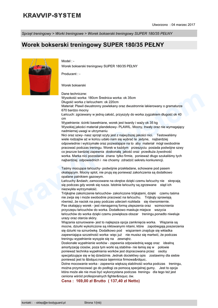 Utworzono : 04 marzec 2017 Sprzęt treningowy > Worki treningowe > Worek bokserski treningowy SUPER 180/35 PEŁNY Worek bokserski treningowy SUPER 180/35 PEŁNY Model : Worek bokserski treningowy SUPER 180/35 PEŁNY Producent : Worek bokserski m te Dane techniczne: Wysokość worka: 180cm Średnica worka: ok 35cm Długość worka z łańcuchem: ok 220cm Materiał: Plawil dwustronny powlekany oraz dwustronnie lakierowany o gramaturze 670 bardzo mocny Łańcuch: zgrzewany w jedną całość, przyszyty do worka zygzakiem długość ok 40 cm Wypełnienie: ścinki bawełniane, worek jest twardy i waży ok 35 kg Wysokiej jakości materiał plandekowy- PLAWIL. Mocny, trwały oraz nie wymagający nadmiernej uwagi w utrzymaniu Nici oraz szwy- nasz sprzęt szyty jest z najwyższej jakości nici. Testowaliśmy wiele rodzajów aż w końcu udało nam się wybrać te jedyne, najbardziej odpowiednie i wytrzymałe oraz pozwalające na to aby materiał mógł swobodnie pracować podczas treningu. Worek w każdym przeszyciu posiada podwójne szwy co jeszcze bardziej zapewnia doskonałą jakość oraz przedłuża żywotność worka. Marka nici pozostanie znana tylko firmie, ponieważ długo szukaliśmy tych najbardziej odpowiednich i nie chcemy zdradzić sekretu konkurencji. s y V v a r K S IP Taśmy mocujące łańcuchy- podwójnie przekładane, schowane pod pasem okalającym. Mocny splot, nie prują się ponieważ zakończenia są dodatkowo opalane palnikiem gazowym. Łańcuchy – zamocowane na okrętce dzięki czemu łańcuchy nie skręcają się podczas gdy worek się rusza. Istotnie łańcuchy są zgrzewane stąd ich niezwykła wytrzymałość. Trójkątne zakończenie łańcuchów- zakończone trójkątami, dzięki czemu taśma nie zwija się i może swobodnie pracować na łańcuchu. Trójkąty sprawiają również, że nacisk na pasy podczas uderzeń rozkłada się równomiernie. Pas okalający worek - jest nienaganną formą ulepszenia oraz wzmocnienia przyczepu łańcuchów do worka. Dodatkowo maskuje miejsce wszycia łańcuchów do worka dzięki czemu powiększa obszar treningu,ponadto niweluje urazy oraz otarcia skóry. Wiązania sznurowane- jest to najlepsza opcja zamknięcia worka. Wiązania są mocne, dziurki wykończone są niklowanymi nitami, które zapobiegają poszerzenia się dziurki na sznurówkę. Dodatkowo pod wiązaniem znajduje się wkładka zapewniająca szczelność worka- więc już nie musisz się martwić, że podczas treningu wypełnienie wysypie się na zewnątrz. Doskonałe wypełnienie worków - zapewnia odpowiednią wagę oraz idealną amortyzację ciosów, poza tym worki są stabilne- nie łamią się w połowie ponieważ technika wypełniania worków jest dopracowana przez osoby specjalizujące się w tej dziedzinie. Jednak dociekliwy opis zostawimy dla siebie ponieważ jest to „nasza tajemnica firmowa”. Dolne mocowanie worka - zapewnia większą stabilność worka podczas treningu, można przymocować go do podłogi za pomocą specjalnej gumy. Jest to opcja która może ale nie musi być wykorzystana podczas treningu dla tego też jest ceniona wśród profesjonalnych fighter’ ów. Cena : 169,00 zł Brutto ( 137,40 zł Netto) kontakt : - [email protected] Strona 1/{nb} Utworzono : 04 marzec 2017 Sprzęt treningowy > Worki treningowe > Worek bokserski treningowy SUPER 180/35 PEŁNY Worek bokserski treningowy SUPER 180/35 PEŁNY V v a r S IP K kontakt : - [email protected] Strona 2/{nb} m te s y Dostępność: Produkt dostępny w naszym sklepie od 06 luty 2015
