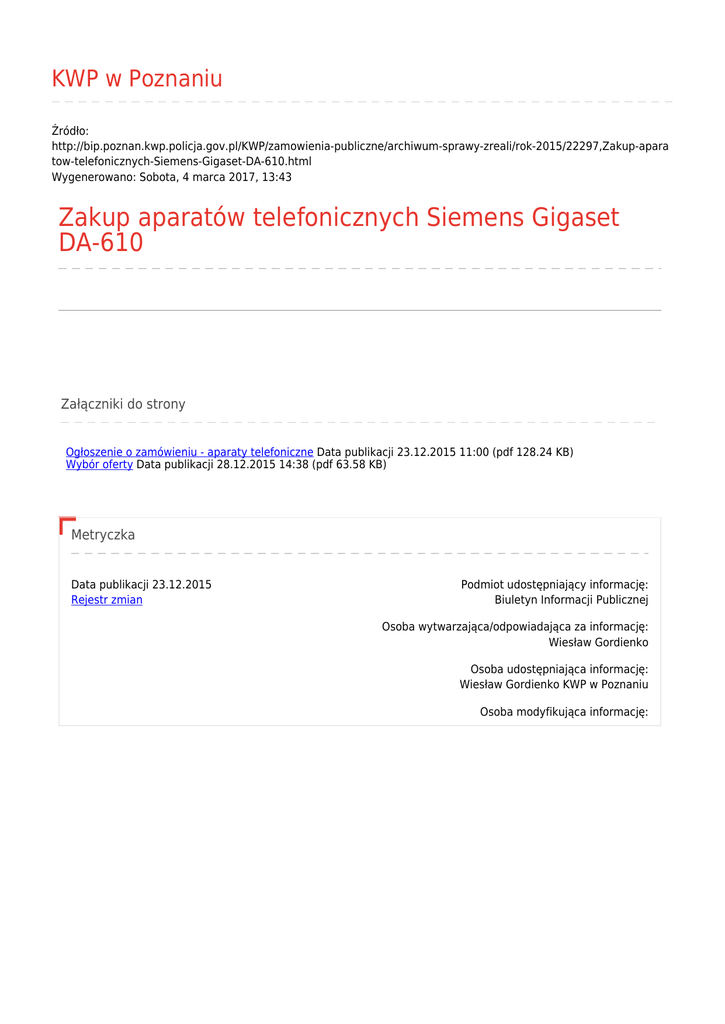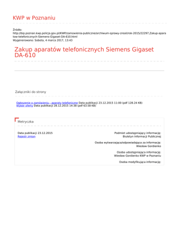 KWP w Poznaniu Źródło: http://bip.poznan.kwp.policja.gov.pl/KWP/zamowienia-publiczne/archiwum-sprawy-zreali/rok-2015/22297,Zakup-apara tow-telefonicznych-Siemens-Gigaset-DA-610.html Wygenerowano: Sobota, 4 marca 2017, 13:43 Zakup aparatów telefonicznych Siemens Gigaset DA-610 Załączniki do strony Ogłoszenie o zamówieniu - aparaty telefoniczne Data publikacji 23.12.2015 11:00 (pdf 128.24 KB) Wybór oferty Data publikacji 28.12.2015 14:38 (pdf 63.58 KB) Metryczka Data publikacji 23.12.2015 Rejestr zmian Podmiot udostępniający informację: Biuletyn Informacji Publicznej Osoba wytwarzająca/odpowiadająca za informację: Wiesław Gordienko Osoba udostępniająca informację: Wiesław Gordienko KWP w Poznaniu Osoba modyfikująca informację: