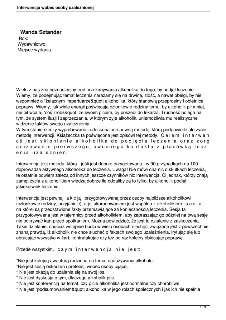 Interwencja wobec osoby uzależnionej Wanda Sztander Rok: Wydawnictwo: Miejsce wydania: Wielu z nas zna beznadziejny trud przekonywania alkoholika do tego, by podjął leczenie. Wiemy, że podejmując temat leczenia narażamy się na drwinę, złość, a nawet obelgi, by nie wspomnieć o “żelaznym repertuarze" alkoholika, który stanowią przeprosiny i obietnice poprawy. Wiemy, jak wiele energii poświęcają członkowie rodziny temu, by alkoholik pił mniej, nie pił wcale, “coś zrobił" ze swoim piciem, by poszedł do lekarza. Trudność polega na tym, że system iluzji i zaprzeczania, w którym żyje alkoholik, uniemożliwia mu realistyczne widzenie faktów swego uzależnienia. W tym stanie rzeczy wypróbowano i udoskonalono pewną metodę, którą podpowiedziało życie metodę interwencji. Książeczka ta poświęcona jest opisowi tej metody. C e l e m i n t e r w e n c ji j e s t s k ł o n i e n i e a l k o h o l i k a d o p o d j ę c i a l e c z e n i a o r a z z o r g a n i z o w a n i e p i e r w s z e g o, o w o c n e g o k o n t a k t u z p l a c ó w k ą l e c z e n i a u z a l e ż n i e ń. Interwencja jest metodą, która - jeśli jest dobrze przygotowana - w 90 przypadkach na 100 doprowadza aktywnego alkoholika do leczenia. Uwaga! Nie mówi ona nic o skutkach leczenia, te ostatnie bowiem zależą od innych jeszcze czynników niż interwencja. Ci jednak, którzy znają zamęt życia z alkoholikiem wiedzą dobrze ile oddaliby za to tylko, by alkoholik podjął jakiekolwiek leczenie. Interwencja jest pewną a k c ją przygotowywaną przez osoby najbliższe alkoholikowi (członkowie rodziny, przyjaciele), a jej ukoronowaniem jest wspólna z alkoholikiem s e s j a, na której są przedstawione fakty przemawiające za koniecznością leczenia. Sesja ta przygotowywana jest w tajemnicy przed alkoholikiem, aby zapraszając go później na ową sesję nie odkrywać kart przed spotkaniem. Można powiedzieć, że jest to działanie z zaskoczenia. Takie działanie, chociaż wstępnie budzi w wielu osobach niechęć, związane jest z powszechnie znaną prawdą, iż alkoholik nie chce słuchać o faktach swojego uzależnienia, irytując się lub obracając wszystko w żart, kontratakując czy też po raz kolejny obiecując poprawę. Przede wszystkim, c z y m i n t e r w e n c j a n i e j e s t: *Nie jest kolejną awanturą rodzinną na temat nadużywania alkoholu. *Nie jest sesją oskarżeń i pretensji wobec osoby pijącej. * Nie jest okazją do użalania się na swój los. * Nie jest dyskusją o tym, dlaczego alkoholik pije. * Nie jest konferencją na temat, czy picie alkoholika jest normalne czy chorobliwe. * Nie jest “podsumowaniem" alkoholika w jego rolach społecznych i jak ich nie spełnia 1/9 Interwencja wobec osoby uzależnionej (jesteś złym ojcem, co z ciebie za pracownik). * Nie jest sesją terapeutyczno - leczniczą ani też diagnozą uzależnienia. * Nie jest dyskusją nad tym, czym jest, a czym nie jest alkoholizm. * Nie jest publicznym upokarzaniem alkoholika Sesja interwencyjna jest k o n f r o n t a c j ą. Konfrontacja ta ma ona charakter rzeczowy, konkretny i podstawowo życzliwy wobec osoby uzależnionej. Ma doprowadzić do decyzji o leczeniu i kontaktu z placówką leczniczą. RZECZOWOŚĆ zawiera się w tym, że mówimy o faktach i zachowaniach związanych z piciem nie zajmujemy się domniemaniami ani tym, co nie ma bezpośredniego związku z piciem osoby uzależnionej. Nie będziemy więc przytaczać liczby absencji w pracy, jeśli nie wiemy, czy mają one rzeczowy i bezpośredni związek z piciem (mówimy więć:bo byłeś pijany; bo byłeś na kacu), albo jeśli zgoła nie mają takiego związku. Nie mówimy też o intencjach alkoholika (bo myślałeś, że ci ujdzie na sucho). KONKRETNOŚĆ przejawia się w tym, że mówimy o faktach bez stosowania uogólnień. Nie mówimy więc: Zrobiłeś awanturę, lecz mówimy: Krzyczałeś tak głośno, że obudziłeś dzieci. Kasia rozpłakała się, a ty trzymałeś mnie za rękę i krzyczałeś, że jak się nie uspokoi natychmiast, to ją sam uspokoisz. Ciągnąłeś mnie do łóżka. Powiedziałeś do mnie - ty jędzo - i krzyczałeś, że dzieci są nienormalne i mają to po matce. Bałam się wyrwać, żebyś nie krzyczał głośniej. Bałam się o dzieci. Bełkotałeś i cały byłeś przesiąknięty alkoholem. Nie mówimy też: Za dużo pijesz ani: Jesteś złym ojcem. Przekładamy to na język faktów np.: Przez ostatni tydzień piłeś bez przerwy, to już trzeci taki długi ciąg w tym roku. 2 - 3 dniówki zdarzają ci się regularnie co dwa tygodnie. Mówimy: Obiecałeś zrobić w szkole listwy do dekoracji, lecz w sobotę, gdy rodzice robili dekoracje, byłeś pijany. ŻYCZLIWOŚĆ oznacza, że wszystko to dzieje się w atmosferze troski i miłości dla alkoholika. Bo jak ktoś pięknie powiedział: Prawda nie może mieć kształtu kamienia, który rani. Musi być podawana z miłością, tak, by człowiek się na nią otwierał, a nie zamykał. W sesji interwencyjnej biorą udział osoby, które znają z p i e r w s z e j r ę k i fakty dotyczące picia. Nie mówi się w żadnym razie o tym, co słyszeliśmy od kogoś innego. To może być mimo wszystko plotka lub informacja grubo przesadzona. Działanie, które musi przyjść z zewnątrz Powiedzieliśmy poprzednio czym interwencja nie jest. A oto, czym interwencja jest: * Interwencja jest działaniem z zewnątrz. * Interwencja jest pomaganiem osobie, która nie chce pomocy. * Interwencja jest działaniem wbrew temu, co alkoholik myśli i czego pragnie w sprawie swego 2/9 Interwencja wobec osoby uzależnionej picia. * Interwencja jest atakiem na obrony a nie na osobę alkoholika. Alkoholik jest odgrodzony od rzeczywistości obronami, pod postacią sysytemu iluzji i zaprzeczania. On zawsze “pije tyle co wszyscy" i zawsze “poradzi sobie sam, gdy przyjdzie odpowiednia pora". Alkoholizm to coś więcej niż sam fakt nadużywania alkoholu. To tak