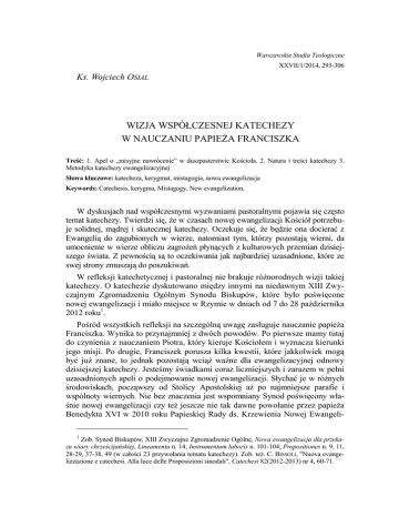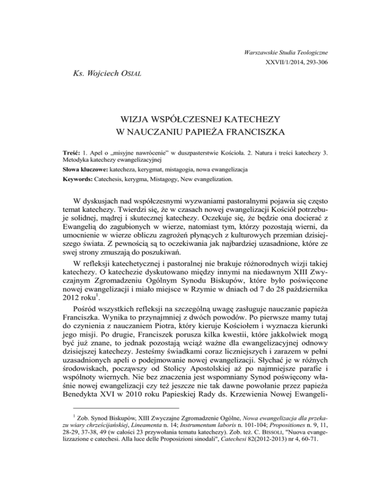 Warszawskie Studia Teologiczne XXVII/1/2014, 293-306 Ks. Wojciech OSIAL WIZJA WSPÓŁCZESNEJ KATECHEZY W NAUCZANIU PAPIEśA FRANCISZKA Treść: 1. Apel o „misyjne nawrócenie” w duszpasterstwie Kościoła. 2. Natura i treści katechezy 3. Metodyka katechezy ewangelizacyjnej Słowa kluczowe: katecheza, kerygmat, mistagogia, nowa ewangelizacja Keywords: Catechesis, kerygma, Mistagogy, New evangelization. W dyskusjach nad współczesnymi wyzwaniami pastoralnymi pojawia się często temat katechezy. Twierdzi się, Ŝe w czasach nowej ewangelizacji Kościół potrzebuje solidnej, mądrej i skutecznej katechezy. Oczekuje się, Ŝe będzie ona docierać z Ewangelią do zagubionych w wierze, natomiast tym, którzy pozostają wierni, da umocnienie w wierze obliczu zagroŜeń płynących z kulturowych przemian dzisiejszego świata. Z pewnością są to oczekiwania jak najbardziej uzasadnione, które ze swej strony zmuszają do poszukiwań. W refleksji katechetycznej i pastoralnej nie brakuje róŜnorodnych wizji takiej katechezy. O katechezie dyskutowano między innymi na niedawnym XIII Zwyczajnym Zgromadzeniu Ogólnym Synodu Biskupów, które było poświęcone nowej ewangelizacji i miało miejsce w Rzymie w dniach od 7 do 28 października 2012 roku1. Pośród wszystkich refleksji na szczególną uwagę zasługuje nauczanie papieŜa Franciszka. Wynika to przynajmniej z dwóch powodów. Po pierwsze mamy tutaj do czynienia z nauczaniem Piotra, który kieruje Kościołem i wyznacza kierunki jego misji. Po drugie, Franciszek porusza kilka kwestii, które jakkolwiek mogą być juŜ znane, to jednak pozostają wciąŜ waŜne dla ewangelizacyjnej odnowy dzisiejszej katechezy. Jesteśmy świadkami coraz liczniejszych i zarazem w pełni uzasadnionych apeli o podejmowanie nowej ewangelizacji. Słychać je w róŜnych środowiskach, począwszy od Stolicy Apostolskiej aŜ po najmniejsze parafie i wspólnoty wiernych. Nie bez znaczenia jest wspomniany Synod poświęcony właśnie nowej ewangelizacji czy teŜ jeszcze nie tak dawne powołanie przez papieŜa Benedykta XVI w 2010 roku Papieskiej Rady ds. Krzewienia Nowej Ewangeli1 Zob. Synod Biskupów, XIII Zwyczajne Zgromadzenie Ogólne, Nowa ewangelizacja dla przekazu wiary chrześcijańskiej, Lineamenta n. 14; Instrumentum laboris n. 101-104; Propositiones n. 9, 11, 28-29, 37-38, 49 (w całości 23 przywołania tematu katechezy). Zob. teŜ. C. BISSOLI, "Nuova evangelizzazione e catechesi. Alla luce delle Proposizioni sinodali", Catechesi 82(2012-2013) nr 4, 60-71. 294 KS. WOJCIECH OSIAL zacji2. Nie sposób teŜ nie zauwaŜyć zmiany w zarządzaniu katechezą na poziomie Kościoła powszechnego. PapieŜ Benedykt XVI Listem apostolskim motu proprio Fides per doctrinam z dnia 16 stycznia 2013 roku przeniósł kompetencje zarządzania katechezą z Kongregacji do Spraw Duchowieństwa do Papieskiej Rady ds. Krzewienia Nowej Ewangelizacji3. Jest to bardzo wymowny znak dla refleksji pastoralno-katechetycznej. W nauczaniu Franciszka moŜna odnaleźć kilka wypowiedzi poświęconych bezpośrednio katechezie. Są one na tyle obszerne, Ŝe pozwalają nakreślić ogólną wizję papieskiej katechezy. Głównym źródłem poszukiwań jest posynodalna adhortacja papieŜa Franciszka Evangelii gaudium z dnia 24 listopada 2013, poświęcona głoszeniu Ewangelii w dzisiejszym świecie4. Dokument ten porusza waŜny temat ewangelizacji w naszych czasach, w tym równieŜ katechezy. Innymi źródłami refleksji są róŜnorodne papieskie przemówienia i homilie, wśród których naleŜy wyróŜnić przemówienie z 27 września 2013 roku skierowane do katechetów podczas Międzynarodowego Kongresu Katechetycznego w Rzymie w ramach obchodów Roku Wiary5. Celem podejmowanej refleksji jest przywołanie kilku najwaŜniejszych zagadnień, które mogą inspirować w odnowie dzisiejszej katechezy. Zostaną one omówione w trzech punktach. Na początku zostanie zarysowany ewangelizacyjny kontekst odnowy katechezy podkreślający potrzebę „misyjnego nawrócenia” duszpasterstwa i wyjścia ku ludziom nie praktykującym i niewierzącym. Następnie, w drugiej części, będą omówione cechy katechezy (głoszenie kerygmatu, chrystocentryzm, mistagogia, via pulchritudinis, formacja moralna, zagadnienia społeczne), w trzecim zaś i zarazem ostatnim punkcie, przywoła się niektóre wskazania odnośnie postawy katechety i metodyki jego nauczania. 2 Zob. W. OSIAL, "Wezwanie Benedykta XVI do nowej ewangelizacji w świetle Listu Apostolskiego „Motu proprio” Ubicumque et semper ustanawiającego Papieską Radę ds. Krzewienia Nowej Ewangelizacji", WST 24/1/2011, 277-290. W Polsce powstał Zespół do spraw Nowej Ewangelizacji na mocy decyzji Konferencji Episkopatu Polski podjętej na 356 Zebraniu Plenarnym w dniach 14-16 października 2011 roku. Inicjatywy tego rodzaju powstają równieŜ na szczeblu diecezjalnym, czego przykładem moŜe być utworzenie Wydziału do spraw Nowej Ewangelizacji w Kurii Diecezjalnej w Tarnowie. Zob. http://system.ekai.pl/kair/?screen=depesza&_scr_depesza_id_depeszy= 497700 (25 IX 2014). Temat nowej ewangelizacji doczekał się wielu refleksji i opracowań. Wśród ostatnich moŜna przywołać między innymi następujące: Zob. Nowa ewangelizacja. Impulsy do oŜywienia wiary, red. G. AUGUSTIN, Ząbki 2012; Nowa ewangelizacja w nowej katechezie, red. P. MĄKOSA, Rzeszów 2013; Cz. PARZYSZEK, Znaczenie nowej ewangelizacji dla odnowy współczesnego świata, Ząbki 2012; F. PLACIDA, La catechesi missionaria e la nova evangelizzazione nell’Europa post-cristiana, Assisi 2013; J. H. PRADO FLORES, Nowi ewangelizatorzy dla Nowej Ewangelizacji, Poznań 2013. 3 Zob. http://www.annusfidei.va/content/novaevangelizatio/it/segreteria/FidesPerDoctrinam.html (8 IX 2014). 4 5 Zob. FRANCISZEK, Adhortacja Evangelii gaudium, 24 XI 2013 (dalej cyt. EG). Zob. FRANCISZEK, "Potrzebujemy dobrych katechetów. Przemówienie papieŜa Franciszka do uczestników Międzynarodowego Kongresu 