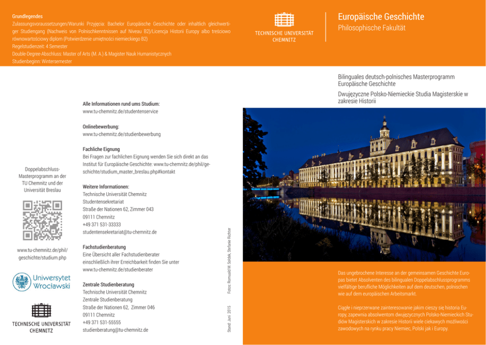 Grundlegendes Zulassungsvoraussetzungen/Warunki Przyjęcia: Bachelor Europäische Geschichte oder inhaltlich gleichwertiger Studiengang (Nachweis von Polnischkenntnissen auf Niveau B2)/Licencja Historii Europy albo treściowo równowartościowy diplom (Potwierdzenie umiętności niemieckiego B2) Regelstudienzeit: 4 Semester Double-Degree-Abschluss: Master of Arts (M. A.) & Magister Nauk Humanistycznych Studienbeginn: Wintersemester Europäische Geschichte Philosophische Fakultät Bilinguales deutsch-polnisches Masterprogramm Europäische Geschichte Dwujęzyczne Polsko-Niemieckie Studia Magisterskie w zakresie Historii Alle Informationen rund ums Studium: www.tu-chemnitz.de/studentenservice Onlinebewerbung: www.tu-chemnitz.de/studienbewerbung Fachstudienberatung Eine Übersicht aller Fachstudienberater einschließlich ihrer Erreichbarkeit finden Sie unter www.tu-chemnitz.de/studienberater Zentrale Studienberatung Technische Universität Chemnitz Zentrale Studienberatung Straße der Nationen 62, Zimmer 046 09111 Chemnitz +49 371 531-55555 [email protected] Fotos: Romuald M. Sołdek, Stefanie Richter www.tu-chemnitz.de/phil/ geschichte/studium.php Weitere Informationen: Technische Universität Chemnitz Studentensekretariat Straße der Nationen 62, Zimmer 043 09111 Chemnitz +49 371 531-33333 [email protected] Stand: Juni 2015 DoppelabschlussMasterprogramm an der TU Chemnitz und der Universität Breslau Fachliche Eignung Bei Fragen zur fachlichen Eignung wenden Sie sich direkt an das Institut für Europäische Geschichte: www.tu-chemnitz.de/phil/geschichte/studium_master_breslau.php#kontakt Das ungebrochene Interesse an der gemeinsamen Geschichte Europas bietet Absolventen des bilingualen Doppelabschlussprogramms vielfältige berufliche Möglichkeiten auf dem deutschen, polnischen wie auf dem europäischen Arbeitsmarkt. Ciągłe i nieprzerwane zainteresowanie jakim cieszy się historia Europy, zapewnia absolwentom dwujęzycznych Polsko-Niemieckich Studiów Magisterskich w zakresie Historii wiele ciekawych możliwości zawodowych na rynku pracy Niemiec, Polski jak i Europy. Aufbau des Studiums Struktura studiów Schwerpunktmodule •• Antike und Europa •• Europa im Mittelalter •• Europäische Geschichte des 18.–20. Jahrhunderts •• Wirtschafts- und Sozialgeschichte des 18.–20. Jahrhunderts •• Regionen und Regionalität Główne moduły •• Antyk i Europa •• Europa w średniowieczu •• Historia Europy od XVIII do XX wieku •• Historia gospodarcza i społeczna Europy od XVIII do XX wieku •• Regiony i regionalność w Europie Ergänzungsmodule Moduły uzupełniające •• Kultur- und Länderstudien Ostmitteleuropa •• Kraje i kultura Europy Środkowo-wschodniej •• Geschichtskultur, Geschichtspolitik, Geschichtspraxis •• Kultura, polityka i praktyka historyczna Modul Master-Arbeit Moduł Praca Magisterska Berufsperspektiven Perspektywy Zawodowe Absolventen finden auf dem deutschen sowie internationalen Arbeitsmarkt interessante Einsatzmöglichkeiten. Absolwenci znajdują na niemieckim jak i międzynarodowym rynku pracy interesujące okazji zawodowych. Dazu zählen u. a. folgende Einsatzbereiche: •• Printmedien •• Fernsehen/Rundfunk •• Verlage •• Museen •• Ausstellungswesen •• Archive •• Stiftungen •• Bildungseinrichtungen •• Europäische Verwaltungen, insbesondere Forschungs- und Kulturverwaltungen •• Europaweit agierende Stiftungen •• Verbände •• Historische Institute •• Europäische Hochschulen Obejmuje to między innymi następujące dziedziny: •• Druk •• Telewizja/Radio •• Wydawnictwa •• Muzea •• Wystawiennictwo •• Archiwa •• Fundacje •• Zakłady naukowe •• Administracja europejska, szczególnie fundacje aktywne w całej Europie •• Stowarzyszenia •• Związki •• Instytuty historyczne •• Wyższe Szkoły Europejskie Was zeichnet den bilingualen Masterstudiengang aus? Das bundesweit einzige bilinguale, deutsch-polnische Doppelabschlussprogramm eröffnet angehenden Historikerinnen und Historikern die Möglichkeit, durch das Studium in beiden Ländern deren Sprache und Kultur zu erkunden. Deutschland hat mit keinem anderen Land eine so lange gemeinsame Grenze und die Geschichte beider Länder ist eng miteinander verwoben. Die Teilnehmerinnen und Teilnehmer des Studienprogramms erhalten eine besondere Zusatzqualifikation und erwerben an beiden Universitäten einen vollwertigen Hochschulabschluss. Nicht zuletzt die 18-monatige Studienphase in Wrocław/Breslau bietet beste Voraussetzungen für den Einstieg in Berufsfelder im deutsch-polnischen wie europäischen Kontext. Co wyróżnia te Dwujęzyczne Studia Magisterskie? Dwujęzyczny polsko-niemiecki program dwudyplomowy, jedyny taki na terenie Niemiec, pozwala przyszłym historykom dzięki studiom w Niemczech jak i w Polsce poznać język i kulturę obu krajów. Niemcy łączy z Polską nie tylko wspólna granica, lecz też długa i wspólna historia. Poza cennymi dodatkowymi kwalifikacjami zawodowymi, uczestnicy dwudyplomowego programu studiów zdobędą dyplom ukończenia studiów obu uniwersytetów. W szczególności studia na uniwersytecie partnerskim we Wrocławiu (18 miesięcy) przygotowują uczestników do rozpoczęcia pracy zawodowej w zakresie szeroko rozumianych relacji polsko-niemieckich jak i europejskich.