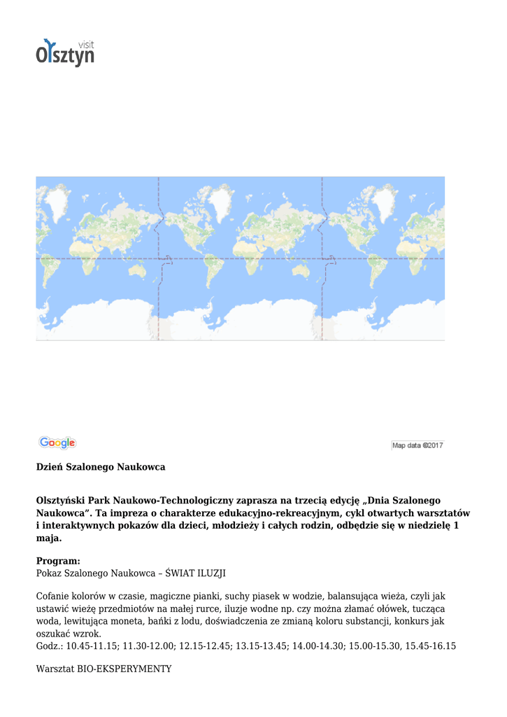Dzień Szalonego Naukowca Olsztyński Park Naukowo-Technologiczny zaprasza na trzecią edycję „Dnia Szalonego Naukowca”. Ta impreza o charakterze edukacyjno-rekreacyjnym, cykl otwartych warsztatów i interaktywnych pokazów dla dzieci, młodzieży i całych rodzin, odbędzie się w niedzielę 1 maja. Program: Pokaz Szalonego Naukowca – ŚWIAT ILUZJI Cofanie kolorów w czasie, magiczne pianki, suchy piasek w wodzie, balansująca wieża, czyli jak ustawić wieżę przedmiotów na małej rurce, iluzje wodne np. czy można złamać ołówek, tucząca woda, lewitująca moneta, bańki z lodu, doświadczenia ze zmianą koloru substancji, konkurs jak oszukać wzrok. Godz.: 10.45-11.15; 11.30-12.00; 12.15-12.45; 13.15-13.45; 14.00-14.30; 15.00-15.30, 15.45-16.15 Warsztat BIO-EKSPERYMENTY Owocowy prąd, czyli energia z ogródka, termometr bez rtęci, ekologiczny zegar mierzący czas zmianą kolorów, doświadczenia: jak zrobić baterię z owoców, jak sprawdzić, ile skrobi mają warzywa, jak zobaczyć, ile żelaza mają płatki śniadaniowe. Godz.: 10.30-11.00; 11.15-11.45; 12.00-12.30; 13.00-13.30; 13.45-14.15; 14.45-15.15; 15.30-16.15 Warsztat SZALONE KONSTRUKCJE Budowa z gotowych elementów – rurki, zębatki, przekładnie, mosty, zjeżdżalnie – wielkiego toru przeszkód, po którym z zawrotną szybkością poruszają się kulki, konkurs: budowa toru na czas, wygrywa drużyna, której kulki pierwsze pokonają tor z przeszkodami. Godz.: 11.00-11.30; 11.45-12.15; 12.30-13.00; 13.30-14.00; 14.15-14.45; 15.15-15.45; 16.00-16.30 Warsztat DZIAŁA POWIETRZNE Budowa z gotowych elementów modeli dział powietrznych, konkurs: strącanie wielkiej wieży kubeczków na czas poprzez strzał ze zbudowanego działa, doświadczenia: jak powstaje tornado, jak schronić się przed różnymi rodzajami tornad. Godz.: 10.30-11.00; 11.15-11.45; 12.00-12.30; 13.00-13.30; 13.45-14.15; 14.45-15.15; 15.30-16.15 Warsztat POWIETRZNE EKSPERYMENTY Tworzenie różnych modeli samolotów, puszczanie zbudowanych konstrukcji w specjalnym tunelu aerodynamicznym, uczestnicy dowiedzą się, które kształty lepiej unoszą się w powietrzu i jakie są najbardziej optymalne kształty, aby jak najdłużej utrzymać się w powietrzu. Godz.: 11.00-11.30; 11.45-12.15; 12.30-13.00; 13.30-14.00; 14.15-14.45; 15.15-15.45; 16.00-16.30 Wstęp wolny. 1)Olsztyński Park Naukowo-Technologiczny, (2016-05-01 10:30-2016-05-01 16:30) www.visit.olsztyn.eu