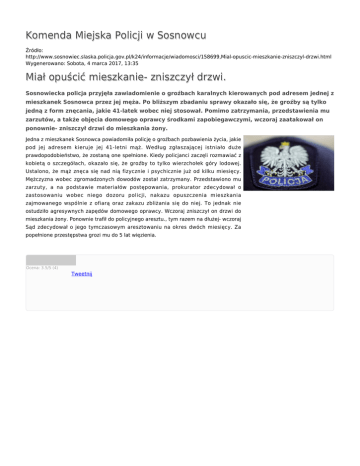 Komenda Miejska Policji w Sosnowcu Źródło: http://www.sosnowiec.slaska.policja.gov.pl/k24/informacje/wiadomosci/158699,Mial-opuscic-mieszkanie-zniszczyl-drzwi.html Wygenerowano: Sobota, 4 marca 2017, 13:35 Miał opuścić mieszkanie- zniszczył drzwi. Sosnowiecka policja przyjęła zawiadomienie o groźbach karalnych kierowanych pod adresem jednej z mieszkanek Sosnowca przez jej męża. Po bliższym zbadaniu sprawy okazało się, że groźby są tylko jedną z form znęcania, jakie 41-latek wobec niej stosował. Pomimo zatrzymania, przedstawienia mu zarzutów, a także objęcia domowego oprawcy środkami zapobiegawczymi, wczoraj zaatakował on ponownie- zniszczył drzwi do mieszkania żony. Jedna z mieszkanek Sosnowca powiadomiła policję o groźbach pozbawienia życia, jakie pod jej adresem kieruje jej 41-letni mąż. Według zgłaszającej istniało duże prawdopodobieństwo, że zostaną one spełnione. Kiedy policjanci zaczęli rozmawiać z kobietą o szczegółach, okazało się, że groźby to tylko wierzchołek góry lodowej. Ustalono, że mąż znęca się nad nią fizycznie i psychicznie już od kilku miesięcy. Mężczyzna wobec zgromadzonych dowodów został zatrzymany. Przedstawiono mu zarzuty, a na podstawie materiałów postępowania, prokurator zdecydował o zastosowaniu wobec niego dozoru policji, nakazu opuszczenia mieszkania zajmowanego wspólnie z ofiarą oraz zakazu zbliżania się do niej. To jednak nie ostudziło agresywnych zapędów domowego oprawcy. Wczoraj zniszczył on drzwi do mieszkania żony. Ponownie trafił do policyjnego aresztu., tym razem na dłużej- wczoraj Sąd zdecydował o jego tymczasowym aresztowaniu na okres dwóch miesięcy. Za popełnione przestępstwa grozi mu do 5 lat więzienia. Ocena: 3.5/5 (4) Tweetnij