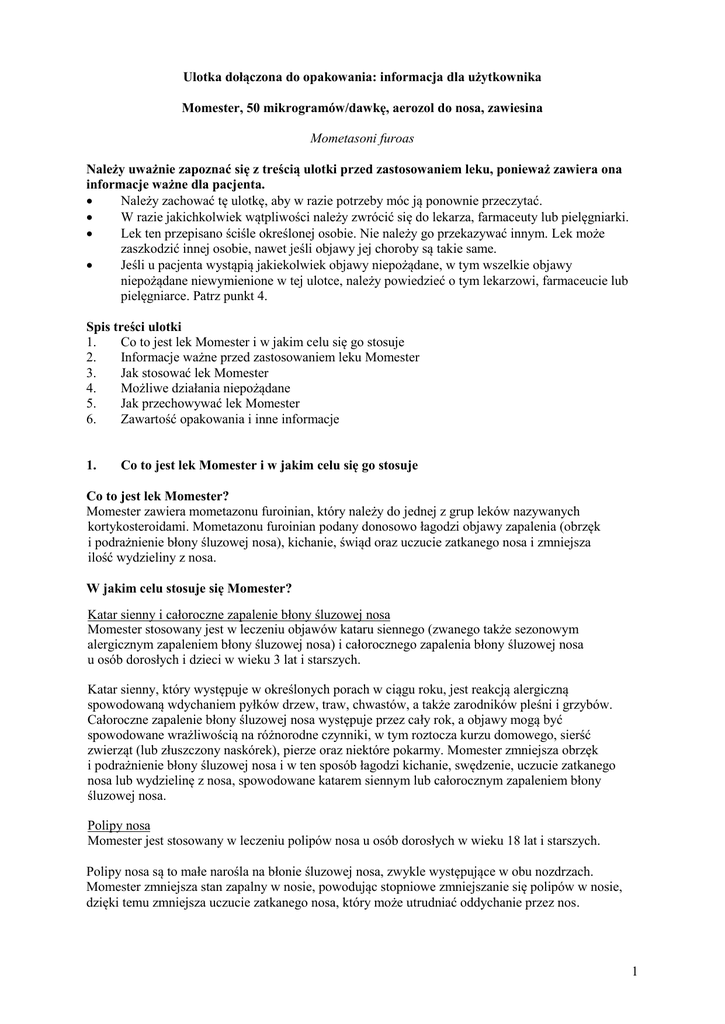 Ulotka dołączona do opakowania: informacja dla użytkownika Momester, 50 mikrogramów/dawkę, aerozol do nosa, zawiesina Mometasoni furoas Należy uważnie zapoznać się z treścią ulotki przed zastosowaniem leku, ponieważ zawiera ona informacje ważne dla pacjenta. Należy zachować tę ulotkę, aby w razie potrzeby móc ją ponownie przeczytać. W razie jakichkolwiek wątpliwości należy zwrócić się do lekarza, farmaceuty lub pielęgniarki. Lek ten przepisano ściśle określonej osobie. Nie należy go przekazywać innym. Lek może zaszkodzić innej osobie, nawet jeśli objawy jej choroby są takie same. Jeśli u pacjenta wystąpią jakiekolwiek objawy niepożądane, w tym wszelkie objawy niepożądane niewymienione w tej ulotce, należy powiedzieć o tym lekarzowi, farmaceucie lub pielęgniarce. Patrz punkt 4. Spis treści ulotki 1. Co to jest lek Momester i w jakim celu się go stosuje 2. Informacje ważne przed zastosowaniem leku Momester 3. Jak stosować lek Momester 4. Możliwe działania niepożądane 5. Jak przechowywać lek Momester 6. Zawartość opakowania i inne informacje 1. Co to jest lek Momester i w jakim celu się go stosuje Co to jest lek Momester? Momester zawiera mometazonu furoinian, który należy do jednej z grup leków nazywanych kortykosteroidami. Mometazonu furoinian podany donosowo łagodzi objawy zapalenia (obrzęk i podrażnienie błony śluzowej nosa), kichanie, świąd oraz uczucie zatkanego nosa i zmniejsza ilość wydzieliny z nosa. W jakim celu stosuje się Momester? Katar sienny i całoroczne zapalenie błony śluzowej nosa Momester stosowany jest w leczeniu objawów kataru siennego (zwanego także sezonowym alergicznym zapaleniem błony śluzowej nosa) i całorocznego zapalenia błony śluzowej nosa u osób dorosłych i dzieci w wieku 3 lat i starszych. Katar sienny, który występuje w określonych porach w ciągu roku, jest reakcją alergiczną spowodowaną wdychaniem pyłków drzew, traw, chwastów, a także zarodników pleśni i grzybów. Całoroczne zapalenie błony śluzowej nosa występuje przez cały rok, a objawy mogą być spowodowane wrażliwością na różnorodne czynniki, w tym roztocza kurzu domowego, sierść zwierząt (lub złuszczony naskórek), pierze oraz niektóre pokarmy. Momester zmniejsza obrzęk i podrażnienie błony śluzowej nosa i w ten sposób łagodzi kichanie, swędzenie, uczucie zatkanego nosa lub wydzielinę z nosa, spowodowane katarem siennym lub całorocznym zapaleniem błony śluzowej nosa. Polipy nosa Momester jest stosowany w leczeniu polipów nosa u osób dorosłych w wieku 18 lat i starszych. Polipy nosa są to małe narośla na błonie śluzowej nosa, zwykle występujące w obu nozdrzach. Momester zmniejsza stan zapalny w nosie, powodując stopniowe zmniejszanie się polipów w nosie, dzięki temu zmniejsza uczucie zatkanego nosa, który może utrudniać oddychanie przez nos. 1 2. Informacje ważne przed zastosowaniem leku Momester Kiedy nie stosować leku Momester Jeśli pacjent ma uczulenie na mometazonu furoinian lub którykolwiek z pozostałych składników tego leku (wymienionych w punkcie 6). Jeśli u pacjenta występuje niewyleczone zakażenie nosa. Stosowanie leku Momester w czasie niewyleczonego zakażenia w obrębie jamy nosowej, np. opryszczki może spowodować zaostrzenie objawów zakażenia. Zanim zastosuje się aerozol do nosa, należy poczekać do czasu wyleczenia zakażenia. Jeśli pacjent niedawno miał zabieg chirurgiczny w obrębie nosa lub uraz nosa. Nie należy stosować aerozolu do nosa, aż do czasu zagojenia się ran. Ostrzeżenia i środki ostrożności Przed rozpoczęciem stosowania leku Momester należy omówić to z lekarzem lub farmaceutą: Jeśli u pacjenta występuje obecnie lub występowała kiedykolwiek w przeszłości gruźlica. Jeśli u pacjenta występuje jakikolwiek inne zakażenie. Jeśli pacjent przyjmuje inne kortykosteroidy w postaci doustnej lub zastrzyków. Jeśli u pacjenta występuje mukowiscydoza. Podczas stosowania leku Momester należy omówić to z lekarzem: Jeśli układ odpornościowy pacjenta nie funkcjonuje prawidłowo (występują trudności w zwalczaniu zakażenia) i pacjent miał kontakt z osobą chorą na odrę lub ospę wietrzną. Należy unikać kontaktu z osobami, u których występują te zakażenia. Jeśli u pacjenta występuje zakażenie nosa lub gardła. Jeśli lek jest stosowany kilka miesięcy lub dłużej. Jeśli pacjent ma długotrwałe podrażnienie nosa lub gardła. Jeśli kortykosteroidy w postaci aerozolu do nosa przyjmuje się w dużych dawkach przez długi czas, mogą wystąpić działania niepożądane z powodu wchłaniania się leku w organizmie. Jeśli wystąpi swędzenie lub podrażnienie oczu, lekarz może zalecić inne leczenie z lekiem Momester. Dzieci Jeśli kortykosteroidy w postaci aerozolu do nosa stosuje się w dużych dawkach przez długi czas, mogą one powodować pewne działania niepożądane, takie jak spowolnienie tempa wzrostu u dzieci. Zaleca się, aby regularnie kontrolować wzrost dzieci otrzymujących długotrwałe leczenie kortykosteroidami donosowymi, i jeśli zauważone zostaną jakiekolwiek zmiany, należy poinformować lekarza. Lek Momester a inne leki Należy powiedzieć lekarzowi lub farmaceucie o wszystkich lekach przyjmowanych przez pacjenta obecnie lub ostatnio, a także o lekach, które pacjent planuje przyjmować. W przypadku leczenia alergii innymi kortykosteroidami w postaci doustnej lub zastrzyków, lekarz prowadzący może zalecić pacjentowi, aby zakończył ich stosowanie w momencie rozpoczęcia stosowania leku Momester. U niektórych pacjentów po przerwaniu stosowania kortykosteroidów w postaci doustnej lub zastrzyków mogą wystąpić działania niepożądane, takie jak ból stawów lub mięśni, osłabienie oraz depresja. Mogą również ujawnić się inne objawy alergiczne, takie jak swędzenie, łzawienie oczu lub czerwone i swędzące plamy na skórze. Należy skontaktować się z