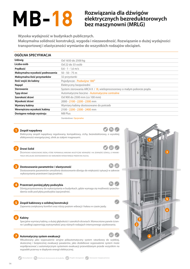 MB-18 Rozwiązania dla dźwigów elektrycznych bezreduktorowych bez maszynowni (MRLG) Wysoka wydajność w budynkach publicznych. Maksymalna solidność konstrukcji, wygoda i niezawodność. Rozwiązanie o dużej wydajności transportowej i elastyczności wymiarów do wszystkich rodzajów obciążeń. OGÓLNA SPECYFIKACJA Udźwig Liczba osób Prędkość Maksymalna wysokość podnoszenia Maksymalna ilość przystanków Ilość wejść do kabiny Napęd Sterowanie Typy drzwi Szerokość drzwi Wysokość drzwi Wymiary kabiny Wewnętrzna wysokość kabiny Dostępne rodzaje wystroju Od 1650 do 2500 kg Od 22 do 33 osób 0,6 - 1 - 1,6 m/s 50 - 50 - 75 m 32 przystanki Pojedyncze - Podwójne 180O Elektryczny bezpośredni System sterowania ARCA II / III, wieloprocesorowy o małym poborze prądu Automatyczne boczne - Automatyczne centralne Od 900 do 2500 mm (co 100 mm) 2000 - 2100 - 2200 - 2300 mm Wymiary kabiny dostosowane do potrzeb 2100 - 2200 - 2300 - 2400 mm MB Plus Standardowe Opcjonalne 1 Zespół napędowy Elektryczny zespół napędowy regulowany, kompaktowy, cichy, bezreduktorowy, o wysokiej efektywności energetycznej, silnik ze stałymi magnesami. 2 1 Drzwi Solid 3 Dodatkowo wzmocnione drzwi, które poprawiają warunki akustyczne wewnątrz i na zewnątrz dźwigu, o parametrach specjalnie dostosowanych do warunków intensywnego przepływu ruchu. 3 Dostosowanie parametrów / elastyczność Dostosowanie parametrów umożliwia dostosowanie dźwigu do większości sytuacji w zakresie wykorzystania przestrzeni (opcjonalnie). 4 Przestrzeń poniżej płyty podszybia Dźwig przystosowany do wykorzystania w budynkach, gdzie wymaga się możliwości przechodzenia osób pod płytą podszybia (opcjonalnie). 5 5 Zespół kabinowy o solidnej konstrukcji Zapewnia zwiększony komfort oraz niższy poziom wibracji i hałasu w czasie jazdy. 6 6 Kabiny Specjalne wymiary kabiny, o dużej głębokości i szerokich drzwiach. Wzmocnione panele ścienne i podłogi zapewniają wytrzymałość przy różnych rodzajach intensywnego użytkowania. 7 Wbudowany jako wyposażenie seryjne półautomatyczny system ratunkowy do szybkiej, skutecznej i bezpiecznej ewakuacji pasażerów, jako dodatkowe wyposażenie system może współpracować z automatycznym systemem ewakuacji przewidzianym przede wszystkim na wypadek przerwy w dopływie energii elektrycznej. 14 Możliwość dostosowania do budynku 2 4 Automatyczny system ewakuacji Ekowydajność 7 Projekt i dostępność Sterowanie i bezpieczeństwo WYMIARY STANDARDOWE Kabina Udźwig / liczba osób Prędkość Dostępność Szyb * Q AC FC PL Liczba osób Udźwig Szerokość Głębokość Szerokość Typ 24 1800 kg 2350 1600 1200 CC 26 2000 kg 2350 1700 1200 CC 1500 2700 1300 TT 33 2500 kg 1800 2700 1300 TT 24 1800 kg 2350 1600 1200 CC 26 2000 kg 2350 1700 1200 CC 1500 2700 1300 TT 33 2500 kg 1800 2700 1300 TT 24 1800 kg 2350 1600 1200 CC 26 2000 kg 2350 1700 1200 CC 1500 2700 1300 TT 33 2500 kg 1800 2700 1300 TT 0,6 m/s 1 m/s 1,6 m/s Ilość wejść AH1 FH HF2 HUP3 Szerokość Głębokość Podszybie Nadszybie 1450 3625 1450 3650 1600 3790 1 2 x 1800 1 2 x 1800 1 2 x 1800 1 2 x 1800 1 2 x 1800 1 2 x 1800 1 2 x 1800 1 2 x 1800 1 2 x 1800 1 2 x 1800 1 2 x 1800 1 2 x 1800 1950 2160 2050 2260 3050 3260 3050 3260 1950 2160 2050 2260 3050 3260 3050 3260 2050 2260 2050 2260 3050 3260 3050 3260 3150 3150 2300 2600 3150 3150 2300 2600 3150 3150 2300 2600 CC - Drzwi centralne 2-skrzydłowe. TT - Drzwi teleskopowe 2-skrzydłowe. * Szyb bez odchyleń od pionu. 1. Drzwi teleskopowe 2-skrzydłowe. 2. Z podłogą z PVC. Opcja posadzki marmurowej + 20 mm. 3. HUP minimalnie dla wewnętrznej wysokości kabiny (HC) 2100 mm. KONFIGURACJA 1 Wejście 2 Wejścia 180O HC HPU HUP Przekrój pionowy Wymiary kabiny dostosowane do potrzeb użytkownika 33 32 31 29 27 25 24 22 22 33 31 31 29 27 25 24 23 22 33 31 30 29 27 26 24 23 22 22 2900 2800 2700 2600 2500 2400 2300 2200 2100 2000 1900 1800 1700 1600 1500 1400 HF 33 32 31 29 27 25 23 22 33 32 30 29 27 25 24 22 22 33 33 31 30 28 27 25 24 23 22 33 33 32 33 32 30 33 31 30 29 33 33 31 30 28 27 33 31 30 29 28 26 25 32 31 29 28 27 25 24 23 30 28 26 26 24 23 22 22 27 26 25 24 22 22 22 3000 2900 2800 2700 2600 2500 2400 2300 2200 2100 2000 1900 1800 1700 AC 900 1000 1100 1200 1300 1400 1500 1600 1700 1800 1900 2000 2100 2200 2300 2400 2500 FC PL Uwaga: szerokość i głębokość kabiny możliwa do zmiany, co 5 mm. Dla ułatwienia w tabeli podano zmiany wymiarów co 100 mm. 15