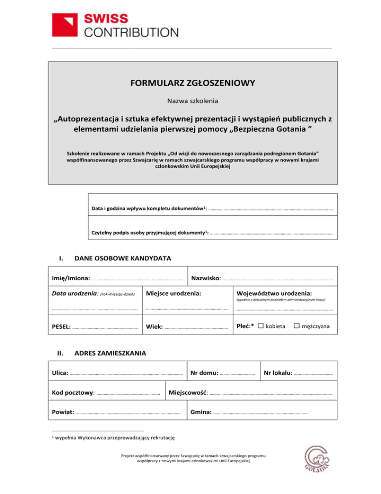 ______________________________________________________________________________________________________________ FORMULARZ ZGŁOSZENIOWY Nazwa szkolenia „Autoprezentacja i sztuka efektywnej prezentacji i wystąpień publicznych z elementami udzielania pierwszej pomocy „Bezpieczna Gotania ” Szkolenie realizowane w ramach Projektu „Od wizji do nowoczesnego zarządzania podregionem Gotania” współfinansowanego przez Szwajcarię w ramach szwajcarskiego programu współpracy w nowymi krajami członkowskim Unii Europejskiej Data i godzina wpływu kompletu dokumentów1: ……………………………………………………………………………………………. Czytelny podpis osoby przyjmującej dokumenty1: ………………………………………………………………………………………….. I. DANE OSOBOWE KANDYDATA Imię/Imiona: …………………………………………………………………… Nazwisko: …………………………………………………………………………………. Data urodzenia: (rok-miesiąc-dzień) Miejsce urodzenia: Województwo urodzenia: ………………………………………………………………. ……………………………………………………………. ………………………………………………………………………. PESEL: ……………………………………………….. Wiek: ……………………………………………… Płeć:* (zgodnie z aktualnym podziałem administracyjnym kraju) II. ADRES ZAMIESZKANIA Ulica: …………………………………………………………………………………… Kod pocztowy: ……………………………………………… Nr domu: ………………………… Nr lokalu: …………………………… Miejscowość: ………………………………………………………………………………………….. Powiat: …………………………………………………………………………….. 1 □ kobieta □ mężczyzna Gmina: …………………………………………………………………….. wypełnia Wykonawca przeprowadzający rekrutację Projekt współfinansowany przez Szwajcarię w ramach szwajcarskiego programu współpracy z nowymi krajami członkowskimi Unii Europejskiej ______________________________________________________________________________________________________________ III. DANE KONTAKTOWE Telefon stacjonarny: …………………………………………………… Telefon komórkowy: ……………………………………………………… Adres e-mail: ……………………………………………………………………………………………………………………………………………………………………………………. IV. WYKSZTAŁCENIE * □ □ □ □ □ V. podstawowe gimnazjalne ponadgimnazjalne [wykształcenie średnie lub zasadnicza szkoła zawodowa] pomaturalne [kontynuacja nauki po maturze w innej formie niż studia] wyższe [tytuł licencjata, inżyniera, magistra lub doktora] STATUS KANDYDATA * □ osoba pracująca _ _ _ __ _ _ __ _ _ __ _ _ __ _ _ __ _ _ __ _ _ __ _ _ _ (wskazać miejsce zatrudnienia – nazwa JST lub jednostki organizacyjnej) VI. Czy zamierza Pan/Pani starać się o zwrot kosztów dojazdu na zajęcia? * (dotyczy osób zameldowanych poza miejscowością, w której odbywają się zajęcia) □ TAK □ NIE VII. OŚWIADCZENIE Wyrażam zgodę na udział w usługach projektowych realizowanych w ramach projektu „Od wizji do nowoczesnego zarządzania podregionem Gotania” współfinansowanego przez Szwajcarię w ramach szwajcarskiego programu współpracy z nowymi krajami członkowskim Unii Europejskiej. Zostałam/zostałem pouczony, że składając dokumenty uczestnictwa w projekcie powinienem/powinnam podać wszystkie dane wskazane w w/w dokumentach zgodnie ze stanem faktycznym istniejącym w momencie ich składania. Oświadczam, że dane zawarte w złożonych przeze mnie dokumentach są zgodne z prawdą. Podanie danych niezgodnych z prawdą będzie rodzić po stronie podającego nieprawdziwe dane odpowiedzialność cywilną względem poszkodowanego. Oświadczam, że zapoznałem/am się, akceptuję i zobowiązuję się do przestrzegania „Regulaminu rekrutacji i realizacji szkoleń w ramach projektu „Od wizji do nowoczesnego zarządzania podregionem Gotania”, w szczególności zobowiązuję się do regularnego udziału w zajęciach oraz po pozytywnej rekrutacji do udziału w nie więcej jak dwóch szkoleniach w ramach drugiej edycji szkoleń. Projekt współfinansowany przez Szwajcarię w ramach szwajcarskiego programu współpracy z nowymi krajami członkowskimi Unii Europejskiej ______________________________________________________________________________________________________________ Wyrażam zgodę na przetwarzanie moich danych osobowych przez Gminę Miejską Hrubieszów – CENTRUM KSZTAŁCENIA BIZNESU sp. z o.o. zgodnie z ustawą z dnia 29.08.1997r. o ochronie danych osobowych (tj. Dz. U. z 2002r., nr. 101, poz. 926 z późn. zm.). Jednocześnie oświadczam, że akceptuję następujące warunki: 1) administratorem moich danych osobowych jest Gmina Miejska Hrubieszów – CENTRUM KSZTAŁCENIA BIZNESU sp. z o.o., 2) moje dane osobowe mogą zostać udostępnione podmiotom realizującym kursy/szkolenia, podmiotom wdrażającym i kontrolującym Szwajcarsko-Polski Program Współpracy oraz innym podmiotom w celach związanych z realizacją projektu, 3) podanie danych jest dobrowolne, aczkolwiek odmowa ich podania jest równoznaczna z brakiem możliwości udzielenia wsparcia w ramach Projektu; 4) mam prawo dostępu do treści swoich danych i ich poprawiania. Na potwierdzenie statusu kandydata wskazanego w pkt. V Formularza Zgłoszeniowego przekładam stosowne dokumenty (zaświadczenie z miejsca zatrudnienia, ZUS, KRUS, PUP lub inne). mi
