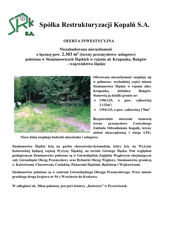 Spółka Restrukturyzacji Kopalń S.A. OFERTA INWESTYCYJNA Niezabudowana nieruchomość o łącznej pow. 2.303 m2 (tereny przemysłowo- usługowe) położona w Siemianowicach Śląskich w rejonie ul. Krupanka, Bańgów - województwo śląskie Oferowana nieruchomość znajduje się w północno- wschodniej części miasta Siemianowice Śląskie w rejonie ulicy Krupanka, dzielnica Bańgów. Stanowią ją działki gruntu nr: 1396/125, o pow. całkowitej 2.133m2; 1394/125, o pow. całkowitej 170m2 Bezpośrednie otoczenie stanowią tereny przemysłowe Centralnego Zakładu Odwadniania Kopalń, tereny zieleni nieurządzonej i stacja LPG. Nieco dalej znajdują budynki mieszkalne i usługowe. Siemianowice Śląskie leżą na garbie chorzowsko-bytomskim, który leży na Wyżynie Katowickiej będącej częścią Wyżyny Śląskiej, na terenie Górnego Śląska. Pod względem geologicznym Siemianowice położone są w Górnośląskim Zagłębiu Węglowym obejmującym cały Górnośląski Okręg Przemysłowy oraz Rybnicki Okręg Węglowy. Siemianowice graniczą z: Katowicami, Chorzowem, Czeladzią, Piekarami Śląskimi, Będzinem i Wojkowicami. Siemianowice położone są w centrum Górnośląskiego Okręgu Przemysłowego. Przez miasto przebiega droga krajowa nr 94 z Wrocławia do Krakowa. W odległości ok. 30km położony jest port lotniczy „Katowice” w Pyrzowicach. Dane o terenie: Właściciel Skarb Państwa Użytkownik wieczysty Spółka Restrukturyzacji Kopalń S.A. Dane adresowe użytkownika wieczystego ul. Strzelców Bytomskich 207 41-914 Bytom Fax: +48 (prefix) 32/35-13-309; 35-13-310 www.srk.com.pl Powierzchnia całkowita Działki gruntu nr: 1396/125, o pow. całkowitej 2.133m2; 1394/125, o pow. całkowitej 170m2 Przeznaczenie według planu zagospodarowania przestrzennego Działka nr 1396/125- strefa przemysłowo-usługowa. Działka nr 1394/125- strefa pasa drogowego drogi wojewódzkiej. Obecny sposób zagospodarowania Teren częściowo płaski, porośnięty wysoką i niską zielenią nieurządzoną. Natomiast część działki nr 1394/125 stanowi ścieżkę dla pieszych. Informacje o terenach przyległych W otoczeniu znajdują się tereny przemysłowe Centralnego Zakładu odwadniania Kopalń, tereny zieleni nieurządzonej, stacja LPG oraz nieco dalej budynki mieszkalne i usługowe. Istniejące uzbrojenie Możliwość przyłączenia do podstawowej sieci uzbrojenia technicznego. Dostępność komunikacyjna Połączenie z ulicą Krupanka, która umożliwia połączenie z takimi miastami jak Piekary Śląskie, Czeladź i Bytom –trasa 4, 94, E40. Sugerowana forma zbycia Sprzedaż prawa wieczystego użytkowania na lata do 2089r., w drodze przetargu publicznego. Preferowana sprzedaż całego kompleksu. Osoba do kontaktu Dział Zagospodarowania Majątku, Maciej Szymczak tel.: +48 (prefix) 32/35-13-362; e-mail.: [email protected] Sporządził: Zarządca dnia 2015.08.01.