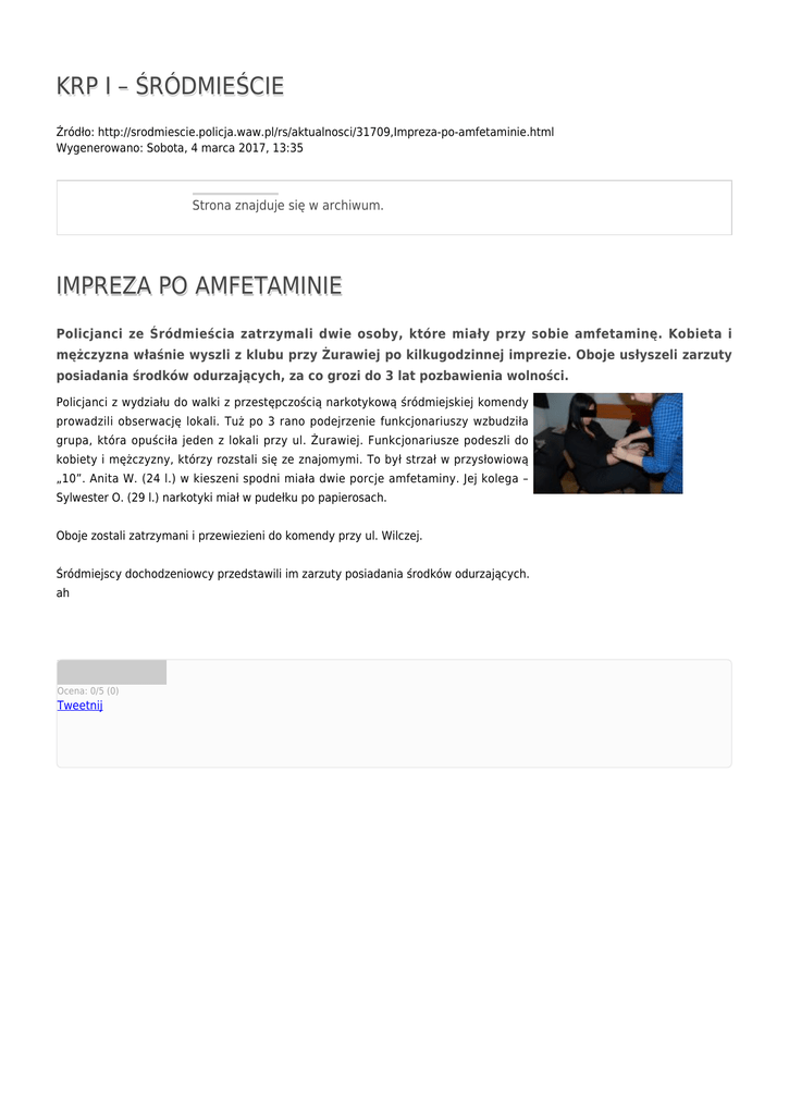 KRP I – ŚRÓDMIEŚCIE Źródło: http://srodmiescie.policja.waw.pl/rs/aktualnosci/31709,Impreza-po-amfetaminie.html Wygenerowano: Sobota, 4 marca 2017, 13:35 Strona znajduje się w archiwum. IMPREZA PO AMFETAMINIE Policjanci ze Śródmieścia zatrzymali dwie osoby, które miały przy sobie amfetaminę. Kobieta i mężczyzna właśnie wyszli z klubu przy Żurawiej po kilkugodzinnej imprezie. Oboje usłyszeli zarzuty posiadania środków odurzających, za co grozi do 3 lat pozbawienia wolności. Policjanci z wydziału do walki z przestępczością narkotykową śródmiejskiej komendy prowadzili obserwację lokali. Tuż po 3 rano podejrzenie funkcjonariuszy wzbudziła grupa, która opuściła jeden z lokali przy ul. Żurawiej. Funkcjonariusze podeszli do kobiety i mężczyzny, którzy rozstali się ze znajomymi. To był strzał w przysłowiową „10”. Anita W. (24 l.) w kieszeni spodni miała dwie porcje amfetaminy. Jej kolega – Sylwester O. (29 l.) narkotyki miał w pudełku po papierosach. Oboje zostali zatrzymani i przewiezieni do komendy przy ul. Wilczej. Śródmiejscy dochodzeniowcy przedstawili im zarzuty posiadania środków odurzających. ah Ocena: 0/5 (0) Tweetnij