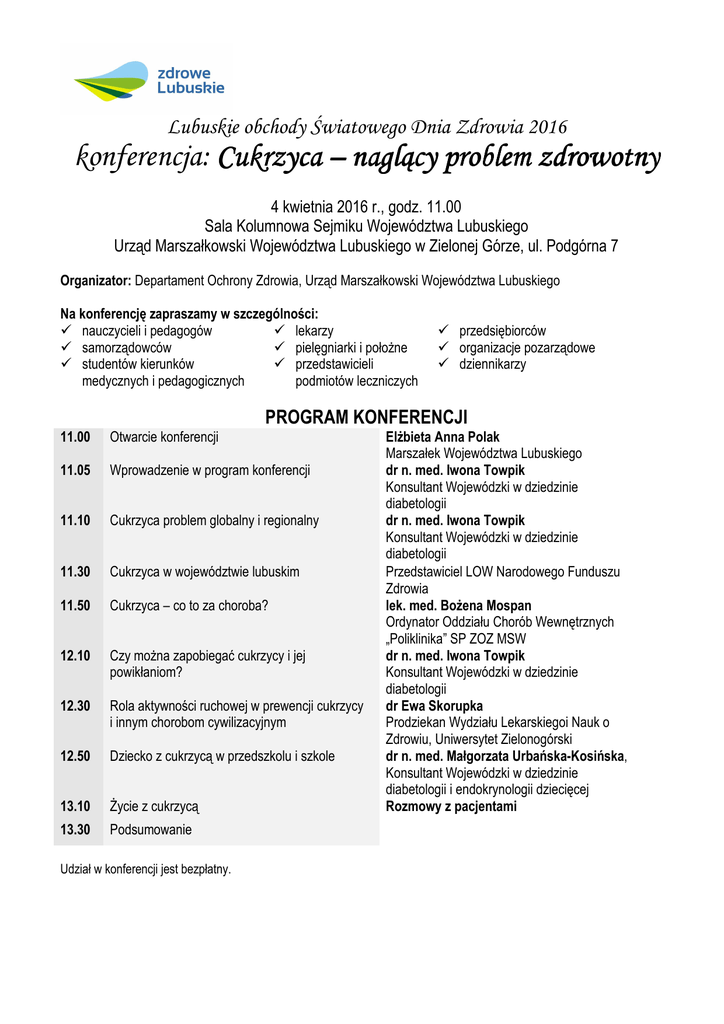 Lubuskie obchody Światowego Dnia Zdrowia 2016 konferencja: Cukrzyca – naglący problem problem zdrowotny 4 kwietnia 2016 r., godz. 11.00 Sala Kolumnowa Sejmiku Województwa Lubuskiego Urząd Marszałkowski Województwa Lubuskiego w Zielonej Górze, ul. Podgórna 7 Organizator: Departament Ochrony Zdrowia, Urząd Marszałkowski Województwa Lubuskiego Na konferencję zapraszamy w szczególności: lekarzy nauczycieli i pedagogów samorządowców pielęgniarki i położne studentów kierunków przedstawicieli medycznych i pedagogicznych podmiotów leczniczych przedsiębiorców organizacje pozarządowe dziennikarzy PROGRAM KONFERENCJI 11.00 Otwarcie konferencji 11.05 Wprowadzenie w program konferencji 11.10 Cukrzyca problem globalny i regionalny 11.30 Cukrzyca w województwie lubuskim 11.50 Cukrzyca – co to za choroba? 12.10 Czy można zapobiegać cukrzycy i jej powikłaniom? 12.30 Rola aktywności ruchowej w prewencji cukrzycy i innym chorobom cywilizacyjnym 12.50 Dziecko z cukrzycą w przedszkolu i szkole 13.10 Życie z cukrzycą 13.30 Podsumowanie Udział w konferencji jest bezpłatny. Elżbieta Anna Polak Marszałek Województwa Lubuskiego dr n. med. Iwona Towpik Konsultant Wojewódzki w dziedzinie diabetologii dr n. med. Iwona Towpik Konsultant Wojewódzki w dziedzinie diabetologii Przedstawiciel LOW Narodowego Funduszu Zdrowia lek. med. Bożena Mospan Ordynator Oddziału Chorób Wewnętrznych „Poliklinika” SP ZOZ MSW dr n. med. Iwona Towpik Konsultant Wojewódzki w dziedzinie diabetologii dr Ewa Skorupka Prodziekan Wydziału Lekarskiegoi Nauk o Zdrowiu, Uniwersytet Zielonogórski dr n. med. Małgorzata Urbańska-Kosińska, Konsultant Wojewódzki w dziedzinie diabetologii i endokrynologii dziecięcej Rozmowy z pacjentami