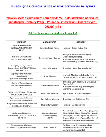 OSIĄGNIĘCIA UCZNIÓW SP 258 W ROKU SZKOLNYM 2012/2013 Największym osiągnięciem uczniów SP 258 było uzyskanie najwyższej punktacji w Dzielnicy Praga - Północ ze sprawdzianu klas szóstych – 28,40 pkt Edukacja wczesnoszkolna – klasy 1 -3 KONKURS ORGANIZATOR Konkurs Recytatorski WARSZAWSKA SYRENKA kl.1-3 Dzielnica Praga-Północ NAGRODY I miejsce - Maria Kuban (3b) II miejsce: Marcin Mukowoz (3a), Luiza Słapczyńska (3d) III miejsce: Zuzanna Zieja (3c), Wiktor Pantchenko (3b), Joanna Czermińska (3e) Konkurs Ortograficzny MISTRZ ORTOGRAFII kl.3 Dzielnica Praga – Północ X Międzyszkolny Konkurs Ortograficzny Z ORTOGRAFIĄ ZA PAN BRAT kl.3 m. st. Warszawa Ogólnopolska Olimpiada OLIMPUSEK (sprawdzian zintegrowany) Firma Olimpus Laureaci: Magdalena Urbańska (1a), Damian Karliński (1d), Piotr Szwech (1d) Konkurs Matematyczny WZOROWY MATEMATYK kl.3 Dzielnica Praga-Północ II miejsce: Leon Osiekowicz (3d), Jakub Pogoda (3e) III miejsce: Michał Boguszewski (3e), Michalina Łapkowska (3e) Ogólnopolski Konkurs Plastyczny POCZTÓWKA Z WAKACJI Klub Kultury Zastów wyróżnienie - A. Dąbkowska (2c) Ogólnowarszawski Konkurs Plastyczny W KRAINIE BIELI Klub Kultury Marysin III miejsce - A. Dąbkowska (2c) X Ogólnopolski Konkurs Plastyczny OZDOBA CHOINKOWA Klub Kultury Zastów I miejsce - A. Dzięcioł (2c) Ogólnopolski Konkurs Z POPRAWNĄ POLSZCZYZNĄ NA CO DZIEŃ Centrum Edukacji Humanistycznej LOGOS Ogólnopolska Olimpiada OLIMPUSEK z języka angielskiego Firma Olimpus III miejsce - Luiza Słapczyńska (3d) Przeszli do II etapu: Anna Kala (2e), Jakub Gilewski (2a), Oliwia Górska (2a), Natalia Nowak (2a), Marek Osęka (2a), Mateusz Gnyszko (2e), Milena Tyszka (2e), Konrad Wrębiak (2f), Oliwier Kupisiński (3e) Dyplomy uznania dla uczestników. Najlepszy wynik w szkole uzyskała Martyna Szpakowska (1e) Międzynarodowy Konkurs KANGUR MATEMATYCZNY Towarzystwo Upowszechniania Wiedzy i Nauk Matematycznych wyróżnienie - Joanna Czermińska (3e) wyróżnienie - Franciszek Wierzbicki (3e) Język polski klasy 4 – 6 KONKURS Konkurs Ortograficzny MISTRZ ORTOGRAFII kl.3 Warszawski Konkurs savoir-vivre Szkolny Konkurs FotograficznoLiteracki „Wspomnienia” ORGANIZATOR NAGRODY I miejsce: Michał Piszczek(6d), II miejsce – Weronika Grodzicka (5c) Dzielnica Praga – Północ III miejsce: Jakub Modrzejewski (4d), Weronika Trojanek (5a) m. st. Warszawa SP nr 258 SP 258 - I miejsce w dzielnicy w kategorii szkół podstawowych I miejsce Julia Woźniak 5a II miejsce Maria Urbanik 5a III miejsce Natalia Powierża 6b Język angielski klasy 4 – 6 KONKURS Ogólnopolski Konkurs z Języka Angielskiego OLIMPUS ORGANIZATOR NAGRODY Firma Olimpus Najlepsze wyniki w szkole: Kosma Mamiński (4), Patrycja Karolak (5), Maksymilian Błaszczyński (6) Historia klasy 4 – 6 KONKURS ORGANIZATOR Konkurs historyczny KRĄG Konkurs Ogólnopolski NAGRODY najlepszy wynik w szkole – Zuzanna Wieczorek (6c), Angelika Kochańska (5a) Przyroda klasy 4 – 6 KONKURS Ogólnopolski Konkurs Geograficzny GEO-PLANETA Konkurs wiedzy o lesie – NIE BĘDZIE NAS, CZY BĘDZIE LAS ORGANIZATOR Stowarzyszenie Upowszechniania Wiedzy i Kultury Regionalnej w Warszawie Pałac Młodzieży Lasy Państwowe Nadleśnictwa Jabłonna NAGRODY Wyróżnienie – Kacper Chętkowski (5d) Do finału zakwalifikowały się: Bianka Lewandowska (6b), Julia Łysiak (6d), Maria Bajor (5a) Ogólnopolski Konkurs Wiedzy na temat zdrowia i jego ochrony MEDITEST II Praski Konkurs Pomocy Przedmedycznej PIĘĆ ZŁOTYCH MINUT Ogólnopolskie Centrum Edukacji Najlepszy wynik w szkole – Maria Kęciek (4b) SP nr 30 Warszawa 14 miejsce (na 26 drużyn) I drużyna: Maria Kęciek (4b), Jakub Modrzejewski (4d), Małgorzata Sulik (6c) 17 miejsce (na 26 drużyn) II drużyna: Mateusz Kunicki (6a), Patryk Napiórkowski (6a), Tomasz Kordylas (6c) Matematyka i informatyka klasy 4 - 6 KONKURS ORGANIZATOR Międzydzielnicowy Matematyczno – Integracyjny Konkurs Szkół MIKS kl.4-6 Szkoła Podstawowa Nr 50 Międzynarodowy Konkurs „Kangur Matematyczny” Towarzystwo Upowszechniania Wiedzy i Nauk Matematycznych Konkurs matematyczny ST@ś XIV LO im. S. Staszica Konkurs matematyczny MAŁY PITAGORAS NA TWARDEJ Dwujęzyczne Gimnazjum Nr 42 Konkurs Matematyczny OLIMPUS Olimpus NAGRODY III miejsce – Sikorska Klara, Natalia Sobieska (5d) Wyróżnienie: Michał Piszczek (6d) Wyróżnienia: Nowak Natalia, Sikorska Klara, Łapkowska Martyna Czermińska Martyna, Wierzbicki Franciszek, Gnyszko Łukasz, Chętkowski Kacper Wyróżnienia: Maria Bajor (5a), Kacper Chętkowski (5d) Najlepsze wyniki w szkole: Kacper Chętkowski (5d), Łukasz Gnyszko (5d), Najlepsze wyniki w szkole: Kacper Chętkowski (5d), Natalia So Maria Bajor (5a), bieska (5d), Sikorska Klara, Bianka Lewandowska (6b) Sztuka klasy 4 - 6 KONKURS Szkolny Konkurs Plastyczny na Karykaturę Historyczną Konkurs plastyczny MOJA ULUBIONA DYSCYPLINA SPORTU LOTNICZEGO ORGANIZATOR NAGRODY Szkoła Podstawowa nr 258 I miejsce Julia Łysiak klasa 6d II miejsce Zuzanna Dębowska klasa 6d II miejsce. Łukasz Gnyszko klasa 5d III miejsce Aleksandra Dąbkowska klasa 2c III miejsce Angelika Kochańska i Wiktoria Widlak klasa 5a Międzynarodowa Federacja LAUREATKA – Alicja Staszewska (6c) Lotnicza FAI Sport klasy 4 – 6 1. Zdobycie przez reprezentację szkoły klas II, III i IV pierwszego miejsca podczas Mistrzostw Dzielnicy Praga Północ w wyścigach rzędów oraz dziesiątego miejsca w Warszawie. 2. Szkoła Podstawowa nr 258 w Mistrzostwach Dzielnicy Praga Północ organizowanych, w ramach XLVI Warszawskiej Olimpiady Młodzieży, przez Wydział Sportu i Rekreacji Dzielnicy Praga Północ w roku szkolnym 2012/2013 w klasyfikacji ogólnej zajęła czwarte miejsce w dzielnicy z dorobkiem 115 punktów. Reprezentacje dziewcząt i chłopców naszej szkoły brały udział w Mistrzostwach Dzielnicy Praga Północ z następującymi rezultatami: DZIEWCZĘTA CHŁOPCY DYSCYPLINA MIEJSCE DYSCYPLINA MIEJSCE Biegi przełajowe I Biegi przełajow