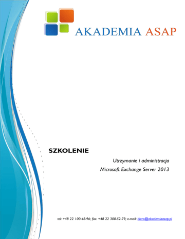 SZKOLENIE Utrzymanie i administracja Microsoft Exchange Server 2013 tel: +48 22 100-48-96; fax: +48 22 300-52-79; e-mail: [email protected] TRENERZY i KONSULTANCI NASZA MISJA DOSTARCZENIE RZETELNEJ INFORMACJI POZWALAJĄCEJ NA ROZWÓJ I PODNIESIENIE POZIOMU DOJRZAŁOŚCI ORGANIZACJI. Stawiamy na kompetencje, jakość i wiarygodność. Mamy doświadczenia praktyczne i aktualną wiedzę. Działamy rzetelnie, szybko i profesjonalnie. DORADCY WIEDZA I UMIEJĘTNOŚCI TO NAJCENNIEJSZY KAPITAŁ KAŻDEJ ORGANIZACJI. to kilkadziesiąt osób z wybitnymi osiągnięciami zarówno w pracy zawodowej (kadra menadżerska, dyrektorzy, osoby zarządzające firmami) jak i przedstawiciele nauki (doktorzy, adiunkci znanych polskich uczelni, szefowie katedr finansów, ekonomii, zarządzania i strategii). W swoich szeregach mamy także osoby znające z własnego doświadczenia instytucje przyznające środki europejskie – one najlepiej wiedzą jak pisać wnioski o dotacje. TRENERZY 2 KONSULTANCI to nasz najbardziej zróżnicowany wiekowo zespół. Mamy analityków, asystentów – ludzi młodych i pełnych energii, całkowicie poświęcających się pracy, która jest ich pasją. Budują oni wciąż swoje kompetencje pod opieką naszych ekspertów czerpiących inspirację z dziesiątek projektów i firm, którym pomagali zrozumieć zachodzące procesy i wdrożyć pożądane zmiany. Cieszymy się także doświadczonym zespołem Kierowników Projektu oraz osób zarządzających Portfelami Projektów – wszyscy mają certyfikaty PRINCE2 lub PMI. największą radość sprawiają nam te chwile, kiedy Klient mówi, że chce nasze szkolenie, ale „koniecznie z tym, wybranym trenerem” – to znacznie więcej niż dobre oceny w ankietach. My z takimi ludźmi właśnie współpracujemy, a osobowości wybitne zatrudniamy na stałe. Atmosfera w Akademii sprzyja wymianie wiedzy, czerpiemy inspiracje z projektów do szkoleń, zaś ze szkoleń przenosimy wiedzę do projektów. To naprawdę działa i nasi Klienci to dostrzegają i z tego korzystają. OFERTA SZKOLENIA PROBLEMY I POTRZEBY ZASPOKAJANE PRZEZ SZKOLENIE Szkolenie skierowane do administratorów systemów pocztowych oraz inżynierów odpowiedzialnych za planowanie, instalację i konfigurację środowisk pocztowych, a także do osób zainteresowanych zdobyciem certyfikatu MCSE: Microsoft Exchange Server 2013. INFORMACJE PODSTAWOWE Wymiar czasowy: 5 dni (35godzin lekcyjnych) Cena za Uczestnika: (dotyczy szkoleń otwartych): 3.400* zł Cena dotyczy przeprowadzenia szkolenia, zapewnienia materiałów szkoleniowych, certyfikatów dla uczestników oraz serwisu kawowego. Nocleg, obiad, parking za dodatkową opłatą. KORZYŚCI WYNIKAJĄCE Z UKOŃCZENIA SZKOLENIA Wiedza i umiejętności umożliwiające instalację, konfigurację i zarządzanie organizacją pocztową opartą o system MS Exchange Server 2013. Szkolenie przygotowuje do egzaminu certyfikacyjnego Microsoft ze ścieżki MCSE: 70-341: Microsoft Exchange Server 2013, Core Solutions. * Cena bez laptopa. Szkolenie z Laptopem: + 990zł/osoba KORZYŚCI WYNIKAJĄCE Z UKOŃCZENIA SZKOLENIA Wiedza i około 2 letnie doświadczenie z zakresu funkcjonowania środowiska MS Windows Server 2003/2008, znajomość usług katalogowych Active Directory, aplikacji Microsoft Office Outlook, zagadnień związanych z siecią, w szczególności znajomość protokołu TCP/IP, usług DNS i IIS oraz protokołów internetowych: SMTP, POP3, IMAP4, NNTP, HTTP lub wiedza z zakresu szkoleń poprzedzających. Ze względu na fakt, że materiały szkoleniowe dostępne są w jezyku angielskim pożądana jest znajomość tego języka w zakresie technicznym. www.akademiaasap.pl 3 PROGRAM TRENINGU Zakres szkolenia Wdrożenie i zarządzanie Microsoft Exchange Server 2013 Planowanie i konfiguracja serwera Mailbox Zarządzanie odbiorcami organizacji Exchange Planowanie i wdrożenie serwerów Client Access Planowanie i konfiguracja dostępu klienckiego Planowanie i konfiguracja transportu wiadomości 4 wymagania dla wdrożenia Exchange Server 2013 procedura wdrożenia Exchange Server 2013 zarządzanie Exchange Server 2013. wprowadzenie do roli serwera Mailbox planowanie wdrożenia serwera Mailbox konfiguracja serwera Mailbox. zarządzanie skrzynkami serwera Exchange 2013 zarządzanie innymi odbiorcami zarządzanie listami adresowymi oraz zasadami. planowanie wdrożenia serwerów Client Access konfigurowanie roli serwera Client Access zarządzanie usługami serwera Client Access. połączenia klienta do serwera Client Access konfiguracja Outlook Web App planowanie i konfiguracja dostępu mobilnego konfiguracja bezpiecznego dostępu do serwera Client Access. omówienie zagadnień transportu i routingu wiadomości planowanie i konfiguracja transportu wiadomości zarządzanie regułami transportowymi. PROGRAM TRENINGU Zakres szkolenia Planowanie i implementacja wysokiej dostępności Planowanie i implementacja Disaster Recovery Planowanie i konfiguracja higieny wiadomości Planowanie i konfiguracja bezpieczeństwa i audytowania Monitorowanie i rozwiązywanie problemów z Microsoft Exchange wysoka dostępność w serwerach Exchange Server 2013 konfiguracja wysokiej dostępności dla serwerów Mailbox konfiguracja wysokiej dostępności dla serwerów Client Access. planowanie zagadnień Disaster Mitigation planowanie i implementacja archiwizacji w Exchange 2013 planowanie i implementacja odtwarzania środowiska i serwerów Exchange 2013. planowanie bezpieczeństwa w zakresie wiadomości implementacja rozwiązań antywirusowych dla Exchange 2013 implementacja rozwiązań antyspamowych dla Exchange 2013. konfiguracja mechanizmu Role Based Access Control konfiguracja audytowania. monitorowanie serwera Exchange 2013 utrzymanie serwera Exchange 2013 rozwiązywanie problemów z Exchange 2013. www.akademiaasap.pl 5 www.akademiaasap.pl