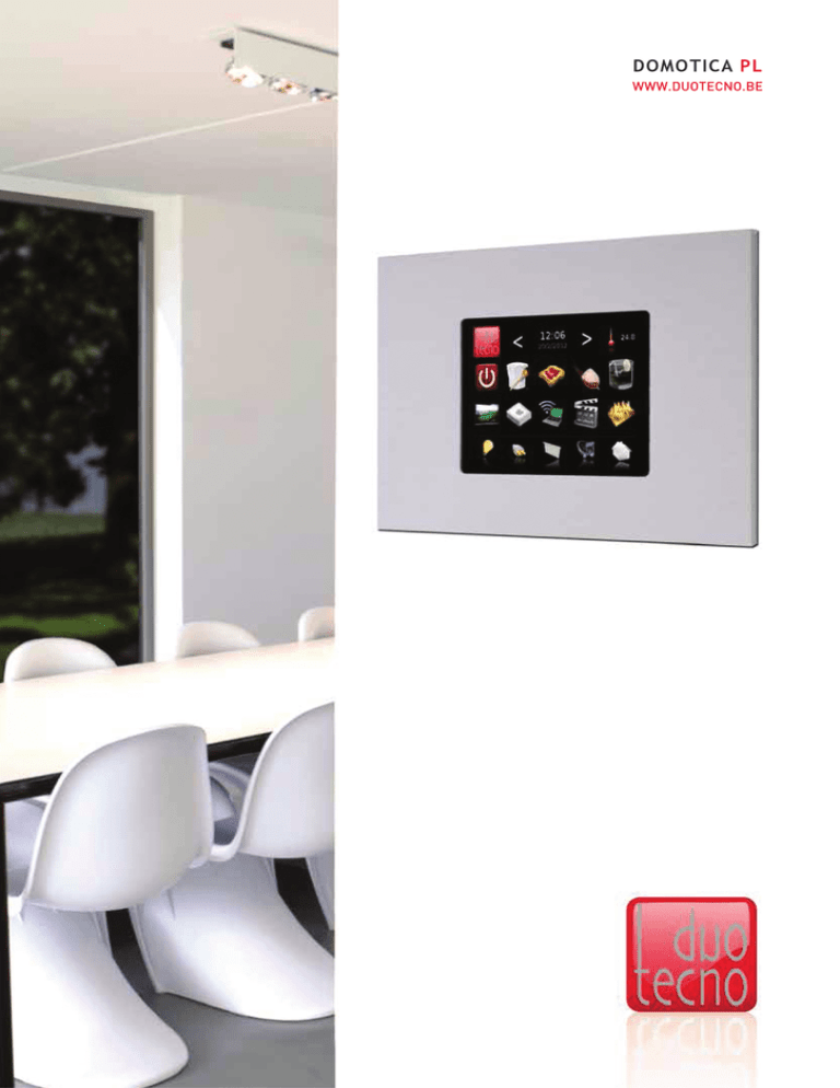 Nasz trzyletni synek uwielbia bawić się wszelkimi przyciskami, które znajdują się w zasięgu rąk. Od telewizora, od DVD, wieży Hi-Fi, przyciskami pilotów, urządzeń AGD itd… Każdy guzik musi przetestować, taki z niego urwis. Zawsze myślałam, że automatyka budynkowa to dalszy ciąg tej zabawy: zabawki dla dorosłych. Wszystko zmieniło się gdy spotkaliśmy ludzi z Duotecno i gdy sama stałam się użytkownikiem tych zabawek dla dużych chłopców. Zagorzałym użytkownikiem, gdyż Duotecno jest czymś o wiele więcej niż tylko kolekcją gadżetów technologicznych. Jako kobieta uważam, że to przede wszystkim praktyczne narzędzie w gospodarstwie domowym. Raz na dwa tygodnie w odwiedziny przyjeżdżają moje starsze dzieci. Na kilka godzin przed ich przybyciem ogrzewanie w ich pokoju i w łazience automatycznie uruchamia się. Dzięki tygodniowemu programowi Duo-tecno możemy ich „gorąco” przyjąć. Ponieważ jestem zatrudniona w telewizji, często pracuję w różnych godzinach. Gdy zdarzy się, że muszę nieoczekiwanie wyjechać, wystarczy mi naciśnięcie jednego przycisku, aby wszystko wyłączyć i mogę pozostawić dom mając spokojną głowę. Automatyka budynkowa jest nie tylko ekonomiczna i komfortowa, istotna jest również ze względu na bezpieczeństwo. Dla Duo-techno stanowi ono wręcz priorytet. Uważam, że to bardzo ważne. Dzięki zintegrowanemu wideofonowi wiem zawsze kto przychodzi w gości. Nawet jeśli nikogo nie ma w domu, można sprawdzić kto stoi przed drzwiami, ponieważ obraz jest natychmiast przekazywany na moją komórkę. Kiedy Leon, nasz najmłodszy syn jeszcze śpi, również korzysta z zalet, jakie oferuje Duotecno. Ponieważ na razie śpi przy otwartych drzwiach, praktycznym okazuje się system zmniejszający automatycznie jasność oświetlenia po godz. 20. Gdy starsza pociecha wstaje nocą do toalety, mały Leon nigdy się nie budzi kiedy czujnik zbliżeniowy włącza oświetlenie. Według mnie Duotecno wytwarza w domu szczególny klimat. Jasność oświetlenia automatycznie zmniejsza się a rolety samoczynnie się opuszczają gdy zaczynamy słuchać nastrojowej muzyki. Wszystko to tworzy intymny nastrój. Wystarczy jednak jedno dotknięcie ekranu lub iPada aby pomieszczenie zostało przygotowane na wizytę licznych gości Duotecno to coś więcej niż koncepcja. To gwarancja dobrego nastroju w domu, a właśnie nastrój cenię sobie szczególnie! 2 3 SPIS TREŚCI 04 WSTĘP 05 MODUŁY NA SZYNĘ DIN 06-09 SMARTBOX – MODUŁ UNIWERSALNY 10-11 PRZYCISKI DOTYKOWE//METAL 12-13 PRZYCISKI DOTYKOWE//SZKŁO 14-15 PRZYCISKI DOTYKOWE//CORIAN 16 PRZYCISKI DOTYKOWE//SYSTEMY MOCOWANIA 17 PRZYCISKI DOTYKOWE Z WYŚWIETLACZEM OLED 18-19 GNIAZDKA 20-21 PANELE DOTYKOWE 22-25 DETEKTORY 26-27 CZUJNIKI WIDEOFONY 28-29 SIEDLE WIDEOFONY 30-31 COMELIT 32-33 34-35 36-37 38-39 40-41 STEROWNIK OGRZEWANIA/ CHŁODZENIA/ WENTYLACJI 42 KONTROLER KNX 43 KONTROLER ALARMU 43 OPROGRAMOWANIE KONFIGURACYJNE 44 OPROGRAMOWANIE PRZYŁĄCZENIOWE 45 OPROGRAMOWANIE DO ZARZĄDZANIA ENERGIĄ 45 SZKOLENIA 46 48-49 50-51 52-53 54-55 56-57 58-59 4 Mając na uwadze ciągły rozwój w dziedzinie automatyki budynkowej, w szczególności w Duotecno, katalog należy traktować jako publikację tymczasową. Za jego pośrednictwem staramy się zaprezentować różnorodne możliwości naszego systemu wraz z całą gamą naszych produktów. Prowadzone przez nas prace badawczo-rozwojowe mają na celu wprowadzanie nowych urządzeń i nowego oprogramowania. Istotne jest zatem, aby regularnie odwiedzać także naszą stronę internetową, która jest stale aktualizowana: www.Duotecno.be. Zachęcamy także do rejestracji w celu otrzymywania biuletynu informacyjnego, aby uzyskiwać osobiście informacje o nowościach. Jako producenci uczestniczymy regularnie w ekspozycjach i organizujemy liczne prezentacje produktów oraz szkolenia. Aby otrzymać zaproszenie, prosimy o kontakt na adres [email protected]. Po ukończeniu dwudniowego szkolenia, jego uczestnik będzie mógł samodzielnie podłączyć się do systemu Duotecno i zaprogramować go. Stawiamy sobie za cel takie ułatwienie pracy instalatorowi, aby mógł on zakończyć proces instalacji tak SZYBKO i ŁATWO jak to możliwe. Nasze oprogramowanie do konfiguracji słynie z resztą z łatwości obsługi. Dzięki jednemu niezależnemu połączeniu konfiguracja postępuje SZYBKO i BEZBŁĘDNIE. Duotecno zapewnia względnie proste programowanie, mimo istnienia wielu możliwości. Będąc instalatorem, architektem czy przedsiębiorcą, jeżeli zależy Ci na uzmysłowieniu klientowi możliwości, jakie oferuje automatyka budynkowa w codziennym życiu, najlepszym rozwiązaniem będzie wspólne odwiedzenie naszego stoiska. W naszych biurach w Brugii albo też w salonie firmowym w Holandii, możemy zademonstrować w sposób przejrzysty każdą funkcję naszego systemu. Możemy tym samym prawdziwie uzmysłowić realne korzyści płynące z automatyki budynkowej: współdziałanie wszystkich aspektów technologicznych budynku i możliwość manipulowania nimi w sposób jasny, widoczny i namacalny. Krótko mówiąc, możemy uczynić życie codzienne przyjemniejszym, prostszym i bardziej komfortowym. Komfortowi temu będzie towarzyszyła oszczędność energii i dłuższa żywotność wszystkich urządzeń technicznych. Dlaczego powinieneś wybrać Duotecno? Są trzy filary do których przywiązujemy duża wagę. Być może Twój klient lub Ty sam, nie orientujesz się dostatecznie w sytuacji ponieważ w ostatnich latach nastąpiła eksplozja wszelkich nowości w dziedzinie inteligentnej automatyki budynkowej. Filar 1: Stabilność i szybkość. Czynnikiem wyróżniającym Duotecno jest wykorzystanie protokołu ultra szybkiej i bardzo stabilnej magistrali CAN, która korzysta z uniwersalnego okablowania i umożliwia wykonywanie wszystkich poleceń w czasie rzeczywistym. Brak klepsydry na ekranie, brak ograniczeń dotyczących strumieniowego przesył