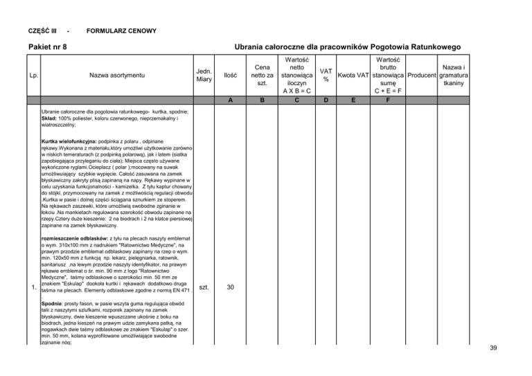 CZĘŚĆ III - FORMULARZ CENOWY Pakiet nr 8 Lp. Ubrania całoroczne dla pracowników Pogotowia Ratunkowego Nazwa asortymentu Jedn. Miary Ilość Cena netto za szt. A B Wartość netto stanowiąca iloczyn AXB=C C Wartość Nazwa i brutto VAT Kwota VAT stanowiąca Producent gramatura % sumę tkaniny C+E=F D E F Ubranie całoroczne dla pogotowia ratunkowego- kurtka, spodnie; Skład: 100% poliester, koloru czerwonego, nieprzemakalny i wiatroszczelny; Kurtka wielofunkcyjna: podpinka z polaru , odpinane rękawy.Wykonana z materiału,który umoŜliwi uŜytkowanie zarówno w niskich temeraturach (z podpinką polarową), jak i latem (siatka zapobiegająca przyleganiu do ciała); Miejsca często uŜywane wykończone ryglami.Ocieplacz ( polar );mocowany na suwak umoŜliwuiający szybkie wypięcie. Całość zasuwana na zamek błyskawiczny zakryty plisą zapinaną na napy. Rękawy wypinane w celu uzyskania funkcjonalności - kamizelka. Z tyłu kaptur chowany do stójki, przymocowany na zamek z moŜliwością regulacji obwodu .Kurtka w pasie i dolnej części ściągana sznurkiem ze stoperem. Na rękawach zaszewki, które umoŜliwią swobodne zginanie w łokciu .Na mankietach regulowana szerokość obwodu zapinane na rzepy.Cztery duŜe kieszenie: 2 na biodrach i 2 na klatce piersiowej zapinane na zamek błyskawiczny. 1. rozmieszczenie odblasków: z tyłu na plecach naszyty emblemat o wym. 310x100 mm z nadrukiem "Ratownictwo Medyczne", na prawym przodzie emblemat odblaskowy zapinany na rzep o wym. min. 120x50 mm z funkcją np. lekarz, pielęgniarka, ratownik, sanitariusz ,na lewym przodzie naszyty identyfikator, na prawym rękawie emblemat o śr. min. 90 mm z logo "Ratownictwo Medyczne", taśmy odblaskowe o szerokości min. 50 mm ze znakiem "Eskulap" dookoła kurtki i rękawach dodatkowo druga taśma na plecach. Elementy odblaskowe zgodne z normą EN 471 . . Spodnie: prosty fason, w pasie wszyta guma regulująca obwód talii z naszytymi szlufkami, rozporek zapinany na zamek błyskawiczny, dwie kieszenie wpuszczane ukośnie z boku na biodrach, jedna kieszeń na prawym udzie zamykana patką, na nogawkach dwie taśmy odblaskowe ze znakiem "Eskulap" o szer. min. 50 mm, kolana wyprofilowane umoŜliwiające swobodne zginanie nóg; szt. 30 39 Kurtka z polaru: polar przystosowany do wpięcia do kurtki całorocznej, zapinana na zamek błyskawiczny, obwód dołu regulowany ściągaczem, kołnierz zakończony wysoką stójką po wewnętrznej stronie wykonany z materiału łatwozmywalnego ,trzy kieszenie wpuszczane zapinane na zamek, jedna na lewej piersi, dwie skośne na biodrach, rozmieszczenie odblasków: na prawym przodzie element odblaskowy z funkcją o wym. min. 120x50 mm, zapinany na rzep, obok naszyty identyfikator, na prawym rękawie naszyty emblemat o śr. min. 90 mm z logo "Ratownictwo Medyczne", na rękawach i z tyłu kurtki naszyta taśma odblaskowa z emblematem "Eskulap" o szer min. 50 mm, z tyłu kurtki przyszyty emblemat o wym. min. 310x100 mm z nadrukiem "Ratownictwo Medyczne", polar o gramaturze min. 300g/m2, Kolorystyka czerwona ze wstawkami granatowymi dotyczy kurtki z polaru, spodni i kurtki całorocznej; moŜliwość prania w temp. 40st., odporność materiału i nici na działanie środków dezynfekcyjnopioracych uŜywanych w szpitalnictwie, elementy odblaskowe do wyŜej wymienionych pozycji zgodne z normą EN 471, wymagany znak CE RAZEM 39