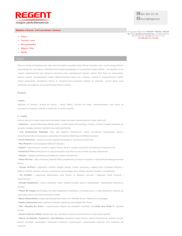 061 851-31-18 [email protected] Majówka w Rzymie - 8 dni (samolotem z Berlina) Oferta Terminy i ceny Mini przewodnik Zdjęcia i filmy Opinie Program Rzym to miasto, do którego przez całe wieki prowadziły wszystkie drogi. Niemal wszystkie ulice i zaułki starego Rzymu przemawiają do nas historią. Architektoniczne dzieła powstawały tu na przestrzeni setek wieków – od republiki, aż do czasów współczesnych były starannie tworzone przez największych artystów historii. Dziś Rzym to nowoczesne, tętniące życiem, niezasypiające miasto. Współczesność miesza się z tradycją i historią w niespotykanych nigdzie indziej proporcjach. Zwiedzanie Rzymu to niezapomniana przygoda idealna na majówkę - ponoć jedno życie człowieka nie wystarczy, by poznać włoską stolicę w całości. Program: 1 dzień: Odprawa na lotnisku i przelot do Rzymu – stolicy Włoch. Transfer do hotelu, zakwaterowanie, czas wolny na korzystanie z lokalnych atrakcji w zależności od godzin przylotu. 2 - 3 dzień: Kolejne dwa dni to czas na poznanie atmosfery miasta oraz jego najważniejszych miejsc, takich jak - Koloseum – symbol Wiecznego Miasta, jeden z cudów świata starożytnego, miejsce, w którym niegdyś odbywały się igrzyska, występy cyrkowe i teatralne oraz walki gladiatorów - Łuk Konstantyna Wielkiego, który jest ostatnim wzniesionym łukiem triumfalnym starożytnego Rzymu, wybudowanym dla uhonorowania zwycięstwa Konstantyna Wielkiego nad Maksencjuszem - Forum Romanum – antyczne centrum spotkań towarzyskich i politycznych Rzymian - Plac Wenecki z zachwycającym Ołtarzem Ojczyzny - Kapitol – najważniejsze z siedmiu wzgórz Rzymu, które w czasach antycznych było głównym miejscem kultu - Fontanna di Trevi, której słynne na cały świat piękno było tłem do wielu filmów czy sesji zdjęciowych - Panteon - najlepiej zachowana pamiątka po czasach starożytnych - Piazza Navona – plac z fontanną Czterech Rzek, przepełniony ulicznymi muzykami i malarzami sprzedającymi swoje obrazy - Campo de’Fiori to najbardziej urokliwy zakątek starego miasta, opisywany niegdyś przez Czesława Miłosza, z targiem kwiatów, warzyw i owoców, a wieczorem zamieniający się w miejsce spotkań turystów i mieszkańców - Via Condotti – najbardziej ekskluzywna ulica Rzymu ze sklepami znanych i lubianych marek włoskich i zagranicznych - Schody Hiszpańskie – znane z pokazów mody i festiwali kwiatów, jedne z najdłuższych i najszerszych schodów w Europie - Piazza del Popolo wyróżniający się dzięki egipskiemu obeliskowi, a powyżej placu, z parku Borghese roztacza się zapierająca dech w piersiach panorama miasta - Muzea Watykańskie z wspaniałą kolekcją dzieł sztuki m.in. Michała Anioła, Rafaela czy Caravaggio - Kaplica Sykstyńska, gdzie podczas konklawe wybierany jest następca Św. Piotra - Plac i Bazylika Św. Piotra – najważniejsze miejsce dla wszystkich katolików oraz Grób Jana Pawła II – papieża Polaka - Zamek i most św. Anioła nazwany tak, aby upamiętnić ukazanie się cherubina na znak końca epidemii - Spacer po dzielnicy Trastevere, czyli Zatybrzu, najstarszej części Rzymu, pełnej brukowanych, wąskich uliczek, starych domostw porośniętych bluszczem, urokliwych restauracyjek, malowniczych skwerów oraz malutkich sal kinowych © Copyright 2003-2016 REGENT TRAVEL GROUP Sp. Z o.o spółka komandytowa, ul. Meliorantów 8, 60-447 Poznań | tel./fax (61) 851-31-18 | [email protected] | Kontakt - Wyspa Tyberyjska z Bazyliką Św. Bartłomieja, gdzie złożone są relikwie męczenników m.in. Św. Wojciecha - Bocca Della Verita – Usta Prawdy będące wyrocznią prawdomówności W przerwach podczas zwiedzania proponujemy czas wolny na posiłek, podczas którego będzie możliwość spróbowania włoskich potraw, takich jak słynne pizze, makarony, cannelloni czy focaccia, a także posmakowania wyśmienitej włoskiej kawy oraz lokalnych win, Campari, Grappy, Martini czy Amaretto (płatne indywidualnie wg zamówienia). Ponadto Rzym oferuje szeroki wybór ciekawych atrakcji dodatkowych, realizowanych fakultatywnie, w zależności od czasu wolnego: - Oceanarium Sea Life - niesamowite, nowoczesne akwarium, w którym żyje około 5000 stworzeń morskich począwszy od koników morskich, meduz i rozgwiazd, aż po wielkie płaszczki i rekiny (ok. 17 euro/os.) - Ogród Zoologiczny Bioparco – działające już ponad sto lat zoo można zwiedzać spacerkiem lub z pokładu kolejki (ok. 15 euro/os.) - Muzeum Leonardo da Vinci z rekonstrukcjami niezwykłych maszyn i pojazdów latających autorstwa renesansowego mistrza (ok. 12 euro/os.) - Time Elevator Experience Roma to ekscytująca podróż, która dzięki technologii cyfrowo-mechanicznej i stereoskopowej, pozwala cofnąć się w czasie i dowiedzieć się więcej o historii, nauce, sztuce i zwyczajach Rzymu (od 12 euro/os.) - Rejs statkiem po Tybrze pozwalający poznać stolicę Włoch z zupełnie innej, równie fascynującej perspektywy (ok. 18 euro/os.) Wieczorami proponujemy słynne włoskie rozrywki, które świetnie oddają ducha miasta: - Centrale Ristotheatre – wyśmienita włoska kolacja serwowana w towarzystwie występów teatralnych, koncertów jazzowych lub przedstawień kabaretowych (ok. 39 euro/os.) - La Rosetta – jedna z najsłynniejszych restauracji w mieście serwująca m.in. wyśmienite owoce morza (płatne indywidualnie wg zamówienia) - Art Cafe Roma – najpopularniejszy i najbardziej ekskluzywny klub, gdzie imprezy rozkręcają światowej sławy DJ-e (płatne indywidualnie wg zamówienia) - Koloseum nocą – niepowtarzalna okazja do spokojnego zbadania zakątków Amfiteatru Flawiuszów z przewodnikiem (ok. 25 euro/os.) - Spektakl w Teatro dell' Opera lub w Teatrze Narodowym (od 40 euro/os.) - Mecz piłkarski – niesamowite wrażenia dla wszystkich fanów ligi włoskiej(od 50 euro/os.) 4 - 7 dzień: Proponujemy jako dni wolne, która można przeznaczyć na zakupy w znanych butik