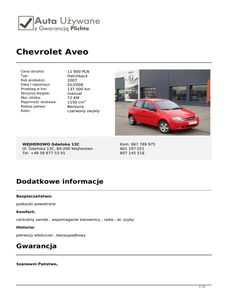 Chevrolet Aveo Cena (brutto) Typ: Rok produkcji: Data I rejestracji: Przebieg w km: Skrzynia biegów: Moc silnika: Pojemność skokowa: Rodzaj paliwa: Kolor: 11 900 PLN Hatchback 2007 01/2008 137 000 km manual 72 KM 1150 cm3 Benzyna czerwony zwykły WEJHEROWO Gdańska 13C Ul. Gdańska 13C, 84-200 Wejherowo Tel. +48 58 677 53 91 Kom. 667 789 975 601 197 021 607 145 518 Dodatkowe informacje Bezpieczeństwo: poduszki powietrzne Komfort: centralny zamek , wspomaganie kierownicy , radio , el. szyby Historia: pierwszy właściciel , bezwypadkowy Gwarancja Szanowni Państwo, 1/2 Pragniemy Państwa poinformować, iż firma Plichta – Autoryzowany Dealer Škoda Auto prowadzi skup oraz sprzedaż samochodów używanych wszystkich marek, oferując także samochody używane z gwarancją objęte programem „Auta używane z Gwarancją Plichta”. W ramach programu „Auta Używane z Gwarancją Plichta ” każdy Klient otrzymuje atrakcyjny pakiet zniżek pozwalający zoptymalizować koszty eksploatacji samochodu: -50% na serwis klimatyzacji -50% na ustawienie zbieżności -50% na kosmetykę auta -50% na ścieżkę diagnostyczną -25% na wymiany oleju -25% na zakup opon + 5zł na sezon za hotelowanie opon -15% na części i akcesoria Oferujemy również kompleksową obsługę w zakresie finansowania i ubezpieczenia: - kredyty już od 4,99% - leasingi i kredyty bez zaświadczeń - uproszczone procedury – decyzja już od 30 min. - atrakcyjne pakiety AC/OC/NW/ASS wiodących firm ubezpieczeniowych Możliwość pozostawienia dotychczas użytkowanego auta w rozliczeniu – BEZPŁATNA WYCENA!!! Zapraszamy wszystkich Klientów na jazdę próbną wybranym autem. Numer oferty: A1011 Informacja nie stanowi oferty w rozumieniu art. 66 KC. Podane dane mają charakter wyłącznie informacyjny. 2/2 Powered by TCPDF (www.tcpdf.org)