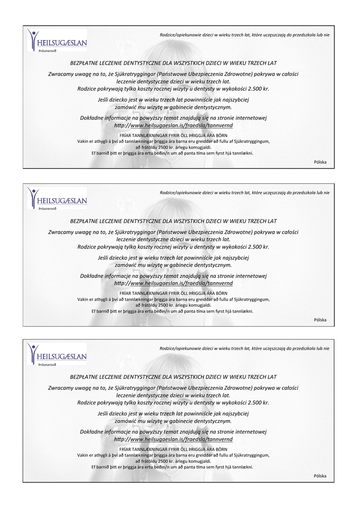 Rodzice/opiekunowie dzieci w wieku trzech lat, które uczęszczają do przedszkola lub nie Þróunarsvið BEZPŁATNE LECZENIE DENTYSTYCZNE DLA WSZYSTKICH DZIECI W WIEKU TRZECH LAT Zwracamy uwagę na to, że Sjúkratryggingar (Państwowe Ubezpieczenia Zdrowotne) pokrywa w całości leczenie dentystyczne dzieci w wieku trzech lat. Rodzice pokrywają tylko koszty rocznej wizyty u dentysty w wykokości 2.500 kr. Jeśli dziecko jest w wieku trzech lat powinniście jak najszybciej zamówić mu wizytę w gabinecie dentystycznym. Dokładne informacje na powyższy temat znajdują się na stronie internetowej http://www.heilsugaeslan.is/fraedsla/tannvernd FRÍAR TANNLÆKNINGAR FYRIR ÖLL ÞRIGGJA ÁRA BÖRN Vakin er athygli á því að tannlækningar þriggja ára barna eru greiddar að fullu af Sjúkratryggingum, að frátöldu 2500 kr. árlegu komugjaldi. Ef barnið þitt er þriggja ára ertu beðin/n um að panta tíma sem fyrst hjá tannlækni. Pólska Rodzice/opiekunowie dzieci w wieku trzech lat, które uczęszczają do przedszkola lub nie Þróunarsvið BEZPŁATNE LECZENIE DENTYSTYCZNE DLA WSZYSTKICH DZIECI W WIEKU TRZECH LAT Zwracamy uwagę na to, że Sjúkratryggingar (Państwowe Ubezpieczenia Zdrowotne) pokrywa w całości leczenie dentystyczne dzieci w wieku trzech lat. Rodzice pokrywają tylko koszty rocznej wizyty u dentysty w wykokości 2.500 kr. Jeśli dziecko jest w wieku trzech lat powinniście jak najszybciej zamówić mu wizytę w gabinecie dentystycznym. Dokładne informacje na powyższy temat znajdują się na stronie internetowej http://www.heilsugaeslan.is/fraedsla/tannvernd FRÍAR TANNLÆKNINGAR FYRIR ÖLL ÞRIGGJA ÁRA BÖRN Vakin er athygli á því að tannlækningar þriggja ára barna eru greiddar að fullu af Sjúkratryggingum, að frátöldu 2500 kr. árlegu komugjaldi. Ef barnið þitt er þriggja ára ertu beðin/n um að panta tíma sem fyrst hjá tannlækni. Pólska Rodzice/opiekunowie dzieci w wieku trzech lat, które uczęszczają do przedszkola lub nie Þróunarsvið BEZPŁATNE LECZENIE DENTYSTYCZNE DLA WSZYSTKICH DZIECI W WIEKU TRZECH LAT Zwracamy uwagę na to, że Sjúkratryggingar (Państwowe Ubezpieczenia Zdrowotne) pokrywa w całości leczenie dentystyczne dzieci w wieku trzech lat. Rodzice pokrywają tylko koszty rocznej wizyty u dentysty w wykokości 2.500 kr. Jeśli dziecko jest w wieku trzech lat powinniście jak najszybciej zamówić mu wizytę w gabinecie dentystycznym. Dokładne informacje na powyższy temat znajdują się na stronie internetowej http://www.heilsugaeslan.is/fraedsla/tannvernd FRÍAR TANNLÆKNINGAR FYRIR ÖLL ÞRIGGJA ÁRA BÖRN Vakin er athygli á því að tannlækningar þriggja ára barna eru greiddar að fullu af Sjúkratryggingum, að frátöldu 2500 kr. árlegu komugjaldi. Ef barnið þitt er þriggja ára ertu beðin/n um að panta tíma sem fyrst hjá tannlækni. Pólska