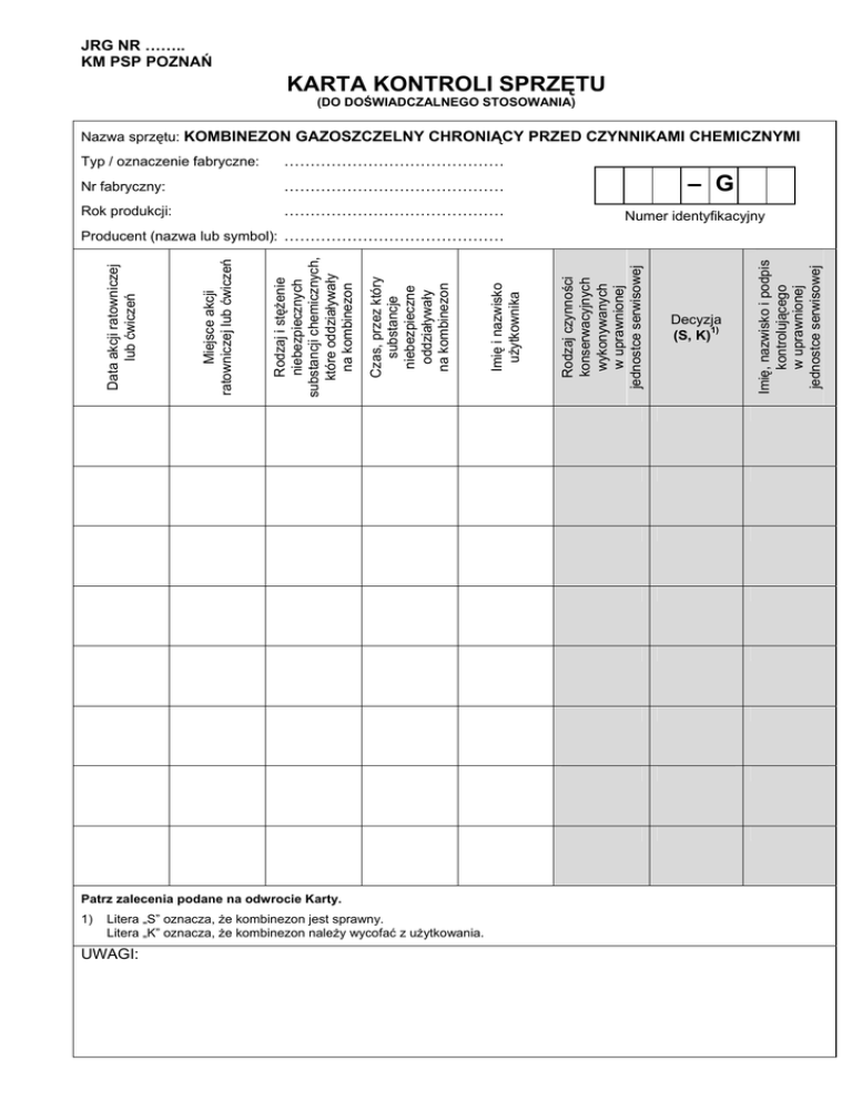 JRG NR …….. KM PSP POZNAŃ KARTA KONTROLI SPRZĘTU (DO DOŚWIADCZALNEGO STOSOWANIA) Nazwa sprzętu: KOMBINEZON GAZOSZCZELNY CHRONIĄCY PRZED CZYNNIKAMI CHEMICZNYMI Typ / oznaczenie fabryczne: …………………………………… Nr fabryczny: …………………………………… Rok produkcji: …………………………………… – G Numer identyfikacyjny Patrz zalecenia podane na odwrocie Karty. 1) Litera „S” oznacza, że kombinezon jest sprawny. Litera „K” oznacza, że kombinezon należy wycofać z użytkowania. UWAGI: Decyzja (S, K)1) Imię, nazwisko i podpis kontrolującego w uprawnionej jednostce serwisowej Rodzaj czynności konserwacyjnych wykonywanych w uprawnionej jednostce serwisowej Imię i nazwisko użytkownika Czas, przez który substancje niebezpieczne oddziaływały na kombinezon Rodzaj i stężenie niebezpiecznych substancji chemicznych, które oddziaływały na kombinezon Miejsce akcji ratowniczej lub ćwiczeń Data akcji ratowniczej lub ćwiczeń Producent (nazwa lub symbol): …………………………………… 1. ZNAKOWANIE Kombinezon powinien być trwale i czytelnie oznakowany numerem identyfikacyjnym (inwentarzowym lub serwisowym). Znakowanie powinno być wykonane w sposób nie utrudniający odczytu znakowania producenta. Znakowanie nie powinno pogarszać cech użytkowych kombinezonu. 2. KONSERWACJA I PRZECHOWYWANIE Przy każdym użyciu kombinezonu, należy dokonać odpowiednich zapisów w Karcie Kontroli, w kolumnach 1 – 5 (kolumny niezaciemnione), w celu rejestracji przebiegu eksploatacji kombinezonu. Kombinezon, po dokonaniu dekontaminacji wstępnej powinien być umieszczony w szczelnym opakowaniu (np. w szczelnym worku plastikowym oraz sztywnym pojemniku) i przekazany wraz z Kartą Kontroli do uprawnionej jednostki serwisowej lub odpowiednio przygotowanej jednostki PSP w celu przeprowadzenia konserwacji (dekontaminacji właściwej, czyszczenia, dezynfekcji, przeglądu, ewentualnej naprawy i sprawdzeniu szczelności). Jednostka ta powinna potwierdzić wykonane czynności konserwacyjne i ocenę kombinezonu, dokonując odpowiednich wpisów w kolumnach 6 – 8 (kolumny zaciemnione) Karty. Następnie kombinezon powinien być przekazany do właściwej jednostki PSP wraz z Kartą Kontroli. Warunki transportowe nie powinny stwarzać możliwości jego uszkodzenia (kombinezon odpowiednio ułożony w czystym plastikowym worku i sztywnym, zamykanym pojemniku). Konserwacja i kontrola kombinezonów nie używanych (znajdujących się w magazynie) powinny odbywać się co 12 miesięcy w uprawnionej jednostce serwisowej lub odpowiednio przygotowanej jednostce PSP. Jeżeli w instrukcji fabrycznej nie zalecono inaczej, przechowywanie należy prowadzić według podanych niżej zasad. Ubrania przechowywane w samochodach pożarniczych powinny być tak złożone, aby nie były pomarszczone, pozałamywane lub zgniecione (np. na skutek ułożenia w zbyt ciasnej skrytce). Kombinezony magazynowane powinny być składowane w pomieszczeniach chłodnych, suchych i zaciemnionych, w ułożeniu zgodnym z instrukcją fabryczną. 3. KONTROLA OKRESOWA I BIEŻĄCA Kontrola okresowa i bieżąca powinna być prowadzona w uprawnionej jednostce serwisowej lub w odpowiednio przygotowanej jednostce PSP, zgodnie z warunkami podanymi w instrukcji fabrycznej oraz pkt.2 Karty.