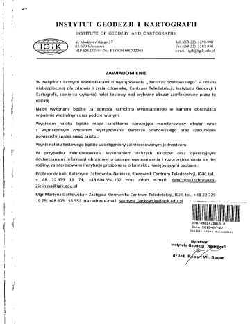 INSTYTUT GEODEZJ7 1 K A R T O G R A F I l INSTITUTE OF GEODESY A N D CARTOGRAPHY ul. Modzelewskicgo 27 02-679 Warszaw'a" NIP 525-000-94-76: RI'GON 000332305 tel.; (48-22) 3291-900 fax: (48-22) 3291-950 c-mail: [email protected] ZAWIADOMIENIE W zwiqzku z licznymi komunikatami o w y s t ^ p o w a n i u „Barszczu Sosnowskiego" - rosliny niebezpiecznej dia zdrowia i zycia cztowieka, Centrum Teledetekcji, Instytutu Geodezji i Kartografii, zamierza wykonac nalot testowy nad wybrany obszar zainfekowany przez tQ rosliny. Nalot wykonany b^dzie za pomocq samolotu wyposazonego w kamer^ obrazujqc^ w pasmie widzialnym oraz podczerwonym. Wynikiem z nalotu wyznaczonym b^dzle mapa obszarem satelitarna wyst^powanla obrazujqca Barszczu monltorowany Sosnowskiego oraz obszar wraz szacunkiem powlerzchni przez niego zaj^tej. Wynik nalotu testowego b^dzie udost^pnlony zainteresowanym j e d n o s t k o m . W przypadku zainteresowania wykonaniem dalszych nalotow oraz operacyjnym dostarczaniem Informacjl obrazowej o zasi^gu wyst^powania I rozprzestrzenlania si^ t e j rosliny, zainteresowane rnstytucje proszone o k o n t a k t z nast^puj^cymi osobami: Profesor dr hab. Katarzyna Dqbrowska-Zleilnska, Kierownik Centrum Teledetekcji, IGiK, t e l . : + 48 22 329 19 74; +48 604 554 162 oraz adres e-mail: Katarzvna.Dabrowska- Zielinska@ifi(k.edu.pl Mgr Martyna Gatkowska - Z a s t ^ p c a Kierownika Centrum Teledetekcji, IGiK, t e l . : +48 22 329 19 75; +48 605 155 553 oraz adres e-mail: Martvna.GatkowskafS)iglk.edu.pi RPU/49824/2015 P Data:2015-07-22 Opolski Urzad WojewodzNi ByFektor I n s t y t u t u Geodezji i Kajtc^ni dr I n i . W*. Bauor INSTYTUT GEODEZJi I KARTOGRAFII INSTITUTE OF GEODESY A N D CARTOGRAPHY ul. Modzclewskiego 27 02-679 Warszawa NIP 525-000-94-76: RI-GON 000332305 IGi K tel.: (48-22) 3291-900 fax: (48-22) 3291-950 e-mail: [email protected] Instytut Geodezji i Kartografii (IGiK) sktada s i ^ z kilku grup badawczych: Centrow, Departamentow oraz Laboratoriow, ktorych zakres dziatalnosci badawczej pokrywa najwazniejsze obszary nauki zwiqzanej z obserwacjq Ziemi. Zagadnieniami z tego zakresu Instytut zajmuje s i ^ od 1976 roku, posiadaj^c w swojej strukturze problematyce Centrum Teledetekcji (CT) IGiK. W Centrum zatrudnieni zakresie interpretacji danych satelitamych oraz prac aplikacyjnych dedykowane specjalisci w i wdrozeniowych zwi^zanych z wykorzystaniem danych satelitamych, klasyfikacj^ danych, modelowaniem procesow srodowiskowych oraz analizami statystycznymi. Centrum Teledetekcji IGiK koncentruje s i ^ na prowadzaniu prac nad wykorzystaniem multispektralnych danych satelitamych oraz ich f u z j ^ z danymi z putapu lotniczego 1 naziemnego. nast^pujqce Tematy badawcze zagadnienia: realizowane klasyfikacj? przez Centrum pokrycia/uzytkowania Teledetekcji terenu pokrywaj^ oraz monitoring i detekcj^ zmian pokrycia/uzytkowania; zastosowanie danych satelitamych oraz lotniczych dia celow rolnictwa, w t y m : prognoza plonow, detekcja suszy, prognoza redukcji plonow wywotana susz^, rozpoznanie upraw, ocena kondycji upraw; szacowanie przeplywu strumieni ciepla i w ^ g l a , szacowanie wilgotnosci gleby oraz jej zmian; monitoring obszarow bagiennych; szacowanie biomasy z roslin energetycznych, biomasa lasow i \s\k oraz zagrozenia srodowiska: powodzie oraz pozary.