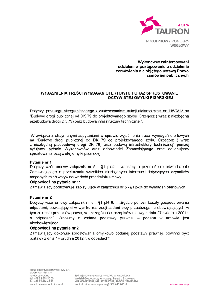 Wykonawcy zainteresowani udziałem w postępowaniu o udzielenie zamówienia nie objętego ustawą Prawo zamówień publicznych WYJAŚNIENIA TREŚCI WYMAGAŃ OFERTOWTCH ORAZ SPROSTOWANIE OCZYWISTEJ OMYŁKI PISARSKIEJ Dotyczy: przetargu nieograniczonego z zastosowaniem aukcji elektronicznej nr 115/A/13 na “Budowę drogi publicznej od DK 79 do projektowanego szybu Grzegorz ( wraz z niezbędną przebudową drogi DK 79) oraz budową infrastruktury technicznej”. W związku z otrzymanymi zapytaniami w sprawie wyjaśnienia treści wymagań ofertowych na “Budowę drogi publicznej od DK 79 do projektowanego szybu Grzegorz ( wraz z niezbędną przebudową drogi DK 79) oraz budową infrastruktury technicznej” poniżej cytujemy pytania Wykonawców oraz odpowiedzi Zamawiającego oraz dokonujemy sprostowania oczywistej omyłki pisarskiej. Pytanie nr 1 Dotyczy wzór umowy załącznik nr 5 - §1 pkt4 – wnosimy o przedłożenie oświadczenie Zamawiającego o przekazaniu wszelkich niezbędnych informacji dotyczących czynników mogących mieć wpływ na wartość przedmiotu umowy. Odpowiedź na pytanie nr 1: Zamawiający podtrzymuje zapisy ujęte w załączniku nr 5 - §1 pkt4 do wymagań ofertowych Pytanie nr 2 Dotyczy wzór umowy załącznik nr 5 - §1 pkt 6. – „Będzie ponosił koszty gospodarowania odpadami, powstającymi w wyniku realizacji zadani przy przestrzeganiu obowiązujących w tym zakresie przepisów prawa, w szczególności przepisów ustawy z dnia 27 kwietnia 2001r. o odpadach”. Wnosimy o zmianę podstawy prawnej – podana w umowie jest nieobowiązująca. Odpowiedź na pytanie nr 2 Zamawiający dokonuje sprostowania omyłkowo podanej podstawy prawnej, powinno być: „ustawy z dnia 14 grudnia 2012 r. o odpadach” Strona 2 z 3 Pytanie nr 3 Dotyczy wzór umowy załącznik nr 5 - §1 pkt. 8. – Wnosimy o usunięcie pkt 8 w całości. Zamawiający winien opisać przedmiot zamówienia w sposób jednoznaczny i wyczerpujący, co oznacza, iż powinien dokonać tego w sposób nie budzący żadnych wątpliwości interpretacyjnych u wykonawców, za pomocą dostarczenia dokładnych i zrozumiałych określeń. Kwestionowany zapis powoduje, że przedmiot zamówienia jest niejednoznaczny, a wykonawca nie jest w stanie w sposób wyczerpujący i dokładny oszacować ryzyka realizacji w szczególności w zakresie poniesionych kosztów. Odpowiedź na pytanie nr 3: Zamawiający podtrzymuje zapisy ujęte w załączniku nr 5 - §1 pkt 8 do wymagań ofertowych. Pytanie nr 4 Dotyczy wzór umowy załącznik nr 5 - §1 pkt 9. – co z umową w przypadku braku tego zlecenia od zamawiającego? Odpowiedź na pytanie nr 4: Zamawiający podtrzymuje zapisy ujęte w załączniku nr 5 - §1 pkt 9. Pytanie nr 5 Dotyczy wzór umowy załącznik nr 5 - §6 pkt 2. – wnosimy o dokładne opisanie zamówienia i obowiązków Wykonawcy w odniesieniu do utrzymania letniego i zimowego. Odpowiedź na pytanie nr 5 Zamawiający podtrzymuje zapisy ujęte w załączniku nr 5 - §6 pkt 2. Pytanie nr 6 Dotyczy wzór umowy załącznik nr 5 - §6 pkt 4. – Wnosimy o usunięcie zapisu – jako niezgodnego z przepisami k. c. Odpowiedź na pytanie nr 6 Zamawiający podtrzymuje zapisy ujęte w załączniku nr 5 - §6 pkt 4. Pytanie nr 7 Dotyczy wzór umowy załącznik nr 5 - §7 pkt 1 – Wnosimy o przedłożenie wszelkich danych w powyższym z zakresie z oświadczeniem Zamawiającego, iż są to pełne dane, określające wszelkie możliwe ryzyka i trudności dotyczące możliwości realizacji zadania inwestycyjnego. Odpowiedź na pytanie nr 7 Zamawiający podtrzymuje zapisy ujęte w załączniku nr 5 - §7 pkt 1 Pytanie nr 8 Dotyczy wzór umowy załącznik nr 5 - §13 pkt 1. – Wnosimy o zmianę z „ opóźnienia” na zwłokę. Wykonawca nie może odpowiedzieć za opóźnienia w dotrzymaniu terminów umownych zależne np. od Zamawiającego. Na poparcie niniejszego stanowiska można wskazać wyrok SN z dnia 17.06.2003r. III CKN 122/1: „Kara umowna ma na celu naprawienie szkody poniesionej przez wierzyciela w skutek niewykonania lub nienależytego wykonania zobowiązania. W art. 483 §1 k.c. wyraźnie umowa jest o naprawieniu szkody, które następuje przez zapłatę kary umownej, a w art. 484 §1 k.c. ustawodawca wskazuje, że kara umowna należy się bez względu na wysokość poniesionej szkody. Ustawowe określenie „bez względu na wysokość poniesionej szkody” nie może być utożsamiane z określeniem „niezależnie od poniesienia szkody”. Ponadto zgodnie z wyrokiem Sądu Najwyższego z dnia 16 stycznia 2013r., sygnatura akt II CSK 331/2012 za opóźnienia, które Strona 3 z 3 są wynikiem złych warunków atmosferycznych w trakcie realizacji kontraktów na roboty budowlane nie powinna być naliczana kara umowna za ren okres. Z sentencji tego wyroku wynika, że zła pogoda wyłącza odpowiedzialność Wykonawcy, skoro nie ma on z tego powodu możliwości ukończenia robót w terminie. Odpowiedź na pytanie nr 8: Zamawiający podtrzymuje zapisy ujęte w załączniku nr 5 - §13 pkt 1. Ponadto Zamawiający pragnie zauważyć, że także w przypadku opóźnienia kara umowna obciąża Wykonawcę w przypadku wystąpienia okoliczności, za które Wykonawca ponosi odpowiedzialność (art 471 k.c.). Ponadto Zamawiający dokonuje sprostowania oczywistej omyłki pisarskiej dotyczącej umowy załącznik nr 5 - §13 pkt 8 wymagań ofertowych. Dotychczasowa treść pkt 8: „Strony ustalają, że Wykonawca zobowiązany będzie do zapłaty na rzecz Zamawiającego kary umownej w przypadku, gdy którakolwiek ze Stron odstąpi od Umowy z przyczyn leżących po stronie Zamawiającego lub gdy Zamawiający odstąpi od Umowy bez uzasadnionej przyczyny – w wysokości stanowiącej równowartość 10 % wynagrodzenia ryczałtowego netto należnego Wykonawcy na podstawie § 4 ust. 1 Umowy”, otrzymuje nowe brzmienie: „Strony Ustalają że Zamawiający zobowiązany będzie do zapłaty na rzecz Wykonawcy kary umowne kary umownej w