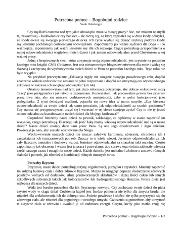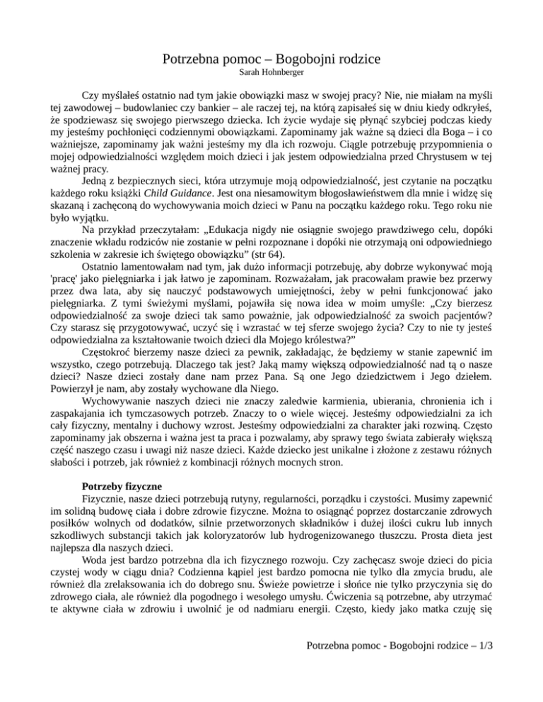 Potrzebna pomoc – Bogobojni rodzice Sarah Hohnberger Czy myślałeś ostatnio nad tym jakie obowiązki masz w swojej pracy? Nie, nie miałam na myśli tej zawodowej – budowlaniec czy bankier – ale raczej tej, na którą zapisałeś się w dniu kiedy odkryłeś, że spodziewasz się swojego pierwszego dziecka. Ich życie wydaje się płynąć szybciej podczas kiedy my jesteśmy pochłonięci codziennymi obowiązkami. Zapominamy jak ważne są dzieci dla Boga – i co ważniejsze, zapominamy jak ważni jesteśmy my dla ich rozwoju. Ciągle potrzebuję przypomnienia o mojej odpowiedzialności względem moich dzieci i jak jestem odpowiedzialna przed Chrystusem w tej ważnej pracy. Jedną z bezpiecznych sieci, która utrzymuje moją odpowiedzialność, jest czytanie na początku każdego roku książki Child Guidance. Jest ona niesamowitym błogosławieństwem dla mnie i widzę się skazaną i zachęconą do wychowywania moich dzieci w Panu na początku każdego roku. Tego roku nie było wyjątku. Na przykład przeczytałam: „Edukacja nigdy nie osiągnie swojego prawdziwego celu, dopóki znaczenie wkładu rodziców nie zostanie w pełni rozpoznane i dopóki nie otrzymają oni odpowiedniego szkolenia w zakresie ich świętego obowiązku” (str 64). Ostatnio lamentowałam nad tym, jak dużo informacji potrzebuję, aby dobrze wykonywać moją 'pracę' jako pielęgniarka i jak łatwo je zapominam. Rozważałam, jak pracowałam prawie bez przerwy przez dwa lata, aby się nauczyć podstawowych umiejętności, żeby w pełni funkcjonować jako pielęgniarka. Z tymi świeżymi myślami, pojawiła się nowa idea w moim umyśle: „Czy bierzesz odpowiedzialność za swoje dzieci tak samo poważnie, jak odpowiedzialność za swoich pacjentów? Czy starasz się przygotowywać, uczyć się i wzrastać w tej sferze swojego życia? Czy to nie ty jesteś odpowiedzialna za kształtowanie twoich dzieci dla Mojego królestwa?” Częstokroć bierzemy nasze dzieci za pewnik, zakładając, że będziemy w stanie zapewnić im wszystko, czego potrzebują. Dlaczego tak jest? Jaką mamy większą odpowiedzialność nad tą o nasze dzieci? Nasze dzieci zostały dane nam przez Pana. Są one Jego dziedzictwem i Jego dziełem. Powierzył je nam, aby zostały wychowane dla Niego. Wychowywanie naszych dzieci nie znaczy zaledwie karmienia, ubierania, chronienia ich i zaspakajania ich tymczasowych potrzeb. Znaczy to o wiele więcej. Jesteśmy odpowiedzialni za ich cały fizyczny, mentalny i duchowy wzrost. Jesteśmy odpowiedzialni za charakter jaki rozwiną. Często zapominamy jak obszerna i ważna jest ta praca i pozwalamy, aby sprawy tego świata zabierały większą część naszego czasu i uwagi niż nasze dzieci. Każde dziecko jest unikalne i złożone z zestawu różnych słabości i potrzeb, jak również z kombinacji różnych mocnych stron. Potrzeby fizyczne Fizycznie, nasze dzieci potrzebują rutyny, regularności, porządku i czystości. Musimy zapewnić im solidną budowę ciała i dobre zdrowie fizyczne. Można to osiągnąć poprzez dostarczanie zdrowych posiłków wolnych od dodatków, silnie przetworzonych składników i dużej ilości cukru lub innych szkodliwych substancji takich jak koloryzatorów lub hydrogenizowanego tłuszczu. Prosta dieta jest najlepsza dla naszych dzieci. Woda jest bardzo potrzebna dla ich fizycznego rozwoju. Czy zachęcasz swoje dzieci do picia czystej wody w ciągu dnia? Codzienna kąpiel jest bardzo pomocna nie tylko dla zmycia brudu, ale również dla zrelaksowania ich do dobrego snu. Świeże powietrze i słońce nie tylko przyczynia się do zdrowego ciała, ale również dla pogodnego i wesołego umysłu. Ćwiczenia są potrzebne, aby utrzymać te aktywne ciała w zdrowiu i uwolnić je od nadmiaru energii. Często, kiedy jako matka czuję się Potrzebna pomoc - Bogobojni rodzice – 1/3 przytłoczona, 15 minutowa przerwa na świeżym powietrzu od moich obowiązków pozwalająca pozbyć się trochę energii jest wszystkim co jest mi potrzebne, nie tylko aby poczuć się bardziej zrelaksowaną, ale również, aby dobrze traktować korzenie mojego stresu: nadmiar energii moich dzieci. Nasze dzieci potrzebują ochrony przed chłodem, poprzez upewnienie się, że są ubrane zdrowo i właściwie, niezależnie od pogody. Co ważniejsze, jaki styl fizycznego życia prowadzimy? Opowiadanie naszym dzieciom, o tym co jest zdrowe, albo nawet dostarczanie im tego, nie będzie tak efektywne jak to, abyśmy sami takie życie prowadzili. Bo czy nie jesteśmy tymi, których one obserwują? To co robimy, więcej niż to co mówimy, wpływa na to kim staną się nasze dzieci. Potrzeby umysłowe Rozwój umysłu, podobnie jak rozwój fizyczny, najlepiej osiągalny jest na zewnątrz – na łonie natury, jak również chronienie przed szkodliwym wpływem takim jak stres, zmartwienia i sztuczna stymulacja. Komputer, telewizor, telefon komórkowy i inne elektroniczne urządzenia są tak bardzo rozpowszechnione w dzisiejszych czasach i w każdym wieku i wszystko to ma wpływ na nasze dzieci. I niestety nie jest to najlepszy wpływ na ich umysłowy rozwój. Wypełnianie umysłu naszych dzieci naturalnymi motywami i dostarczaniem cichego środowiska jest najbardziej sprzyjającym do kształtowania silnego umysłu. Jeżeli często kłócisz się ze swoim współmałżonkiem, albo często wskazujesz negatywne cechy innych, twoje dzieci będą skażone destrukcyjnym wpływem. Czytanie naszym dzieciom, zapamiętywanie Pisma Świętego jako rodzina, śpiewanie pieśni, kultywowanie dziękczynień, oraz szukanie sposobów, aby nieść błogosławieństwo i pomoc innym, dostarcza pewnych ważnych składników w rozwoju umysłów naszych dzieci. Uczenie naszych dzieci codziennych lekcji zależności i zaufania Jezusowi pomoże ustabilizować i wzmocnić ich umysłowe zdolności. Potrzeby duchowe Duchowo, jesteśmy wzorem Chrystusa dla naszych dzieci. Nasze życia mają nauczyć je czegoś o Bogu: Jego s