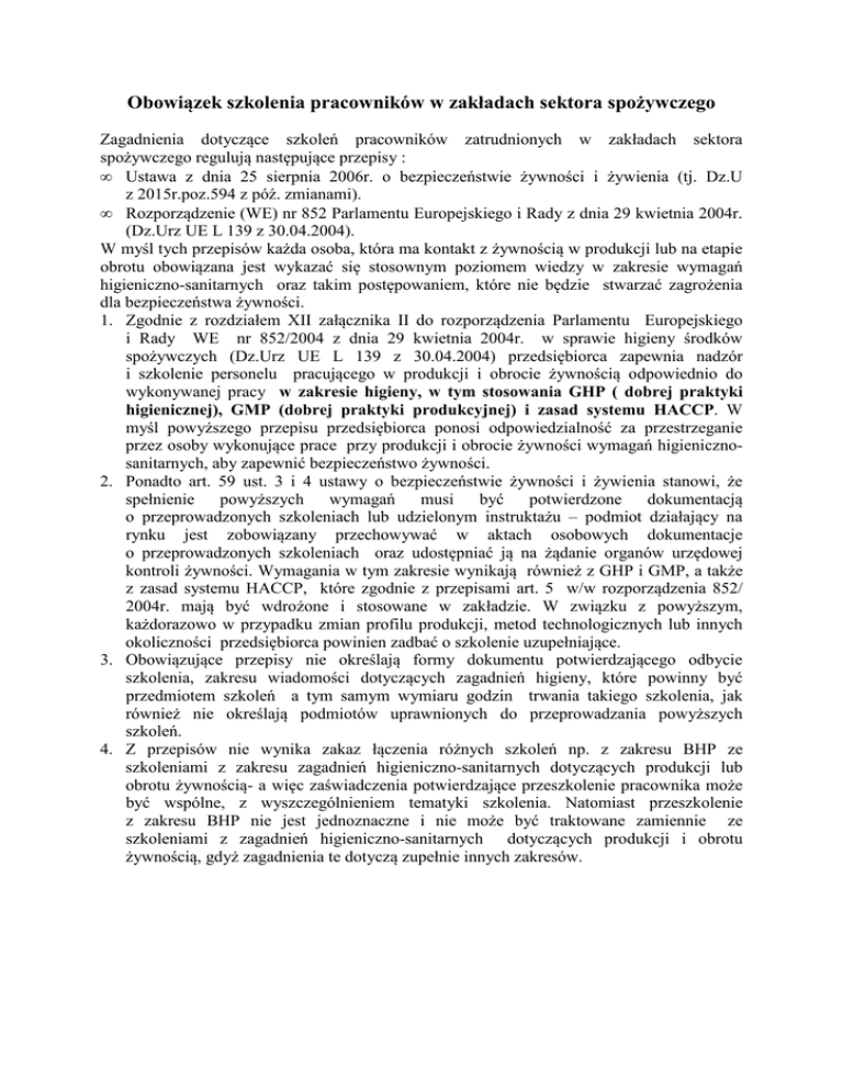 Obowiązek szkolenia pracowników w zakładach sektora spożywczego Zagadnienia dotyczące szkoleń pracowników zatrudnionych w zakładach sektora spożywczego regulują następujące przepisy : • Ustawa z dnia 25 sierpnia 2006r. o bezpieczeństwie żywności i żywienia (tj. Dz.U z 2015r.poz.594 z póź. zmianami). • Rozporządzenie (WE) nr 852 Parlamentu Europejskiego i Rady z dnia 29 kwietnia 2004r. (Dz.Urz UE L 139 z 30.04.2004). W myśl tych przepisów każda osoba, która ma kontakt z żywnością w produkcji lub na etapie obrotu obowiązana jest wykazać się stosownym poziomem wiedzy w zakresie wymagań higieniczno-sanitarnych oraz takim postępowaniem, które nie będzie stwarzać zagrożenia dla bezpieczeństwa żywności. 1. Zgodnie z rozdziałem XII załącznika II do rozporządzenia Parlamentu Europejskiego i Rady WE nr 852/2004 z dnia 29 kwietnia 2004r. w sprawie higieny środków spożywczych (Dz.Urz UE L 139 z 30.04.2004) przedsiębiorca zapewnia nadzór i szkolenie personelu pracującego w produkcji i obrocie żywnością odpowiednio do wykonywanej pracy w zakresie higieny, w tym stosowania GHP ( dobrej praktyki higienicznej), GMP (dobrej praktyki produkcyjnej) i zasad systemu HACCP. W myśl powyższego przepisu przedsiębiorca ponosi odpowiedzialność za przestrzeganie przez osoby wykonujące prace przy produkcji i obrocie żywności wymagań higienicznosanitarnych, aby zapewnić bezpieczeństwo żywności. 2. Ponadto art. 59 ust. 3 i 4 ustawy o bezpieczeństwie żywności i żywienia stanowi, że spełnienie powyższych wymagań musi być potwierdzone dokumentacją o przeprowadzonych szkoleniach lub udzielonym instruktażu – podmiot działający na rynku jest zobowiązany przechowywać w aktach osobowych dokumentacje o przeprowadzonych szkoleniach oraz udostępniać ją na żądanie organów urzędowej kontroli żywności. Wymagania w tym zakresie wynikają również z GHP i GMP, a także z zasad systemu HACCP, które zgodnie z przepisami art. 5 w/w rozporządzenia 852/ 2004r. mają być wdrożone i stosowane w zakładzie. W związku z powyższym, każdorazowo w przypadku zmian profilu produkcji, metod technologicznych lub innych okoliczności przedsiębiorca powinien zadbać o szkolenie uzupełniające. 3. Obowiązujące przepisy nie określają formy dokumentu potwierdzającego odbycie szkolenia, zakresu wiadomości dotyczących zagadnień higieny, które powinny być przedmiotem szkoleń a tym samym wymiaru godzin trwania takiego szkolenia, jak również nie określają podmiotów uprawnionych do przeprowadzania powyższych szkoleń. 4. Z przepisów nie wynika zakaz łączenia różnych szkoleń np. z zakresu BHP ze szkoleniami z zakresu zagadnień higieniczno-sanitarnych dotyczących produkcji lub obrotu żywnością- a więc zaświadczenia potwierdzające przeszkolenie pracownika może być wspólne, z wyszczególnieniem tematyki szkolenia. Natomiast przeszkolenie z zakresu BHP nie jest jednoznaczne i nie może być traktowane zamiennie ze szkoleniami z zagadnień higieniczno-sanitarnych dotyczących produkcji i obrotu żywnością, gdyż zagadnienia te dotyczą zupełnie innych zakresów. PRÓBKI KONTROLNE POSIŁKÓW Państwowy Powiatowy Inspektor Sanitarny w Kluczborku zwraca uwagę, że zgodnie z art. 72 ustawy z dnia 25 sierpnia 2006r. o bezpieczeństwie żywności i żywienia (Dz.U Nr 171, poz. 1225 ) zakłady żywienia zbiorowego typu zamkniętego mają obowiązek przechowywać próbki wszystkich potraw wchodzących w skład każdego posiłku zgodnie z przepisami rozporządzenia Ministra Zdrowia z dnia 17 kwietnia 2007r. w sprawie pobierania i przechowywania próbek żywności przez zakłady żywienia zbiorowego typu zamkniętego (Dz,U Nr 80,poz. 545 ) oraz udostępniać pobrane próbki organom Państwowej Inspekcji Sanitarnej. Przepisy § 3 w/w rozporządzenia stanowią, że próbki każdej składowej części potrawy z partii żywności pobierane są pod koniec porcjowania w ilościach niezbędnych do przeprowadzenia badań laboratoryjnych, przy czym nie mniej niż 150 g w przypadku zup, mięsa, potraw mięsnych i rybnych, wędlin, potraw mięsnych i rybnych, wędlin i wyrobów wędliniarskich (w jednym kawałku ), warzyw gotowanych, sosów, potraw mącznych oraz mlecznych, wyrobów garmażeryjnych, sałatek oraz lodów. Przepis powyższy należy interpretować w ten sposób, że próbki powinny być pobierane wyłącznie z potraw i wyrobów przygotowywanych w zakładzie takich jak kotlet, zupa, surówka, a nie z każdego gotowego produktu zastosowanego do jego przygotowania np. jajko, dżem, pieczywo czy wędlina. Powyższe przepisy nakładają obowiązek pobierania i przechowywania próbek przez zakład prowadzący produkcje i obrót żywnością. W związku z powyższym, jeżeli producentem posiłków jest firma cateringowa a nie szpital, przedszkole, zakład pracy lub inny zakład żywienia typu zamkniętego, na firmie cateringowej spoczywa obowiązek pobierania i przechowywania próbek i takiego zorganizowania prowadzonej działalności, aby obowiązek został spełniony. Jeżeli próbki będą pobierane po porcjowaniu posiłków w firmie cateringowej mogą być po odpowiednim zabezpieczeniu przechowywane w tej firmie albo przywożone razem z posiłkami np. do szpitala, w którym powinny być przechowywane zgodnie z wymaganiami określonymi w ww rozporządzeniu. Jeśli jednak porcjowanie posiłków odbywa się w szpitalu, to próbki powinny być pobierane po ich przywiezieniu do szpitala i po porcjowaniu, a dopiero potem po ich odpowiednim zabezpieczeniu mogą być przewiezione do firmy cateringowej lub pozostawione na miejscu w szpitalu. Kwestie związane z ustaleniami w tym zakresie powinny być wyraźnie określone w umowie zawartej pomiędzy firmą cateringową a danym podmiotem. W przypadku, gdyby w placówkach żywienia zbiorowego były wykonywane czynności związane z przygotowywaniem posiłków, czyli z produkcją, podmioty te musiał