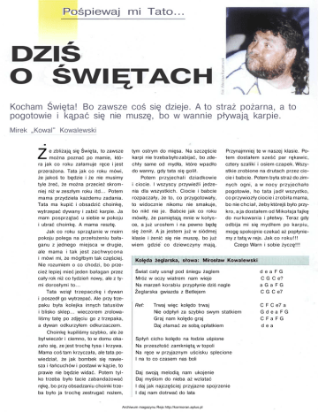 Pośpiewaj mi Tato... DZIŚ O ŚWIĘTACH Kocham Święta! Bo zawsze coś się dzieje. A to straż pożarna, a to pogotowie i kąpać się nie muszę, bo w wannie pływają karpie. Mirek „Kowal" Kowalewski • e zbliżają się Święta, to zawsze można poznać po mamie, która jak co roku załamuje ręce i jest przerażona. Tata jak co roku mówi, że jakoś to będzie i że nie musimy tyle żreć, że można przecież skromniej niż w zeszłym roku itd... Potem mama przydziela każdemu zadania. Tata ma kupić i obsadzić choinkę, wytrzepać dywany i zabić karpie. Ja mam posprzątać u siebie w pokoju i ubrać choinkę. A mama resztę. Jak co roku sprzątanie w rnoirn pokoju polega na przełożeniu bałaganu z jednego miejsca w drugie, ale mama i tak jest zachwycona i mówi mi, że mógłbym tak częściej. Nie rozumiem o co chodzi, bo przecież lepiej mieć jeden bałagan przez cały rok niż co tydzień nowy, ale z tymi dorosłymi to... Tata wziął trzepaczkę i dywan i poszedł go wytrzepać. Ale przy trzepaku była kolejka innych tatusiów i blisko sklep... wieczorem zrolowaliśmy tatę po zdjęciu go z trzepaka, a dywan odkurzyłem odkurzaczem. Choinkę kupiliśmy szybko, ale że był wieczór i ciemno, to w domu okazało się, ze jest trochę łysa i krzywa. Mama coś tam krzyczała, ale tata powiedział, że jak bombek się nawiesza i łańcuchów i postawi w kącie, to prawie nie będzie widać. Potem tylko trzeba było tacie zabandażować rękę, bo przy obsadzaniu choinki trzeba było ja trochę zestrugać nożem, Z tym ostrym do mięsa. Na szczęście karpi nie trzeba było zabijać, bo zdechły same od mydła, które wpadło do wanny, gdy tata się golił. Potem przyjechali dziadkowie i ciocie. l wszyscy przywieźli jedzenia dla wszystkich. Ciocie i babcie rozpaczały, że to, co przygotowały, to widocznie nikomu nie smakuje, bo nikt nie je. Babcie jak co roku mówiły, że pamiętają mnie w kołysce, a już urosłem i na pewno będę się żenił. A ja jestem już w siódmej klasie i żenić się nie muszę, bo już wiem gdzie co dziewczyny mają. Przynajmniej te w naszej klasie. Potem dostałem sześć par rękawic, cztery szaliki i osiem czapek. Wszystkie zrobione na drutach przez ciocie i babcie. Potem była straż do zimnych ogni, a w nocy przyjechało pogotowie, ho tata jadł wszystko, co przywiozły ciocie i zrobiła mama, bo nie chciał, żeby którejś było przykro, a ja dostałem od Mikołaja fajkę do nurkowania i płetwy. Teraz gdy odbija mi się mydłem po karpiu, mogę spokojnie czekać aż popłyniemy z tatą w rejs. Jak co roku!!! Czego Warn i sobie życzę!!! Kolęda żeglarska, słowa: Mirosław Kowalewski Świat caty usnął pod śniegu żaglem Mróz w oczy wiatrem nam wieje Na marzeń korabiu przypłynie dziś nagle Żeglarska gwiazda z Betlejem dea FG C G C e? aGa FG C G C e7 Ref: C G C d Trwaj więc kolędo trwaj Nie odpłyń za szybko swym statkiem Graj nam kolędo graj Daj złamać ze sobą opłatkiem Spłyń cicho kolędo na łodzie uśpione Na przeszłość zamkniętą w topoli Na ręce w przyjaznym uścisku splecione l na to co czasem nas boli Daj swoją melodią nam ukojenie Daj myślom do nieba aż wzlatać l daj jak najczęściej przyjazne spojrzenie l daj nam dotrwać do lata Archiwum magazynu Rejs http://kormoran.aplus.pl F d F e C e7 a ea FG aFG a muzyka: Mirosław Kowalewski Archiwum magazynu Rejs http://kormoran.aplus.pl