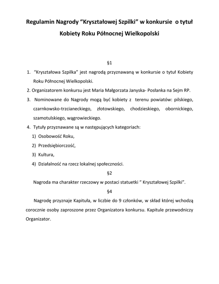 Regulamin Nagrody “Kryształowej Szpilki” w konkursie o tytuł Kobiety Roku Północnej Wielkopolski §1 1. “Kryształowa Szpilka” jest nagrodą przyznawaną w konkursie o tytuł Kobiety Roku Północnej Wielkopolski. 2. Organizatorem konkursu jest Maria Małgorzata Janyska- Posłanka na Sejm RP. 3. Nominowane do Nagrody mogą być kobiety z terenu powiatów: pilskiego, czarnkowsko-trzcianeckiego, złotowskiego, chodzieskiego, obornickiego, szamotulskiego, wągrowieckiego. 4. Tytuły przyznawane są w następujących kategoriach: 1) Osobowość Roku, 2) Przedsiębiorczość, 3) Kultura, 4) Działalność na rzecz lokalnej społeczności. §2 Nagroda ma charakter rzeczowy w postaci statuetki “ Kryształowej Szpilki”. §4 Nagrodę przyznaje Kapituła, w liczbie do 9 członków, w skład której wchodzą corocznie osoby zaproszone przez Organizatora konkursu. Kapitule przewodniczy Organizator. §5 Kapituła przyznaje Nagrodę na wniosek: 1) organów administracji publicznej, 2) organizacji pozarządowych, 3) organizacji samorządu gospodarczego i podmiotów gospodarczych, 4) szkół i uczelni wyższych. §6 1. Wniosek o przyznanie Nagrody został określony na załączniku nr 1 i powinien zawierać: 1) kategorię, do której kandydatka jest zgłaszana, 2) dane kandydatki: imię i nazwisko/nazwa firmy, instytucji, organizacji pozarządowej, adres, dane kontaktowe, 3) dane wnioskodawcy: nazwę wnioskodawcy, adres, dane kontaktowe, 4) informację o szczególnych osiągnięciach, sukcesach lub informację dotyczącą całokształtu dotychczasowej działalności artystycznej, społecznej, innej, które skutkują w zawodowej, rozwoju gospodarczym, społecznym i promocji Północnej Wielopolski, 6) uzasadnienie wniosku, 7) datę oraz podpis wnioskodawcy. 2. W razie stwierdzenia braków formalnych wnioskodawca jest zobowiązany do ich usunięcia w terminie 3 dni od dnia powiadomienia. 3. Wniosek pozostawia się bez rozpatrzenia w przypadku: a. złożenia po terminie; b. wycofania przez wnioskodawcę; c. braków formalnych, jeżeli nie usunięto ich w terminie. 4. Wnioski składane są w terminie podawanym rokrocznie w zaproszeniu do składania wniosków, które jest ogłaszane publicznie i przesyłane do podmiotów administracji publicznej, samorządów gospodarczych, organizacji pozarządowych w wskazanych powiatach. 5. Osoba nominowana do Nagrody może być zgłoszona tylko do jednej kategorii. §7 Nagrody wręczane będą na uroczystej gali organizowanej raz do roku w Pile.