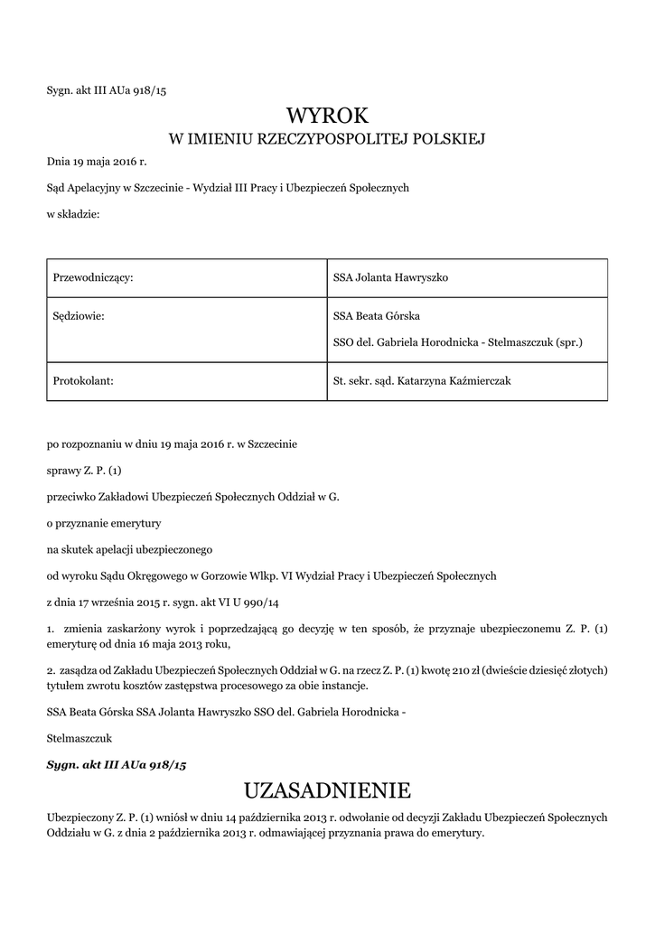 Sygn. akt III AUa 918/15 WYROK W IMIENIU RZECZYPOSPOLITEJ POLSKIEJ Dnia 19 maja 2016 r. Sąd Apelacyjny w Szczecinie - Wydział III Pracy i Ubezpieczeń Społecznych w składzie: Przewodniczący: SSA Jolanta Hawryszko Sędziowie: SSA Beata Górska SSO del. Gabriela Horodnicka - Stelmaszczuk (spr.) Protokolant: St. sekr. sąd. Katarzyna Kaźmierczak po rozpoznaniu w dniu 19 maja 2016 r. w Szczecinie sprawy Z. P. (1) przeciwko Zakładowi Ubezpieczeń Społecznych Oddział w G. o przyznanie emerytury na skutek apelacji ubezpieczonego od wyroku Sądu Okręgowego w Gorzowie Wlkp. VI Wydział Pracy i Ubezpieczeń Społecznych z dnia 17 września 2015 r. sygn. akt VI U 990/14 1. zmienia zaskarżony wyrok i poprzedzającą go decyzję w ten sposób, że przyznaje ubezpieczonemu Z. P. (1) emeryturę od dnia 16 maja 2013 roku, 2. zasądza od Zakładu Ubezpieczeń Społecznych Oddział w G. na rzecz Z. P. (1) kwotę 210 zł (dwieście dziesięć złotych) tytułem zwrotu kosztów zastępstwa procesowego za obie instancje. SSA Beata Górska SSA Jolanta Hawryszko SSO del. Gabriela Horodnicka Stelmaszczuk Sygn. akt III AUa 918/15 UZASADNIENIE Ubezpieczony Z. P. (1) wniósł w dniu 14 października 2013 r. odwołanie od decyzji Zakładu Ubezpieczeń Społecznych Oddziału w G. z dnia 2 października 2013 r. odmawiającej przyznania prawa do emerytury. Zakład Ubezpieczeń Społecznych wniósł o oddalenie odwołania podnosząc, że ubezpieczony nie udokumentował wymaganych 15 lat pracy w szczególnych warunkach. Sąd Okręgowy - Sąd Pracy i Ubezpieczeń Społecznych w Gorzowie Wielkopolskim wyrokiem z dnia 7 stycznia 2014 r. zmienił zaskarżoną decyzję i przyznał ubezpieczonemu prawo do emerytury od dnia 16 maja 2013 r. poczynając. W uzasadnieniu wyroku Sąd Okręgowy stwierdził, że ubezpieczony w okresie od 31 października 1980 r. do 2 grudnia 1991 r. świadczył pracę w szczególnych warunkach w Usługowo - (...) w S. na stanowisku kierowcy samochodu ciężarowego o dopuszczalnym ciężarze całkowitym powyżej 3,5 tony. Praca ta, wraz z okresem pracy w szczególnych warunkach przez 6 lat, 4 miesięcy i 25 dni uznanym przez pozwanego dała, zdaniem tego Sądu, podstawę do przyjęcia, iż spełnia on warunki do przyznania prawa do emerytury. Na skutek wniesionej przez pozwanego apelacji Sąd Apelacyjny w Szczecinie wyrokiem z dnia 30 października 2014 r. uchylił zaskarżony wyrok i przekazał do ponownego rozpoznania Sądowi Okręgowemu w Gorzowie. W uzasadnieniu wyroku Sąd Apelacyjny stwierdził, że sąd I instancji dostatecznie nie rozstrzygnął czy w dacie 1 stycznia 1999 r. ubezpieczony legitymował się wymaganym ustawą stażem 15 lat pracy w szczególnych warunkach. Postępowanie dowodowe przeprowadzone przez ten Sąd było zbyt pobieżne przez co zaniechał on ustalenia okoliczności istotnych dla rozstrzygnięcia, tym samym nie rozpoznał istoty sprawy. Sąd Apelacyjny zalecił sądowi pierwszej instancji przy ponownym rozpoznaniu sprawy zwrócenie się do właściwego wojewody i do Krajowej Rady Spółdzielczej o informacje na temat miejsca przechowywania akt osobowych, do właściwego wydziału sądu o nadesłanie akt rejestrowych spółdzielni, ustalenie w Urzędzie Miasta i Gminy w S. jaką liczbę samochodów i jakiego typu posiadała spółdzielnia zatrudniająca ubezpieczonego w spornym okresie oraz zobowiązanie strony do ewentualnego wskazania niezbędnych wniosków dowodowych. Wyrokiem z dnia 17 września 2015 roku Sąd Okręgowy w Gorzowie Wielkopolskim VI Wydział Pracy i Ubezpieczeń Społecznych oddalił odwołanie. Sąd Okręgowy oparł swoje rozstrzygnięcie na następujących ustaleniach faktycznych i rozważaniach prawnych: Ubezpieczony Z. P. (1) urodził się w dniu (...) Posiada on wykształcenie podstawowe. W dniu 14 grudnia 1972 r. zawarł umowę o pracę z Usługowo - (...) w S. na stanowisku pomocnika stolarza. Pracę wykonywał do 16 marca 1973 r. W zakładzie tym został ponownie zatrudniony w dniu 24 lipca 1974 r. w pełnym wymiarze czasu pracy na stanowisku pomocnika stolarza, następnie na stanowisku kierowcy, a ostatnio na stanowisku mechanika - kierowcy, na którym otrzymywał między innymi premię za remonty w wysokości do 30%. Pozostawał w zatrudnieniu do 2 grudnia 1991 r. Ubezpieczony korzystał z urlopów bezpłatnych od 1 maja 1990 r. do 9 lipca 1990 r., od 4 sierpnia 1990 r. do 15 grudnia 1990 r., od 23 września 1991 r. do 31 października 1991 r. W dniu 17 maja 1977 roku ubezpieczony uzyskał uprawnienia do prowadzenia samochodów o dopuszczalnym ciężarze całkowitym do 3,5 tony, a w dniu 31 października 1980 r. do prowadzenia samochodów ciężarowych o dopuszczalnym ciężarze całkowitym powyżej 3,5 tony. Ubezpieczony posiada 25 lat okresów składkowych i nieskładkowych ubezpieczenia. Pozwany uznał ubezpieczonemu staż pracy w szczególnych warunkach w wymiarze 6 lat, 4 miesięcy i 25 dni. Sąd Okręgowy uznał, że okazało się nieuzasadnione, podnosząc, iż zgodnie z art. 184 ust. 1 i 2 ustawy z dnia 17.12.1998 r. o emeryturach i rentach z Funduszu Ubezpieczeń Społecznych ( tekst jednolity Dz. Ust z 2015 r. poz. 748 ) ubezpieczonym urodzonym po dniu 31 grudnia 1948 r. przysługuje emerytura po osiągnięciu wieku przewidzianego w art. 32, 33, 39 i 40, jeżeli w dniu wejścia w życie ustawy osiągnęli: 1) okres zatrudnienia w szczególnych warunkach lub w szczególnym charakterze wymaganym w przepisach dotychczasowych do nabycia prawa do emerytury w wieku niższym niż 60 lat - dla kobiet i 65 lat - dla mężczyzn oraz 2) okres składkowy i nieskładkowy, o którym mowa w art. 27. Emerytura, o której mowa w ust. 1, przysługuje pod warunkiem nieprzystąpienia do otwartego funduszu emerytalnego albo złożenia wniosku o przekazanie środków zgromadzonych na rachunku w otwartym funduszu emerytalnym, za pośrednictwem Zakładu, na dochody budżetu państwa. Sąd pierwszej instancji wskazał, że stosownie do treści ar
