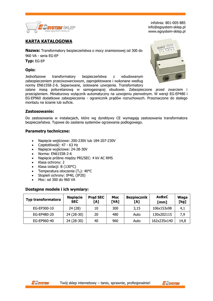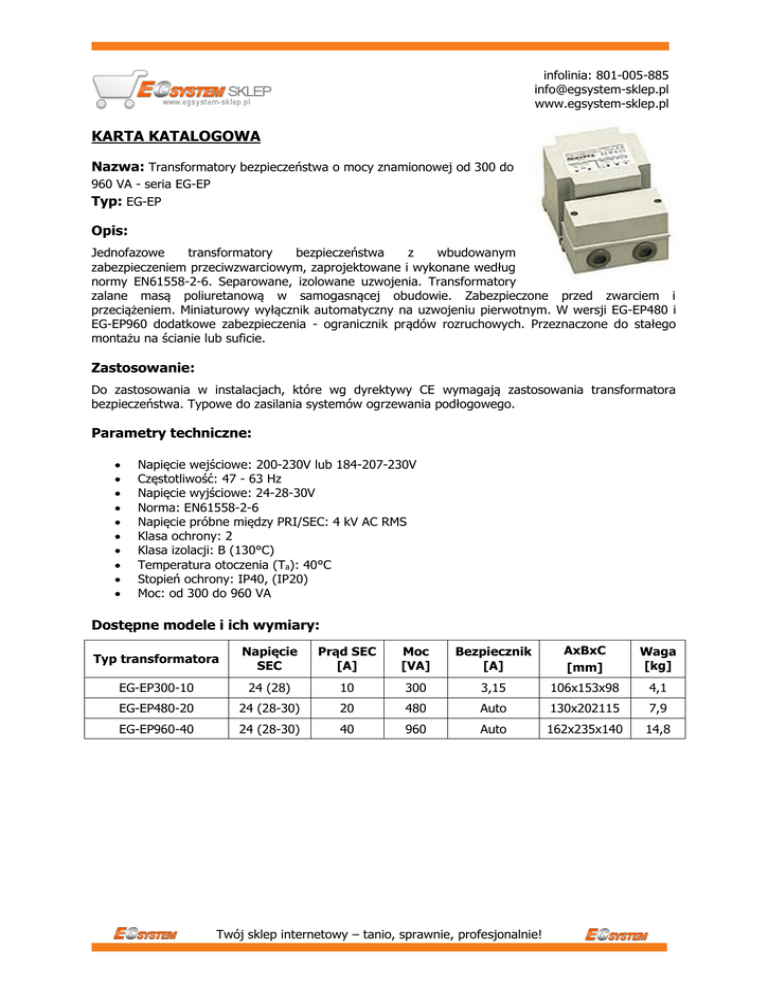 infolinia: 801-005-885 [email protected] www.egsystem-sklep.pl KARTA KATALOGOWA Nazwa: Transformatory bezpieczeństwa o mocy znamionowej od 300 do 960 VA - seria EG-EP Typ: EG-EP Opis: Jednofazowe transformatory bezpieczeństwa z wbudowanym zabezpieczeniem przeciwzwarciowym, zaprojektowane i wykonane według normy EN61558-2-6. Separowane, izolowane uzwojenia. Transformatory zalane masą poliuretanową w samogasnącej obudowie. Zabezpieczone przed zwarciem i przeciążeniem. Miniaturowy wyłącznik automatyczny na uzwojeniu pierwotnym. W wersji EG-EP480 i EG-EP960 dodatkowe zabezpieczenia - ogranicznik prądów rozruchowych. Przeznaczone do stałego montażu na ścianie lub suficie. Zastosowanie: Do zastosowania w instalacjach, które wg dyrektywy CE wymagają zastosowania transformatora bezpieczeństwa. Typowe do zasilania systemów ogrzewania podłogowego. Parametry techniczne: Napięcie wejściowe: 200-230V lub 184-207-230V Częstotliwość: 47 - 63 Hz Napięcie wyjściowe: 24-28-30V Norma: EN61558-2-6 Napięcie próbne między PRI/SEC: 4 kV AC RMS Klasa ochrony: 2 Klasa izolacji: B (130°C) Temperatura otoczenia (Ta): 40°C Stopień ochrony: IP40, (IP20) Moc: od 300 do 960 VA Dostępne modele i ich wymiary: Typ transformatora Napięcie SEC Prąd SEC [A] Moc [VA] Bezpiecznik [A] AxBxC [mm] Waga [kg] EG-EP300-10 24 (28) 10 300 3,15 106x153x98 4,1 EG-EP480-20 24 (28-30) 20 480 Auto 130x202115 7,9 EG-EP960-40 24 (28-30) 40 960 Auto 162x235x140 14,8 Twój sklep internetowy – tanio, sprawnie, profesjonalnie! infolinia: 801-005-885 [email protected] www.egsystem-sklep.pl Rysunek techniczny: Układ połączeń: EG-EP300-10 Układ połączeń: EG-EP480-20 i EG-EP960-40 Twój sklep internetowy – tanio, sprawnie, profesjonalnie!