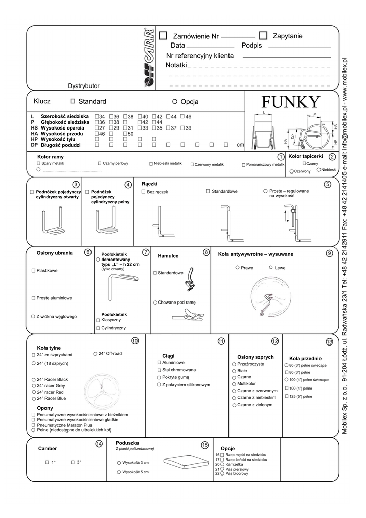 Zapytanie Zamówienie Nr Data Nr referencyjny klienta Notatki Dystrybutor Klucz Standard FUNKY Opcja Szerokość siedziska Głębokość siedziska Wysokość oparcia Wysokość przodu Wysokość tyłu Długość podudzi Kolor tapicerki Kolor ramy Szary metalik Czarny perłowy Niebieski metalik Czerwony metalik Czarny Pomarańczowy metalik Czerwony Niebieski Rączki PodnóŜek pojedynczy cylindryczny otwarty PodnóŜek pojedynczy cylindryczny pełny Osłony ubrania Podłokietnik demontowany typu „L” – h 22 cm Plastikowe (tylko otwarty) Bez rączek Hamulce Proste – regulowane na wysokość Standardowe Koła antywywrotne – wysuwane Prawe Standardowe ○ Lewe Proste aluminiowe Chowane pod ramę Podłokietnik Klasyczny Z włókna węglowego Cylindryczny Koła tylne 24” Off-road 24” ze szprychami 24” (18 szprych) 24” Racer Black 24” racer Grey 24” racer Red 24” Racer Blue Ciągi Osłony szprych Aluminiowe Przeźroczyste 80 (3”) pełne świecące Stal chromowana 80 (3”) pełne Pokryte gumą Białe Czarne Z pokryciem silikonowym Multikolor Czarne z czerwonym Czarne z niebieskim Czarne z zielonym Opony Pneumatyczne wysokociśnieniowe z bieŜnikiem Pneumatyczne wysokociśnieniowe gładkie Pneumatyczne Maraton Plus Pełne (niedostępne do ultralekkich kół) Poduszka Camber Opcje Z pianki poliuretanowej 3 Wysokość 3 cm Wysokość 5 cm 16 17 20 21 22 Rzep męski na siedzisku Rzep Ŝeński na siedzisku Kamizelka Pas piersiowy Pas biodrowy Koła przednie 100 (4”) pełne świecące 100 (4”) pełne 125 (5”) pełne Mobilex Sp. z o.o. 91-204 Łódź, ul. Radwańska 23/1 Tel: +48 42 2142911 Fax: +48 42 2141405 e-mail: [email protected] - www.mobilex.pl Podpis