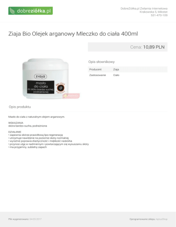 DobreZiółka.pl Zielarnia Internetowa Krakowska 5, Mikstat 531-470-109 Ziaja Bio Olejek arganowy Mleczko do ciała 400ml Cena: 10,89 PLN Opis słownikowy Producent Ziaja Zastosowanie Ciało Opis produktu Masło do ciała z naturalnym olejem arganowym. WSKAZANIA skóra bardzo sucha, podrażniona DZIAŁANIE • zapewnia skórze prawidłową lipo-regenerację • utrzymuje nawilżenie na poziomie skóry normalnej • wyraźnie poprawia elastyczność i miękkość naskórka • przynosi ulgę w nadmiernym i powtarzającym się wysuszaniu skóry • ma przyjemny, subtelny zapach Plik wygenerowano: 04-03-2017 Powered by TCPDF (www.tcpdf.org) Oprogramowanie sklepu: AptusShop