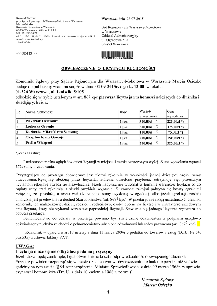 Komornik Sądowy przy Sądzie Rejonowym dla Warszawy-Mokotowa w Warszawie Marcin Osiczko Kancelaria Komornicza w Warszawie 00-790 Warszawa ul. Willowa 11 lok 11 NIP: 879-209-94-77 tel. 22 112-01-51, fax:22 112-01-55 e-mail: [email protected] www.komornik-osiczko.pl Km 1930/14 Warszawa, dnia 08-07-2015 << ODPIS >> *0020000574663* Sąd Rejonowy dla Warszawy-Mokotowa w Warszawie Oddział Administracyjny ul. Ogrodowa 51A 00-873 Warszawa OBWIESZCZENIE O LICYTACJI RUCHOMOŚCI Komornik Sądowy przy Sądzie Rejonowym dla Warszawy-Mokotowa w Warszawie Marcin Osiczko podaje do publicznej wiadomości, że w dniu 04-09-2015r. o godz. 12:00 w lokalu: 01-226 Warszawa, ul. Ludwiki 5/105 odbędzie się w trybie ustalonym w art. 867 kpc pierwsza licytacja ruchomości należących do dłużnika i składających się z: Lp. Nazwa ruchomości Ilość 1 2 3 4 5 Piekarnik Electrolux Lodówka Gorenje Kuchenka Mikrofalowa Samsung Okap kuchenny Gorenje Pralka Whirpool 1 [szt.] 1 [szt.] 1 [szt.] 1 [szt.] 1 [szt.] Wartość szacunkowa 300,00zł *) 500,00zł *) 100,00zł *) 200,00zł *) 700,00zł *) Cena wywołania 225,00zł *) 375,00zł *) 75,00zł *) 150,00zł *) 525,00zł *) *) cena za sztukę Ruchomości można oglądać w dzień licytacji w miejscu i czasie oznaczonym wyżej. Suma wywołania wynosi 75% sumy oszacowania. Przystępujący do przetargu obowiązany jest złożyć rękojmię w wysokości jednej dziesiątej części sumy oszacowania. Rękojmię złożoną przez licytanta, któremu udzielono przybicia, zatrzymuje się; pozostałym licytantom rękojmię zwraca się niezwłocznie. Jeżeli nabywca nie wykonał w terminie warunków licytacji co do zapłaty ceny, traci rękojmię, a skutki przybicia wygasają. Z utraconej rękojmi pokrywa się koszty egzekucji związanej ze sprzedażą, a reszta wchodzi w skład sumy uzyskanej w egzekucji albo jeżeli egzekucja została umorzona jest przelewana na dochód Skarbu Państwa (art. 8671 kpc). W przetargu nie mogą uczestniczyć: dłużnik, komornik, ich małżonkowie, dzieci, rodzice i rodzeństwo, osoby obecne na licytacji w charakterze urzędowym oraz licytant, który nie wykonał warunków poprzedniej licytacji. Stawienie się jednego licytanta wystarcza do odbycia przetargu. Pełnomocnictwo do udziału w przetargu powinno być stwierdzone dokumentem z podpisem urzędowo poświadczonym, chyba że chodzi o pełnomocnictwo udzielone adwokatowi lub radcy prawnemu (art. 8672 kpc) Komornik w oparciu o art.18 ustawy z dnia 11 marca 2004r o podatku od towarów i usług (Dz.U. Nr 54, poz.535) wystawia faktury VAT. UWAGA: Licytacja może się nie odbyć bez podania przyczyny. Jeżeli drzwi będą zamknięte, będą otwierane na koszt i odpowiedzialność obowiązanegodłużnika. Przetarg powinien rozpocząć się w czasie oznaczonym w obwieszczeniu, jednak nie później niż w dwie godziny po tym czasie [§ 91 rozporządzenia Ministra Sprawiedliwości z dnia 09 marca 1968r. w sprawie czynności komorników (Dz. U. z dnia 10 kwietnia 1968 r. ze zm.)]. Komornik Sądowy Marcin Osiczko 1 Pouczenie: Udostępnione dane stron podlegają ochronie zgodnie z ustawą z dnia 29 sierpnia 1997r o ochronie danych osobowych (Dz. U. 2002 Nr 101 poz. 926 ze zm.) i mogą zostać wykorzystane wyłącznie z przeznaczeniem, dla którego zostały udostępnione. 2