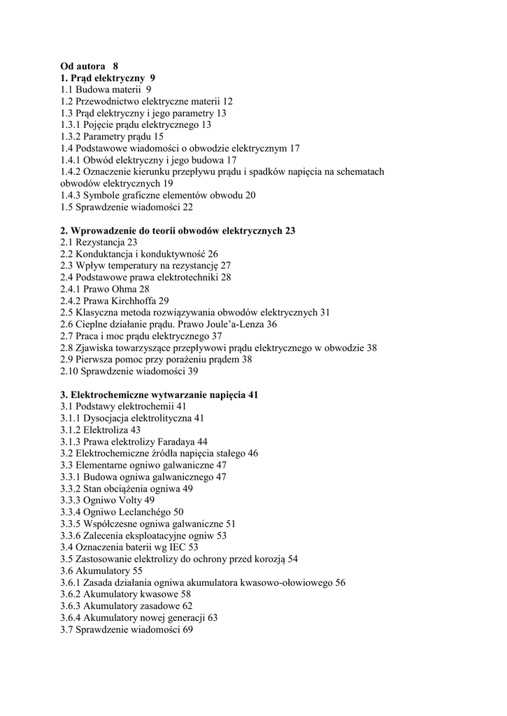 Od autora 8 1. Prąd elektryczny 9 1.1 Budowa materii 9 1.2 Przewodnictwo elektryczne materii 12 1.3 Prąd elektryczny i jego parametry 13 1.3.1 Pojęcie prądu elektrycznego 13 1.3.2 Parametry prądu 15 1.4 Podstawowe wiadomości o obwodzie elektrycznym 17 1.4.1 Obwód elektryczny i jego budowa 17 1.4.2 Oznaczenie kierunku przepływu prądu i spadków napięcia na schematach obwodów elektrycznych 19 1.4.3 Symbole graficzne elementów obwodu 20 1.5 Sprawdzenie wiadomości 22 2. Wprowadzenie do teorii obwodów elektrycznych 23 2.1 Rezystancja 23 2.2 Konduktancja i konduktywność 26 2.3 Wpływ temperatury na rezystancję 27 2.4 Podstawowe prawa elektrotechniki 28 2.4.1 Prawo Ohma 28 2.4.2 Prawa Kirchhoffa 29 2.5 Klasyczna metoda rozwiązywania obwodów elektrycznych 31 2.6 Cieplne działanie prądu. Prawo Joule’a-Lenza 36 2.7 Praca i moc prądu elektrycznego 37 2.8 Zjawiska towarzyszące przepływowi prądu elektrycznego w obwodzie 38 2.9 Pierwsza pomoc przy porażeniu prądem 38 2.10 Sprawdzenie wiadomości 39 3. Elektrochemiczne wytwarzanie napięcia 41 3.1 Podstawy elektrochemii 41 3.1.1 Dysocjacja elektrolityczna 41 3.1.2 Elektroliza 43 3.1.3 Prawa elektrolizy Faradaya 44 3.2 Elektrochemiczne źródła napięcia stałego 46 3.3 Elementarne ogniwo galwaniczne 47 3.3.1 Budowa ogniwa galwanicznego 47 3.3.2 Stan obciążenia ogniwa 49 3.3.3 Ogniwo Volty 49 3.3.4 Ogniwo Leclanchégo 50 3.3.5 Współczesne ogniwa galwaniczne 51 3.3.6 Zalecenia eksploatacyjne ogniw 53 3.4 Oznaczenia baterii wg IEC 53 3.5 Zastosowanie elektrolizy do ochrony przed korozją 54 3.6 Akumulatory 55 3.6.1 Zasada działania ogniwa akumulatora kwasowo-ołowiowego 56 3.6.2 Akumulatory kwasowe 58 3.6.3 Akumulatory zasadowe 62 3.6.4 Akumulatory nowej generacji 63 3.7 Sprawdzenie wiadomości 69 4. Obwody elektryczne prądu stałego 70 4.1 Źródło napięcia 70 4.2 Łączenie źródeł napięcia 71 4.3 Stany pracy źródła napięcia 73 4.4 Dzielnik napięcia 75 4.5 Połączenia rezystorów 76 4.5.1 Szeregowe połączenie rezystorów 76 4.5.2 Równoległe połączenie rezystorów 77 4.5.3 Mieszane połączenie rezystorów 78 4.6 Sprawdzenie wiadomości 80 5. Pole elektryczne i kondensatory 82 5.1 Pojęcie ładunku elektrycznego 82 5.2 Elektryzowanie ciał 83 5.3 Prawo Coulomba 84 5.4 Pole elektryczne 85 5.5 Parametry pola elektrycznego 87 5.6 Zjawisko indukcji elektrostatycznej w praktyce 88 5.7 Budowa i zasada działania kondensatora 89 5.8 Pojęcie pojemności elektrycznej 90 5.9 Pojemność kondensatora 91 5.10 Ładowanie i rozładowanie kondensatora 92 5.11 Połączenia kondensatorów 95 5.11.1 Połączenie szeregowe kondensatorów 95 5.11.2 Połączenie równoległe kondensatorów 98 5.11.3 Połączenie mieszane kondensatorów 99 5.12 Rodzaje kondensatorów 100 5.13 Wybrane zastosowania kondensatorów 103 5.14 Parametry kondensatorów 103 5.15 Sprawdzenie wiadomości 105 6. Pole magnetyczne 107 6.1 Istota pola magnetycznego 107 6.2 Graficzny obraz pola magnetycznego 110 6.3 Porównanie pola magnetycznego z elektrycznym 112 6.4 Podstawowe parametry pola magnetycznego 112 6.5 Obwody magnetyczne 115 6.6 Przenikalność magnetyczna i właściwości magnetyczne ciał 118 6.7 Sprawdzenie wiadomości 121 7. Elektromagnetyzm 122 7.1 Indukcja elektromagnetyczna 122 7.2 Zasada działania prądnic 125 7.3 Zasada działania silników elektrycznych 126 7.4 Reguła Lenza 129 7.5 Indukcja własna (samoindukcja) 130 7.6 Indukcja wzajemna 133 7.7 Elektromagnes 135 7.8. Kontaktron 136 7.9 Sprawdzenie wiadomości 138 8. Podstawowe wiadomości o prądzie przemiennym 140 8.1 Podstawowe określenia prądu przemiennego 140 8.2 Przesunięcie fazowe przebiegów elektrycznych 145 8.3 Wskazy wielkości sinusoidalnych 147 8.4 Wartość skuteczna prądu przemiennego 149 8.5 Wytwarzanie sinusoidalnie zmiennej siły elektromotorycznej 151 8.6 Sprawdzenie wiadomości 153 9. Obwody elektryczne prądu przemiennego 154 9.1 Wiadomości wstępne 154 9.2 Rezystancja w obwodzie prądu przemiennego 155 9.3 Cewka indukcyjna w obwodzie prądu przemiennego 156 9.3.1 Właściwości cewki indukcyjnej 156 9.3.2 Reaktancja indukcyjna cewki 161 9.4 Kondensator w obwodzie prądu przemiennego 163 9.4.1 Pojemność kondensatora 163 9.4.2 Reaktancja pojemnościowa kondensatora 166 9.5 Szeregowe połączenie elementów R, L i C w obwodzie prądu przemiennego 168 9.6 Równoległe połączenie elementów R, L i C w obwodzie prądu przemiennego 172 9.6.1 Wprowadzenie 172 9.6.2 Równoległe połączenie elementów R i L 173 9.6.3 Równoległe połączenie elementów R i C 176 9.6.4 Równoległe połączenie elementów R, L i C 178 9.7 Zjawisko rezonansu elektrycznego 181 9.8 Sprawdzenie wiadomości 184 10. Transformatory 187 10.1 Wprowadzenie 187 10.2 Budowa transformatora 188 10.3 Zasada działania transformatora 190 10.4 Parametry transformatora 191 10.5 Straty mocy w rdzeniu stalowym odbiorników 195 10.6 Sprawdzenie wiadomości 199 11. Moc prądu przemiennego 200 11.1 Pojęcie mocy prądu przemiennego 200 11.2 Moc pozorna 202 11.3 Moc czynna 202 11.4 Moc bierna 204 11.5 Współczynnik mocy czynnej 206 11.6 Sprawdzenie wiadomości 209 12. Prąd trójfazowy 210 12.1 Wytwarzanie prądu trójfazowego 210 12.2 Połączenie w gwiazdę twornika prądnicy 213 12.3 Ochrona przeciwporażeniowa 214 12.4 Połączenie w trójkąt twornika prądnicy 218 12.5 Eksploatacja urządzeń trójfazowych 219 12.6 Moc w obwodzie prądu trójfazowego 222 12.7 Sprawdzenie wiadomości 225 13. Maszyny elektryczne 226 13.1 Maszyny prądu stałego 227 13.1.1 Budowa maszyn prądu stałego 227 13.1.2 Prądnice prądu stałego 228 13.1.3 Silniki prądu stałego, ich parametry i rodzaje 230 13.2 Maszyny prądu przemiennego 236 13.2.1 Rodzaje maszyn 236 13.2.2 Prądnice prądu przemiennego 236 13.2.3 Silniki prądu przemiennego 240 13.3 Silniki krokowe 242 13.4 Sprawdzenie wiadomości 248 14. Elektroniczne elementy półprzewodnikowe 249 14.1 Materiały półprzewodnikowe 249 14.2 Złącze p-n 252 1