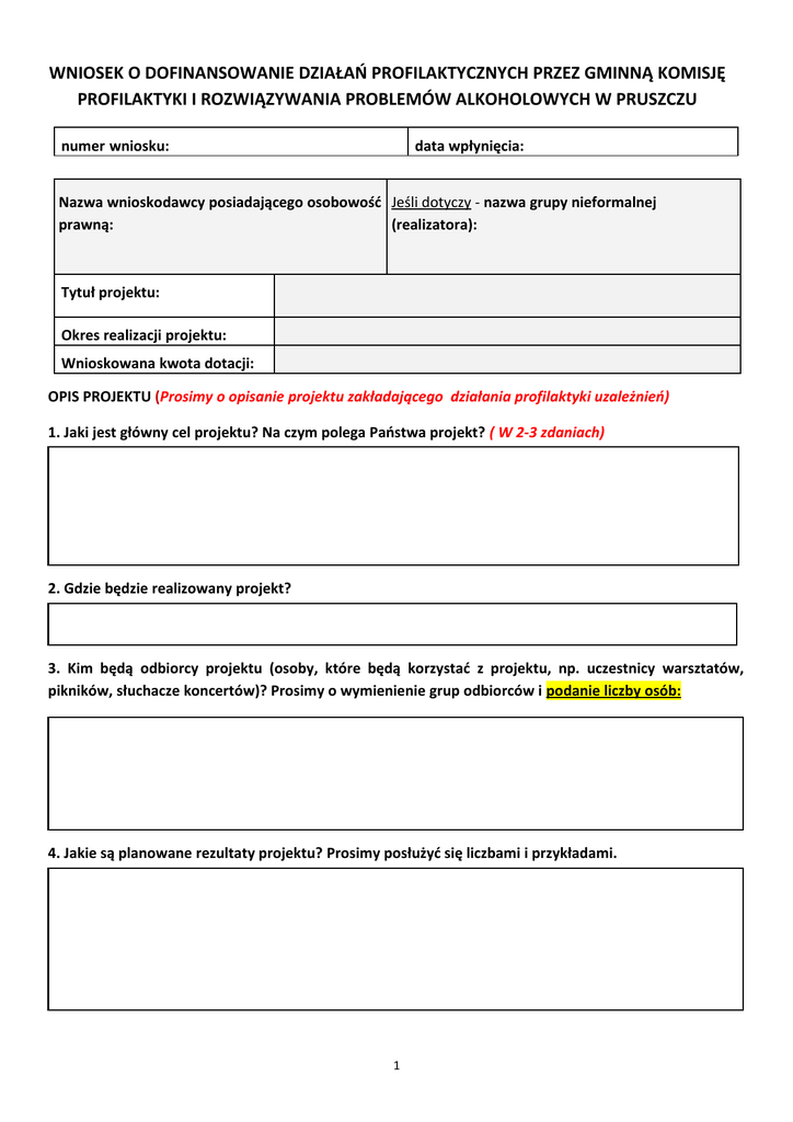 WNIOSEK O DOFINANSOWANIE DZIAŁAŃ PROFILAKTYCZNYCH PRZEZ GMINNĄ KOMISJĘ PROFILAKTYKI I ROZWIĄZYWANIA PROBLEMÓW ALKOHOLOWYCH W PRUSZCZU numer wniosku: data wpłynięcia: Nazwa wnioskodawcy posiadającego osobowość Jeśli dotyczy - nazwa grupy nieformalnej prawną: (realizatora): Tytuł projektu: Okres realizacji projektu: Wnioskowana kwota dotacji: OPIS PROJEKTU (Prosimy o opisanie projektu zakładającego działania profilaktyki uzależnień) 1. Jaki jest główny cel projektu? Na czym polega Państwa projekt? ( W 2-3 zdaniach) 2. Gdzie będzie realizowany projekt? 3. Kim będą odbiorcy projektu (osoby, które będą korzystać z projektu, np. uczestnicy warsztatów, pikników, słuchacze koncertów)? Prosimy o wymienienie grup odbiorców i podanie liczby osób: 4. Jakie są planowane rezultaty projektu? Prosimy posłużyć się liczbami i przykładami. 1 5. Plan działań projektu. l.p. Działanie 6. Prosimy wpisać na poniższym schemacie nazwy darczyńców, którzy wesprą projekt finansowo i / lub niefinansowo. Rodzaj wsparcia Instytucje państwowe Przedsiębiorcy, firmy, osoby prywatne Inne organizacje Inni Wsparcie finansowe Wsparcie niefinansowe 7. W jaki sposób będą Państwo współpracować z wolontariuszami przy realizacji projektu? Prosimy wypełnić poniższą tabelę. L.p. Jakie zadania będą wykonywane przez wolontariuszy? Liczba wolontariuszy 1. Wysokość budżetu projektu i kwoty wnioskowanej: Całkowita wartość budżetu projektu (uwzględniająca wkład własny oraz kwotę dotacji): Wysokość wnioskowanej dotacji od GKP i RPA (maksymalnie 3000 zł): ……………………….zł ……………………zł Miejscowość, data:…………………… …………………………......................................... Podpisy osób upoważnionych do reprezentowania jednostki składającej wniosek: …........................................................................................................................................... 2 BUDŻET PROJEKTU ZE ŚRODKÓW GKPiRPA L.p. Kategoria kosztów (np. wynagrodzenie, opłata za usługę, dożywianie, transport, zakup materiałów, biletów, nagród, itp.) Jednostka kosztu (np. osoba, sztuka, komplet, itp.) Liczba jednostek Koszt jednostkowy w zł Suma w zł SUMA…………………… Ewentualny komentarz do budżetu: