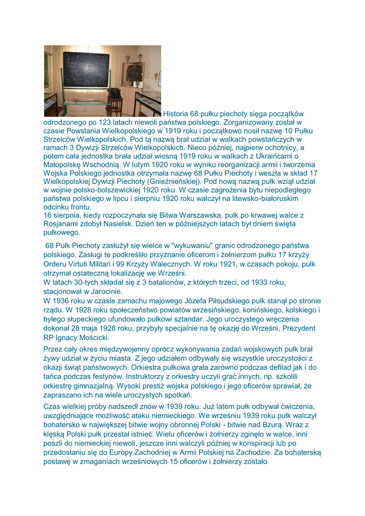 Historia 68 pułku piechoty sięga początków odrodzonego po 123 latach niewoli państwa polskiego. Zorganizowany został w czasie Powstania Wielkopolskiego w 1919 roku i początkowo nosił nazwę 10 Pułku Strzelców Wielkopolskich. Pod tą nazwą brał udział w walkach powstańczych w ramach 3 Dywizji Strzelców Wielkopolskich. Nieco później, najpierw ochotnicy, a potem cała jednostka brała udział wiosną 1919 roku w walkach z Ukraińcami o Małopolskę Wschodnią. W lutym 1920 roku w wyniku reorganizacji armii i tworzenia Wojska Polskiego jednostka otrzymała nazwę 68 Pułku Piechoty i weszła w skład 17 Wielkopolskiej Dywizji Piechoty (Gnieźnieńskiej). Pod nową nazwą pułk wziął udział w wojnie polsko-bolszewickiej 1920 roku. W czasie zagrożenia bytu niepodległego państwa polskiego w lipcu i sierpniu 1920 roku walczył na litewsko-białoruskim odcinku frontu. 16 sierpnia, kiedy rozpoczynała się Bitwa Warszawska, pułk po krwawej walce z Rosjanami zdobył Nasielsk. Dzień ten w późniejszych latach był dniem święta pułkowego. 68 Pułk Piechoty zasłużył się wielce w "wykuwaniu" granic odrodzonego państwa polskiego. Zasługi te podkreśliło przyznanie oficerom i żołnierzom pułku 17 krzyży Orderu Virtuti Militari i 99 Krzyży Walecznych. W roku 1921, w czasach pokoju, pułk otrzymał ostateczną lokalizację we Wrześni. W latach 30-tych składał się z 3 batalionów, z których trzeci, od 1933 roku, stacjonował w Jarocinie. W 1936 roku w czasie zamachu majowego Józefa Piłsudskiego pułk stanął po stronie rządu. W 1928 roku społeczeństwo powiatów wrzesińskiego, konińskiego, kolskiego i byłego słupeckiego ufundowało pułkowi sztandar. Jego uroczystego wręczenia dokonał 28 maja 1928 roku, przybyły specjalnie na tę okazję do Wrześni, Prezydent RP Ignacy Mościcki. Przez cały okres międzywojenny oprócz wykonywania zadań wojskowych pułk brał żywy udział w życiu miasta. Z jego udziałem odbywały się wszystkie uroczystości z okazji świąt państwowych. Orkiestra pułkowa grała zarówno podczas defilad jak i do tańca podczas festynów. Instruktorzy z orkiestry uczyli grać innych, np. szkolili orkiestrę gimnazjalną. Wysoki prestiż wojska polskiego i jego oficerów sprawiał, że zapraszano ich na wiele uroczystych spotkań. Czas wielkiej próby nadszedł znów w 1939 roku. Już latem pułk odbywał ćwiczenia, uwzględniające możliwość ataku niemieckiego. We wrześniu 1939 roku pułk walczył bohatersko w największej bitwie wojny obronnej Polski - bitwie nad Bzurą. Wraz z klęską Polski pułk przestał istnieć. Wielu oficerów i żołnierzy zginęło w walce, inni poszli do niemieckiej niewoli, jeszcze inni walczyli później w konspiracji lub po przedostaniu się do Europy Zachodniej w Armii Polskiej na Zachodzie. Za bohaterską postawę w zmaganiach wrześniowych 15 oficerów i żołnierzy zostało zakwalifikowanych do odznaczenia krzyżem Virtuti Militari, a 60 Krzyżem Walecznych. Dziś przechodząc obok pomnika 68 Pułku Piechoty powinniśmy pamiętać o tym wszystkim, co dla wolnej Polski uczynili jego żołnierze.