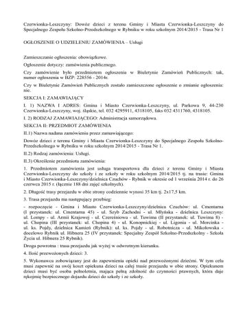 Czerwionka-Leszczyny: Dowóz dzieci z terenu Gminy i Miasta Czerwionka-Leszczyny do Specjalnego Zespołu Szkolno-Przedszkolnego w Rybniku w roku szkolnym 2014/2015 - Trasa Nr 1 OGŁOSZENIE O UDZIELENIU ZAMÓWIENIA – Usługi Zamieszczanie ogłoszenia: obowiązkowe. Ogłoszenie dotyczy: zamówienia publicznego. Czy zamówienie było przedmiotem ogłoszenia w Biuletynie Zamówień Publicznych: tak, numer ogłoszenia w BZP: 228556 - 2014r. Czy w Biuletynie Zamówień Publicznych zostało zamieszczone ogłoszenie o zmianie ogłoszenia: nie. SEKCJA I: ZAMAWIAJĄCY I. 1) NAZWA I ADRES: Gmina i Miasto Czerwionka-Leszczyny, ul. Parkowa 9, 44-230 Czerwionka-Leszczyny, woj. śląskie, tel. 032 4295911, 4318105, faks 032 4311760, 4318105. I. 2) RODZAJ ZAMAWIAJĄCEGO: Administracja samorządowa. SEKCJA II: PRZEDMIOT ZAMÓWIENIA II.1) Nazwa nadana zamówieniu przez zamawiającego: Dowóz dzieci z terenu Gminy i Miasta Czerwionka-Leszczyny do Specjalnego Zespołu SzkolnoPrzedszkolnego w Rybniku w roku szkolnym 2014/2015 - Trasa Nr 1. II.2) Rodzaj zamówienia: Usługi. II.3) Określenie przedmiotu zamówienia: 1. Przedmiotem zamówienia jest usługa transportowa dla dzieci z terenu Gminy i Miasta Czerwionka-Leszczyny do szkoły i ze szkoły w roku szkolnym 2014/2015 tj. na trasie: Gmina i Miasto Czerwionka-Leszczyny/dzielnica Czuchów - Rybnik w okresie od 1 września 2014 r. do 26 czerwca 2015 r. (łącznie 188 dni zajęć szkolnych). 2. Długość trasy przejazdu w obie strony codziennie wynosi 35 km tj. 2x17,5 km. 3. Trasa przejazdu ma następujący przebieg: - rozpoczęcie - Gmina i Miasto Czerwionka-Leszczyny/dzielnica Czuchów: ul. Cmentarna (I przystanek: ul. Cmentarna 45) - ul. Szyb Zachodni - ul. Młyńska - dzielnica Leszczyny: ul. Lompy - ul. Armii Krajowej - ul. Czereśniowa - ul. Tuwima (II przystanek: ul. Tuwima 8) ul. Chopina (III przystanek: ul. Chopina 4) - ul. Konopnickiej - ul. Ligonia - ul. Morcinka ul. ks. Pojdy, dzielnica Kamień (Rybnik): ul. ks. Pojdy - ul. Robotnicza - ul. Mikołowska docelowo Rybnik ul. Hibnera 25 (IV przystanek: Specjalny Zespół Szkolno-Przedszkolny - Szkoła Życia ul. Hibnera 25 Rybnik). Droga powrotna : trasa przejazdu jak wyżej w odwrotnym kierunku. 4. Ilość przewożonych dzieci: 3. 5. Wykonawca zobowiązany jest do zapewnienia opieki nad przewożonymi dziećmi. W tym celu musi zapewnić na swój koszt opiekuna dzieci na całej trasie przejazdu w obie strony. Opiekunem dzieci musi być osoba pełnoletnia, mająca pełną zdolność do czynności prawnych, która daje rękojmię bezpiecznego dojazdu dzieci do szkoły i ze szkoły. 6. Wykonawca musi dysponować co najmniej jednym pełnosprawnym autobusem lub busem, który umożliwi przewóz łącznie 4 osób, bez kierowcy (z miejscami siedzącymi dla wszystkich dzieci oraz 1 opiekuna). 7. Autobus lub bus musi umożliwiać bezpieczny przewóz dzieci niepełnosprawnych i być dostosowany do rodzaju niepełnosprawności przewożonych dzieci. Musi spełniać następujące warunki : 1) możliwość zamocowania specjalistycznego fotelika dla jednego dziecka wraz z odpowiednio dopasowanymi pasami bezpieczeństwa, 2) posiadać dostosowane do rodzaju niepełnosprawności oraz wzrostu dzieci pasy bezpieczeństwa. Wykonawca jest zobowiązany dostosować autobus lub bus do przewozu dzieci niepełnosprawnych na własny koszt. Ww. dotyczy również ewentualnego przywrócenia środka transportu do stanu pierwotnego. 8. Wykonawca jest zobowiązany do wykonywania zamówienia sprawnym technicznie autobusem lub busem każdego dnia roboczego, z wyjątkiem okresów wolnych od zajęć lekcyjnych. 9. Dowóz i odwóz dzieci odbywać się będzie według harmonogramu ustalonego przez dyrektora szkoły, do którego Wykonawca jest zobowiązany się dostosować, przy założeniu jednak, że dowóz uczniów rozpoczynać się będzie nie wcześniej niż o godz. 6:30 z pierwszego przystanku a przyjazd do szkoły nastąpi nie później niż o godz. 10:00, oraz że powrót uczniów ze szkoły odbywać się będzie pomiędzy godz. 12:30 - 16:30. 10. Przewozy rozliczane będą na podstawie podanej w ofercie przez Wykonawcę ceny brutto za 1km przejazdu (przewozu) usługi transportowej, obejmującej również koszt opiekuna. 11. Zamawiający finansuje jedynie przewóz dzieci od pierwszego do ostatniego przystanku, zgodnie z trasą przejazdu. Zamawiający nie pokrywa kosztów dojazdu autobusu/busu z bazy i do bazy Wykonawcy. Uwaga ! Zamawiający zastrzega, że w trakcie realizacji niniejszego zamówienia przebieg trasy może ulec niewielkim zmianom - długość trasy może ulec skróceniu, najwyżej jednak o 15%. W przypadku skrócenia trasy Zamawiający płacił będzie Wykonawcy za faktycznie zrealizowane długości trasy - ilość wykonanych kilometrów. II.4) Wspólny Słownik Zamówień (CPV): 60.13.00.00-8. SEKCJA III: PROCEDURA III.1) TRYB UDZIELENIA ZAMÓWIENIA: Przetarg nieograniczony III.2) INFORMACJE ADMINISTRACYJNE • Zamówienie dotyczy projektu/programu finansowanego ze środków Unii Europejskiej: nie SEKCJA IV: UDZIELENIE ZAMÓWIENIA IV.1) DATA UDZIELENIA ZAMÓWIENIA: 06.08.2014. IV.2) LICZBA OTRZYMANYCH OFERT: 2. IV.3) LICZBA ODRZUCONYCH OFERT: 0. IV.4) NAZWA I ADRES WYKONAWCY, KTÓREMU UDZIELONO ZAMÓWIENIA: • Usługi Transportowe Benedykt Hajduk, ul. Szkolna 29, 44-230 Stanowice, kraj/woj. śląskie. IV.5) Szacunkowa wartość zamówienia (bez VAT): 41612,41 PLN. IV.6) INFORMACJA O CENIE WYBRANEJ OFERTY ORAZ O OFERTACH Z NAJNIŻSZĄ I NAJWYŻSZĄ CENĄ • Cena wybranej oferty: 31584,00 • Oferta z najniższą ceną: 31584,00 / Oferta z najwyższą ceną: 31913,00 • Waluta: PLN. Niniejsze ogłoszenie o udzieleniu zamówienia zostało zamieszczone w Biuletynie Zamówień Publicznych w dniu 6.08.2014 r.