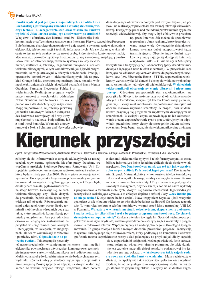 Merkuriusz NAUKA dane dotyczące obrazów ruchomych pod różnymi kątami, co poPański wydział jest jednym z najmłodszych na Politechnice zwoli na realizację w przyszłości tak zwanej telewizji wielowidoPoznańskiej i jest związany z bardzo aktualną dziedziną wiekowej. Trwają więc prace nad metodami przetwarzania sygnałów dzy i techniki. Dlaczego warto studiować właśnie na Państwa telewizji wielowidokowej, aby mogły być efektywnie przesłane wydziale? Jaka kariera czeka jego absolwentów po studiach? np. przez Internet. Jak można się spodziewać, W tej chwili oferujemy dwa kierunki studiów - Elektronikę i teletego rodzaju obraz ruchomy, który jest rejestrokomunikację oraz Techniczne zastosowania Internetu. Pierwszy, zgodnie z Procesem wany przez wiele równocześnie działających Bolońskim, ma charakter dwustopniowy i daje szerokie wykształcenie w dziedzinie kamer, wymaga dużej przepustowości łączy elektroniki, telekomunikacji i technik informacyjnych. Jak się okazuje, wykształtransmisyjnych. Obecnie indywidualni użytcenie to jest na tyle atrakcyjne, że nawet osoby, które nie chcą kontynuować nauki, kownicy mają najczęściej dostęp do Internetu albo muszą z powodów życiowych rozpocząć pracę zawodową, znajdują ją bardzo o szybkości kilku – kilkudziesięciu Mb/s przy łatwo. Nasi absolwenci znają zarówno systemy i układy elektrokorzystaniu z tradycyjnej pętli abonenckiej (pary drucików mieniczne, multimedia, telewizję, zagadnienia związane z sieciami dzianych łączących nasz telefon z centralą). W przyszłości sieć telekomunikacyjnymi, w tym komórkowymi, jak i języki prograbazująca na włóknach optycznych dotrze do pojedynczych użytmowania, są więc atrakcyjni w różnych dziedzinach. Pracują u kowników (tzw. Fiber to the Home – FTTH), co pozwoli na wielooperatorów komórkowych i telekomunikacyjnych, jak na przykrotny wzrost szybkości danych i dostęp do wielu nowych usług, kład Orange Polska, operatora regionalnego Inea, ponadto w firm.in. wspomnianej już telewizji wielowidokowej. W dziedzinie mach elektronicznych takich jak oddział poznański firmy Mentor Graphics, Samsung Electronics Polska i w telekomunikacji obserwujemy ciągle olbrzymi i nieustanny wielu innych. Realizujemy program współpostęp... Gdybyśmy przypomnieli stan radiokomunikacji na pracy ramowej z wrocławskim oddziałem początku lat 90-tych, to możemy przywołać obraz biznesmenów Nokia Solutions and Networks. To wielki idących z kuferkiem, którym był telefon komórkowy pierwszej pracodawca dla dwóch tysięcy inżynierów. generacji i który miał możliwości nieporównanie mniejsze niż Mogę się pochwalić, że jesteśmy pierwszą obecnie masowo używane smartfony. Á propos, nasi studenci jednostką naukową w Polsce, z którą ośrobardzo pasjonują się programami użytkowymi działającymi na dek badawczo-rozwojowy tej firmy utrzysmartfonach. W związku z tym, odpowiadając na ich zainteresomuje kontakty naukowe. Podpisaliśmy już wania oraz na zapotrzebowanie rynku pracy, oferujemy im odpoz nimi trzeci kontrakt. W ramach umowy wiedni przedmiot, który cieszy się szczególnie dużym zaintereramowej z Nokia Solutions and Networks zobowiąsowaniem. Nota bene, zagadnienia telekomunikacyjne związane Kierunek przyszłości Z prof. Krzysztofem Wesołowskim, dziekanem Wydziału Elektroniki i Telekomunikacji Politechniki Poznańskiej, rozmawia Lidia Piechocka zaliśmy się do informowania o targach edukacyjnych na naszej z sieciami telekomunikacyjnymi i teleinformatycznymi są coraz uczelni, wywieszamy ogłoszenia ich ofert pracy. Działamy we bliższe informatyce i obie dziedziny zbliżają się do siebie w wielu wspólnym projekcie Siódmego Programu Ramowego Unii Euaspektach. Noc Naukowców za nami, czy też tak jak w zeszłym ropejskiej poświęconym systemom radiokomunikacji ruchomej, roku wypatrzyliście Państwo jakiegoś geniusza? Rok temu był które będą istniały po roku 2020. To tzw. piąta generacja takich nim Szymek Matuszak, który w konkursie o telefon komórkowy systemów. Koncepcja takich systemów polega między innymi na zakasował wszystkich swoją wiedzą i umiejętnościami. Po rozbudowie tak zwanych szczególnie gęstych sieci, w których będą mowach z nim w obecności taty, który z pewnością jest jego dodziałały bardzo małe, gęsto rozmieszczoskonałym managerem, Szymek zaczął chodzić na nasze wykłady ne stacje bazowe. Oczekuje się, że ruch z programowania terminali mobilnych, którymi się bardzo interesował. Jego wiedza jest telekomunikacyjny, czyli ilość danych rzeczywiście zaskakująco wysoka, a to chłopiec dopiero z szóstej klasy. ...czy indeks już do przesłania, będzie około tysiąc razy na niego czeka? Kiedyś może będzie czekał. Nawet zapytałem Szymka - jeśli wszystko większa niż obecnie. Równocześnie naopanujesz w tak młodym wieku, to co właściwie będziesz studiować? On jeszcze tego nie stąpi dziesięciokrotny wzrost liczby terwie. W tym roku konkurs o telefon komórkowy wygrał uczeń klasy maturalnej VIII LO minali mobilnych, a wśród nich będą też w Poznaniu. Warsztaty w wirtualnym studiu telewizyjnym, eksperymenty z obrazem takie, które umożliwią komunikację poi radiostacją... to tylko kilka haseł z bogatego programu naukowej nocy. Co cieszyło między urządzeniami bez pośrednictwa się największą popularnością? Konkurs o telefon to ciągle hit. Spośród wielu propozycji człowieka. Znajdą one zastosowanie na pokazów na naszym wydziale, wielkim powodzeniem cieszyły się też warsztaty z prograprzykład w urządzeniach pomiarowych mowania mikrokontrolerów. Współpracujemy z Fundacją Wolnego i Otwartego Oprograi sterujących, w sklepach, w magazymowania. To grupa młodych ludzi z różnych dziedzin, prawdziwi pasjonaci. Korzystają nach, ale też w komunikacji z robotami z systemu składającego się z mikrokontrolera, który pod
