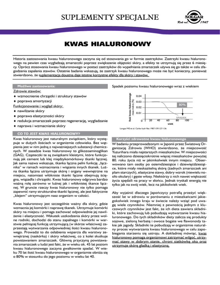 SUPLEMENTY SPECJALNE Kwas Hialuronowy Historia zastosowania kwasu hialuronowego zaczyna się od stosowania go w formie zastrzyków. Zastrzyki kwasu hialuronowego na pewien czas wygładzają zmarszczki poprzez zwiększenie objętości skóry, a efekty te utrzymują się przez 6 miesięcy. Oprócz stosowania kwasu hialuronowego w postaci zastrzyków do wypełniania zmarszczek używa się go także w celu złagodzenia zapalenia stawów. Ostatnie badania wskazują, że zastrzyk kwasu hialuronowego może nie być konieczny, ponieważ stwierdzono, że suplementacja doustna daje istotne korzystne efekty dla skóry i stawów. Zdrowie stawów: ♦♦wzmocnienie chrząstki i struktury stawów ♦♦poprawa amortyzacji Funkcjonowanie i wygląd skóry: ♦♦nawilżanie skóry ♦♦poprawa elastyczności skóry ♦♦redukcja zmarszczek poprzez regenerację, wygładzanie ♦♦naprawa i wzmacnianie skóry Spadek poziomu kwasu hialuronowego wraz z wiekiem Ilość kwasu hialuronowego masa mokra (%) Możliwe zastosowania: 0.04 0.03 80% 0.02 0.01 0 20 40 60 spadek 80 100 wiek Longas MO.et al. Carbo hydr Res 1987:159:127-136 Co to jest kwas hialuronowy? Kwas hialuronowy jest naturalnym związkiem, który występuje w dużych ilościach w organizmie człowieka. Bez wątpienia jest w nim jedną z najważniejszych substancji chemicznych. W zasadzie kwas hialuronowy to glikozoaminoglikan (GAG). Cząsteczki te są związkami kleistymi, które funkcjonują jak cement lub klej międzykomórkowy tkanki łącznej. Jak sama nazwa wskazuje, tkanka łączna pełni funkcję „łącznika” w ramach wzmacniania i wiązania innych tkanek. Luźna tkanka łączna utrzymuje skórę i organy wewnętrzne na miejscu, natomiast włókniste tkanki łączne obejmują ścięgna, wiązadła i chrząstki. Kwas hialuronowy odgrywa bardzo ważną rolę zarówno w luźnej jak i włóknistej tkance łącznej. W gruncie rzeczy kwas hialuronowy nie tylko pomaga zapewnić ramy strukturalne tkanki łącznej, ale jest faktycznie „klejem” utrzymującym nasz organizm w całości. Kwas hialuronowy jest szczególnie ważny dla skóry, gdzie wzmacnia jej komórki i naprawę tkanek. Utrzymuje komórki skóry na miejscu i pomaga zachować odpowiednie jej nawilżenie i elastyczność. Wskutek uszkodzenia skóry przez wolne rodniki, dochodzi do stanu zapalnego i komórki w warstwie pełniącej funkcję utrzymującą (w skórze właściwej) zaprzestają wytwarzania odpowiedniej ilości kwasu hialuronowego. Prowadzi to do osłabienia wsparcia dla warstwy zewnętrznej (naskórka) i skóry właściwej, co z kolei skutkuje powstawaniem zmarszczek. Główną przyczyną powstawania zmarszczek u ludzi jest fakt, że w wieku ok. 45 lat poziom kwasu hialuronowego zaczyna gwałtownie spadać. W wieku 70 lat ilość kwasu hialuronowego w organizmie obniża się o 80% w stosunku do jego poziomu w wieku lat 40. Korzyści zdrowotne kwasu hialuronowego W badaniu przeprowadzonym w Japonii przez Światową Organizację Zdrowia (WHO) stwierdzono, że miejscowość Yuzurihara miała najstarszych mieszkańców. W miejscowości tej naliczono dziesięciokrotnie więcej mieszkańców powyżej 80. roku życia niż w jakimkolwiek innym miejscu. Obserwowano tam osoby po osiemdziesiątce i dziewięćdziesiątce, które miały nieskazitelną skórę (żadnych zmarszczek ani plam starczych), elastyczne stawy, dobry wzrok (niewielu nosiło okulary) i gęste włosy. Niektórzy z nich nawet większość życia spędzili na pracy w słońcu. Jednak tryskali energią nie tylko jak na swój wiek, lecz na jakikolwiek wiek. Aby wyjaśnić dlaczego Japończycy potrafią przeżyć większość lat w zdrowiu w porównaniu z mieszkańcami jakiegokolwiek innego kraju w świecie należy wziąć pod uwagę wiele czynników. Niemniej z pewnością jednym z kluczowych czynników jest fakt, że ich dieta zawiera składniki, które zachowują lub pobudzają wytwarzanie kwasu hialuronowego. Do tych składników diety zalicza się produkty sojowe, zieloną herbatę i owoce bogate we flawonoidy takie jak jagody. Składniki te pobudzają w organizmie naturalny proces wytwarzania kwasu hialuronowego w celu zapobiegania starzeniu się ustroju. A dokładniej mówiąc, kwas hialuronowy pomaga organizmowi zatrzymać wilgoć, utrzymać stawy w dobrym stanie, chroni siatkówkę oka oraz utrzymuje skórę gładką i elastyczną. SUPLEMENTY SPECJALNE Badania i właściwości Zdrowie skóry Kolagen jest jedną z najważniejszych substancji niezbędnych do właściwego funkcjonowania skóry. Zapewnia wsparcie strukturalne dla skóry zwiększając jej elastyczność i napięcie. Kwas hialuronowy jest również obecny w tkance skórnej, w tym w skórze właściwej (warstwie wewnętrznej) i naskórku (warstwie zewnętrznej). Wspomaga odpowiednie funkcjonowanie skóry. W badaniu opublikowanym w Journal of Cellular Physiology w 1998 r. wykazano, że kwas hialuronowy wspomaga rozmnażanie i rozrastanie zdrowych komórek skóry w macierzy kolagenowej. Działanie: Kwas hialuronowy zwiększa nawilżenie (nawodnienie) skóry i działa jak smar pomiędzy macierzą kolagenową skóry. Gojenie się ran Wykazano, że kwas hialuronowy wspomaga gojenie się ran, głównie przy zastosowaniu miejscowym. W badaniu pt. „The Properties of Hyaluronan and Its Role in Wound Healing” opublikowanym w 2001 r. omówiono właściwości gojące kwasu hialuronowego. Wygląda na to, że działanie to wynika z jego właściwości zatrzymywania wody. Zdrowie stawów W organizmie występuje 14 rodzajów kolagenu, ale tylko rodzaj II jest najliczniejszy w macierzy stawowej. Collagen II i jego składniki wywierają bardzo silny wpływ na stawy i schorzenia związane z zaburzeniami pracy stawów. W badaniu opublikowanym w 2000 roku pt. „Role of Collagen Hydrolysate In Bone and Joint Disease” przeanalizowano dlaczego kolagen może być silnym narzędziem w walce z zapaleniem kości i stawów, a nawet osteoporozą. Naukowcy stwierdzili,