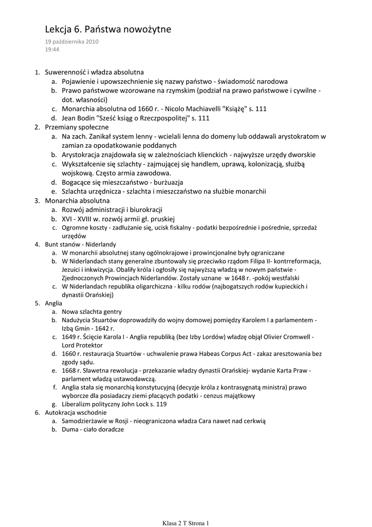 Lekcja 6. Państwa nowożytne 19 października 2010 19:44 1. Suwerenność i władza absolutna a. Pojawienie i upowszechnienie się nazwy państwo - świadomość narodowa b. Prawo państwowe wzorowane na rzymskim (podział na prawo państwowe i cywilne dot. własności) c. Monarchia absolutna od 1660 r. - Nicolo Machiavelli "Książę" s. 111 d. Jean Bodin "Sześć ksiąg o Rzeczpospolitej" s. 111 2. Przemiany społeczne a. Na zach. Zanikał system lenny - wcielali lenna do domeny lub oddawali arystokratom w zamian za opodatkowanie poddanych b. Arystokracja znajdowała się w zależnościach klienckich - najwyższe urzędy dworskie c. Wykształcenie się szlachty - zajmującej się handlem, uprawą, kolonizacją, służbą wojskową. Często armia zawodowa. d. Bogacące się mieszczaństwo - burżuazja e. Szlachta urzędnicza - szlachta i mieszczaństwo na służbie monarchii 3. Monarchia absolutna a. Rozwój administracji i biurokracji b. XVI - XVIII w. rozwój armii gł. pruskiej c. Ogromne koszty - zadłużanie się, ucisk fiskalny - podatki bezpośrednie i pośrednie, sprzedaż urzędów 4. Bunt stanów - Niderlandy a. W monarchii absolutnej stany ogólnokrajowe i prowincjonalne były ograniczane b. W Niderlandach stany generalne zbuntowały się przeciwko rządom Filipa II- kontrreformacja, Jezuici i inkwizycja. Obaliły króla i ogłosiły się najwyższą władzą w nowym państwie Zjednoczonych Prowincjach Niderlandów. Zostały uznane w 1648 r. -pokój westfalski c. W Niderlandach republika oligarchiczna - kilku rodów (najbogatszych rodów kupieckich i dynastii Orańskiej) 5. Anglia a. Nowa szlachta gentry b. Nadużycia Stuartów doprowadziły do wojny domowej pomiędzy Karolem I a parlamentem Izbą Gmin - 1642 r. c. 1649 r. Ścięcie Karola I - Anglia republiką (bez Izby Lordów) władzę objął Olivier Cromwell Lord Protektor d. 1660 r. restauracja Stuartów - uchwalenie prawa Habeas Corpus Act - zakaz aresztowania bez zgody sądu. e. 1668 r. Sławetna rewolucja - przekazanie władzy dynastii Orańskiej- wydanie Karta Praw parlament władzą ustawodawczą. f. Anglia stała się monarchią konstytucyjną (decyzje króla z kontrasygnatą ministra) prawo wyborcze dla posiadaczy ziemi płacących podatki - cenzus majątkowy g. Liberalizm polityczny John Lock s. 119 6. Autokracja wschodnie a. Samodzierżawie w Rosji - nieograniczona władza Cara nawet nad cerkwią b. Duma - ciało doradcze Klasa 2 T Strona 1
