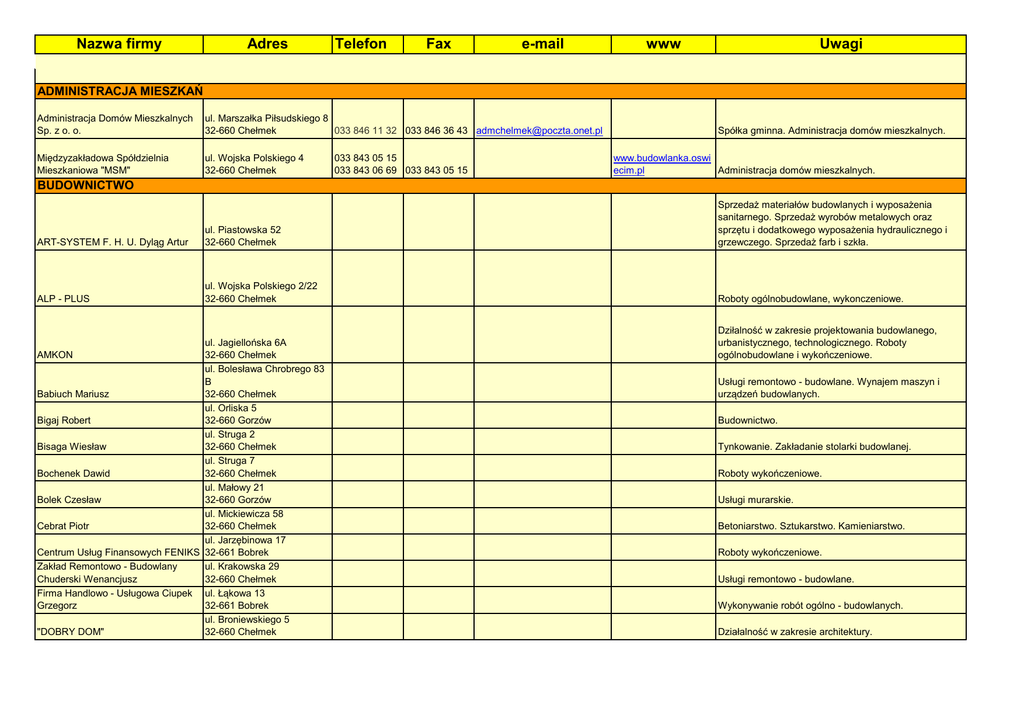 Nazwa firmy Adres Telefon Fax e-mail www Uwagi ADMINISTRACJA MIESZKAŃ Administracja Domów Mieszkalnych Sp. z o. o. ul. Marszałka Piłsudskiego 8 32-660 Chełmek 033 846 11 32 033 846 36 43 [email protected] Międzyzakładowa Spółdzielnia Mieszkaniowa "MSM" ul. Wojska Polskiego 4 32-660 Chełmek 033 843 05 15 033 843 06 69 033 843 05 15 Spółka gminna. Administracja domów mieszkalnych. www.budowlanka.oswi ecim.pl Administracja domów mieszkalnych. BUDOWNICTWO ART-SYSTEM F. H. U. Dyląg Artur ul. Piastowska 52 32-660 Chełmek Sprzedaż materiałów budowlanych i wyposażenia sanitarnego. Sprzedaż wyrobów metalowych oraz sprzętu i dodatkowego wyposażenia hydraulicznego i grzewczego. Sprzedaż farb i szkła. ALP - PLUS ul. Wojska Polskiego 2/22 32-660 Chełmek Roboty ogólnobudowlane, wykonczeniowe. ul. Jagiellońska 6A AMKON 32-660 Chełmek ul. Bolesława Chrobrego 83 B Babiuch Mariusz 32-660 Chełmek ul. Orliska 5 Bigaj Robert 32-660 Gorzów ul. Struga 2 Bisaga Wiesław 32-660 Chełmek ul. Struga 7 Bochenek Dawid 32-660 Chełmek ul. Małowy 21 Bolek Czesław 32-660 Gorzów ul. Mickiewicza 58 Cebrat Piotr 32-660 Chełmek ul. Jarzębinowa 17 Centrum Usług Finansowych FENIKS 32-661 Bobrek Zakład Remontowo - Budowlany ul. Krakowska 29 Chuderski Wenancjusz 32-660 Chełmek Firma Handlowo - Usługowa Ciupek ul. Łąkowa 13 Grzegorz 32-661 Bobrek ul. Broniewskiego 5 "DOBRY DOM" 32-660 Chełmek Dziłalność w zakresie projektowania budowlanego, urbanistycznego, technologicznego. Roboty ogólnobudowlane i wykończeniowe. Usługi remontowo - budowlane. Wynajem maszyn i urządzeń budowlanych. Budownictwo. Tynkowanie. Zakładanie stolarki budowlanej. Roboty wykończeniowe. Usługi murarskie. Betoniarstwo. Sztukarstwo. Kamieniarstwo. Roboty wykończeniowe. Usługi remontowo - budowlane. Wykonywanie robót ogólno - budowlanych. Działalność w zakresie architektury. Usługi Budowlane i Transportowe 124 ton DAGO s.c. Zbucki Dariusz& Smółka Jacek DORADZTWO I USŁUGI MARKETINGOWE “PROGRES” Wójcik Tomasz Dura Ryszard Dziędziel Tomasz ELEKTRO - POMIAR pl. Kilińskiego 1 32-660 Chełmek Firma Handlowo - Usługowo Budowlana "BUDEX" Firma Usługowo-Handlowa Łoboz Jan ul. Krakowska 14/3 32-660 Chełmek ul. Zapolskiej 10 32-660 Chełmek Firma Wielobranżowo – Handlowa “GOGUŚ” Kozioł Bogusław ul. Kwiatowa 13 32-661 Bobrek ul. Generała Andersa 6/4 32-660 Chełmek "GIPSTYNK" Woszczyna Robert Górkiewicz Marcin Jędrusik Leon Kojdecki Adam Maca Jacek U.R.B. Madoń Andrzej F.P.H.U "MIRO" Szkatuła Mirosław F.P.H. I "MIRO I" Szkatuła Małgorzata "NTB" sp. z o.o. o/Chełmek Wykonywanie robót ogólnobudowlanych. Wykonywanie robót ogólnobudowlanych Wykonywanie instalacji elektrycznych, instalacji wod. kan., C.O., gazowych i klimatyzacyjnych. Roboty budowlane, wykończeniowe. ul. Akacjowa 36 32-661 Bobrek ul. Brzozowa 5/8 32-660 Chełmek P.P.H.U. "EUROSTYL" FPHU Szostek Damian Usługi budowlane i transportowe. ul. Norwida 2 32-660 Chełmek ul. Nadwiślańska 32 32-661 Bobrek ul. Piastowska 105 32-660 Chełmek ul. Leśna 8 32-661 Bobrek pl. Kilińskiego 1 32-660 Chełmek eS4 033 846 30 48 0501 413 193 0501 413 194 Wykonywanie instalacji elektrycznych. Produkcja metalowych elementów stolarki budowlanej, produkcja konstrukcji metalowych i ich części. 033 846 38 01 033 846 38 01 [email protected] www.eurostyl.net.pl Wykonywanie robót ogólnobudowlanych związanych ze wznoszeniem budynków. Roboty wykończeniowe. Usługi remontowo - budowlane. Wykonywanie konstrukcji i pokryć dachowych. Montaż sufitów podwieszanych. Zakładanie stolarki budowlanej, malowanie, wykonywanie pozostałych robót budowlanych wykończeniowych. ul. Starowiejska 5 32-660 Chełmek ul. Krasińskiego 48 32-660 Chełmek ul. Krótka 3 32-661 Bobrek ul. Mickiewicza 93 32-660 Chełmek ul. Generała Andersa 5/2 32-660 Chełmek ul. Kochanowskiego 4 32-660 Chełmek ul. Kochanowskiego 4 32-660 Chełmek pl. Kilińskiego 1 32-660 Chełmek Roboty ogólnobudowlane. Producent okien i drzwi drewnianych, parapetów wewnętrznych, okiennic, bram garażowych. Usługi ogólnobudowlane. Działalność w zakresie projektowania budowlanego, urbanistycznego, technologicznego. Badania i analizy techniczne. Usługi budowlane, blacharko - dekarskie, montaż instalacji odgromowej. 033 846 37 96 033 846 13 33 033 846 37 96 [email protected] www.ntb.pl Usługi remontowo - budowlane. Sprzedaż materiałów budowlanych i wyposażenia sanitarnego. Sprzedaż materiałów budowlanych i wyposażenia sanitarnego. Izolacje budowlane. Styropian, styropian laminowany, chemia budowlana, papy termozgrzewalne, masy bitumiczne. F.H.U. "OKNODAN" Bolek Danuta pl. Kilińskiego 1 32-660 Chełmek ul. Kraszewskiego 16 32-660 Chełmek ul. Marszałka Piłsudskiego 12 32-660 Chełmek MPM PROJEKT ul. Oświęcimska 37 32-660 Gorzów "OKNO - SZOK" sp. z o. o. F.H.U. "EXPRESS" Piegzik Łukasz Produkcja, sprzedaż i montaż okien, roboty budowlane. 033 846 17 58 Roboty wykończeniowe. 033 846 15 48 www.oknodan.com.pl Roboty budowlane, sprzatanie, czyszczenie Roboty budowlane związane ze wznoszeniem budynków. Roboty wykończeniowe. F. U. H. "ORWAT" Orwat Józef pl. Kilińskiego 1 32-660 Chełmek ul. Staffa 16 32-660 Chełmek P.H.U “MARI” Krzeczkowski Piotr ul. Marszałka Piłsudskiego 1 A/5, ul. Polna 32-660 Chełmek Roboty ogólnobudowlane, wykonczeniowe. PHU “SOLIDEX” Bąba Franciszek ul. Powstańców Śl. 6/1 32-660 Chełmek Budowa dróg kołowych i szynowych. Roboty nawierzchniowe dla potrzeb budowy obiektów sportowych. Roboty wykończeniowe. "OPTIMUM" System Dekoracji Wnętrz Dekoracja wnętrz, wykończenie. Usługi remontowo - budowlane. PŁYT - MAL ul. Marszałka Piłsudskiego 1 A/5 32-660 Chełmek ul. Piastowska 97A 32-660 Chełmek 033 846 38 24 ul. Oświęcimska 167 32-660 Chełmek POL - BUD ul. Bolesława Krzywoustego 5 32-660 Chełmek ProAlTech Dziobkowska Renata ul. Krakowska 3 32-660 Chełmek "PIOMAR" s. c. Krzeczkowska Mariola Centrum podatk